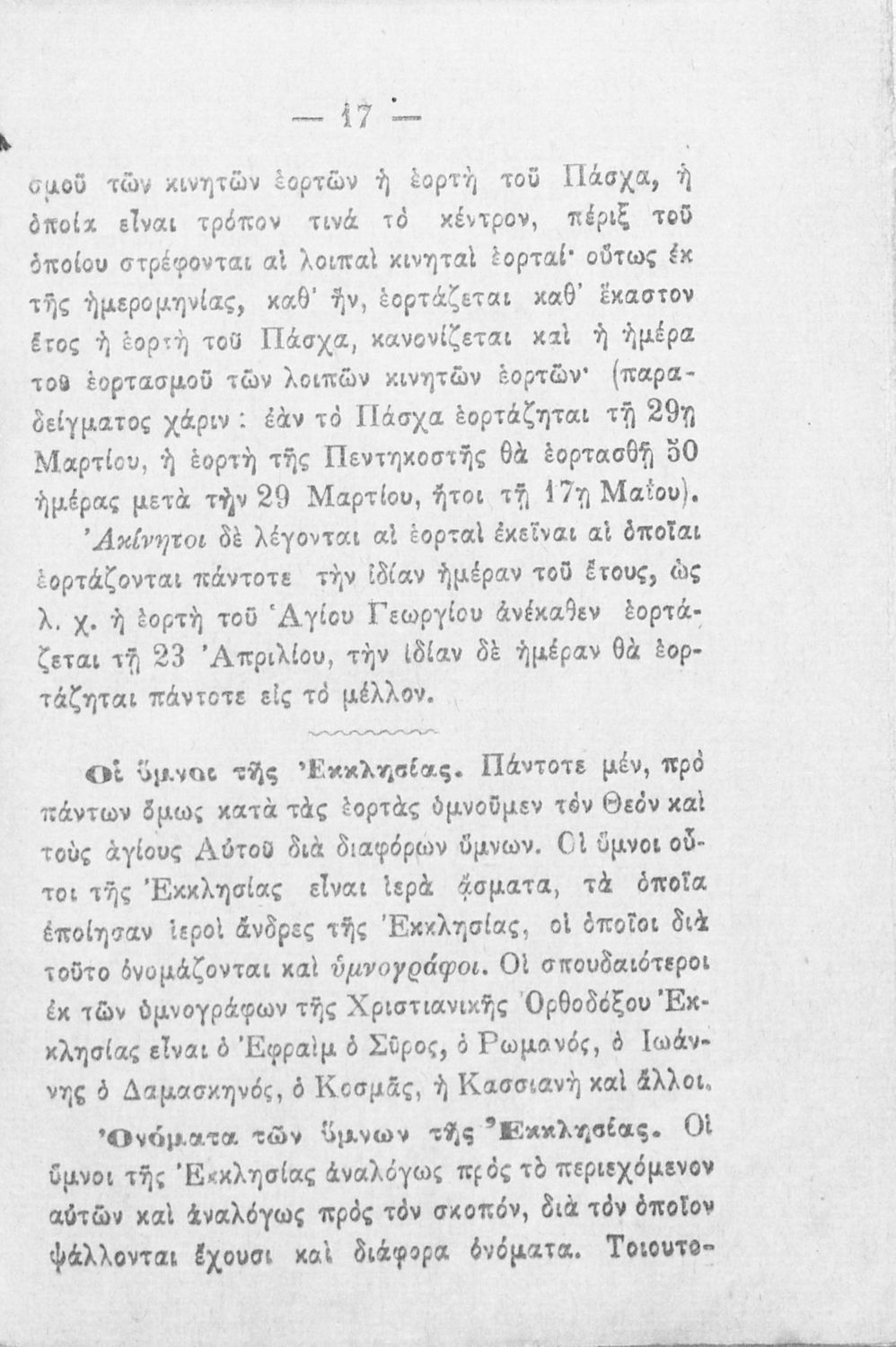 Βαθμίδα εκπαίδευσης: Δευτεροβάθμια Τάξη: Α' Ελληνικού Σχολείου / Παρθεναγωγείο Μάθημα: Θρησκευτικά Γλώσσα: Καθαρεύουσα Παρουσίαση περιεχομένου: Σχολικό εγχειρίδιο Θρησκευτικών για την Α' Ελληνικού Σχολείου και Παρθεναγωγείου που περιέχει τα απολυτίκια των Θεομητορικών εορτών, των επιφανών Αγίων, αναφορές στις εορτές της Εκκλησίας και ερμηνευτικές σημειώσεις. |