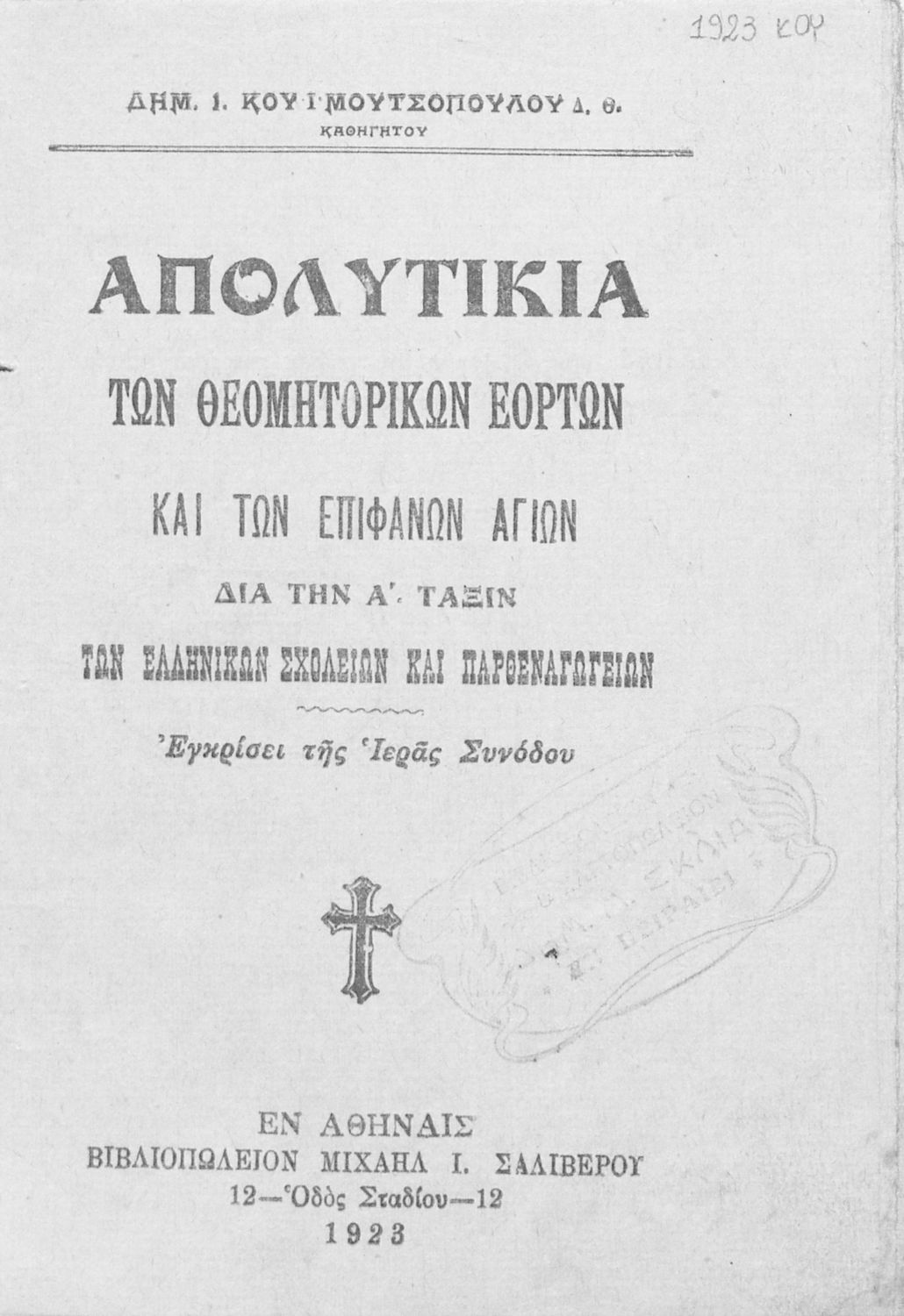 Κωδικός αναγνώρισης: 02-01863 Τίτλος: Απολυτίκια των Θεομητορικών εορτών και των επιφανών Αγίων δια την Α’ τάξιν των Ελληνικών Σχολείων και Παρθεναγωγείων Συγγραφέας: Δ .Ι. Κουϊμουτσόπουλος Μέγεθος και υπόστρωμα: Σχολικό εγχειρίδιο, σκληρό εξώφυλλο, 58 σελίδες. Εικόνες (ασπρόμαυρες). |