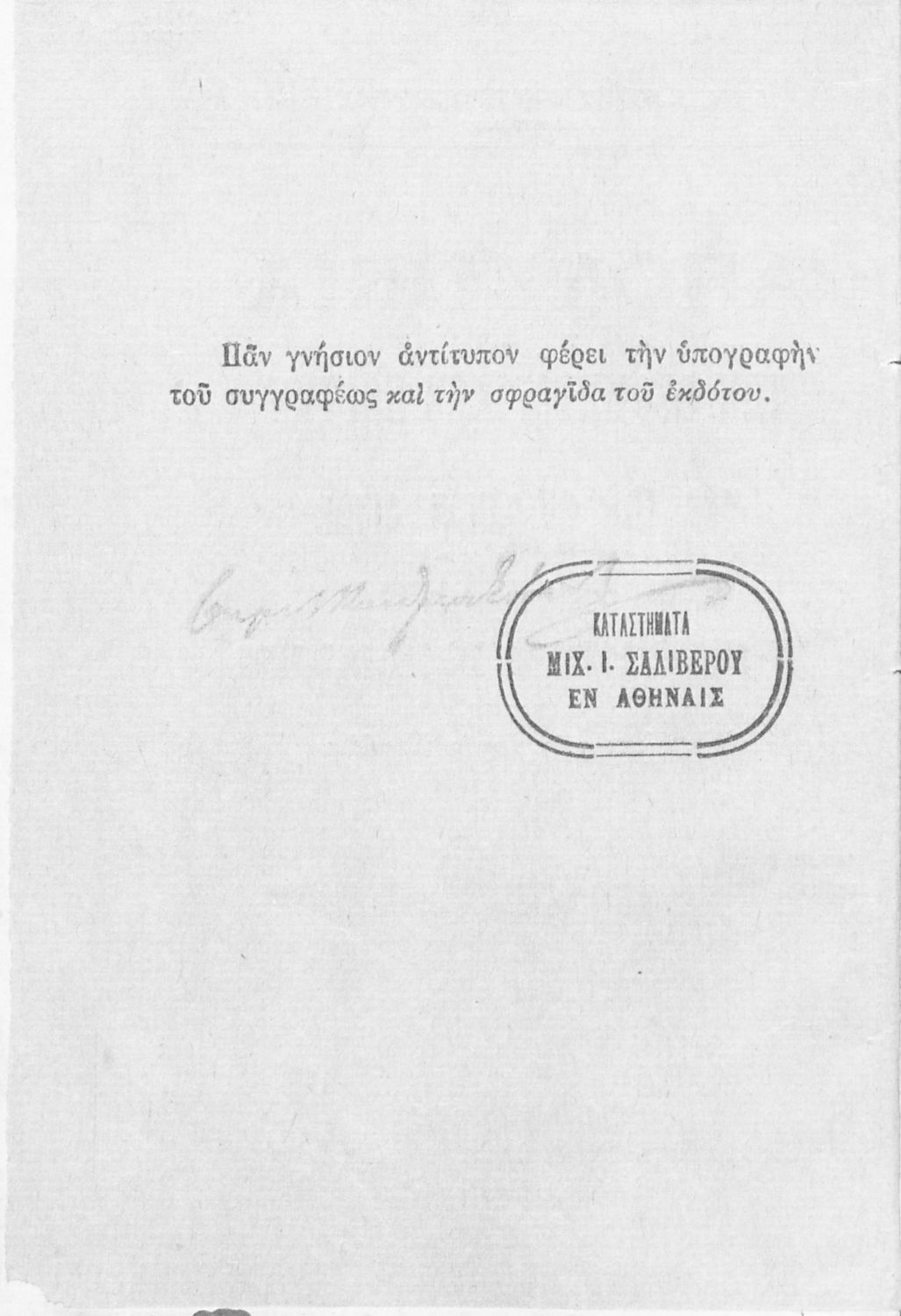 Εκδότης: Μιχαήλ Ι. Σαλίβερος Έτος έκδοσης: 1923 Τόπος έκδοσης: Αθήνα Υπουργική απόφαση / Σύμβαση: 2804/29-11-1919 |