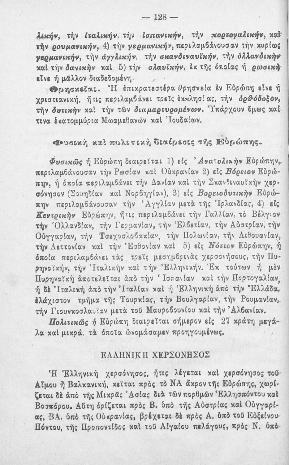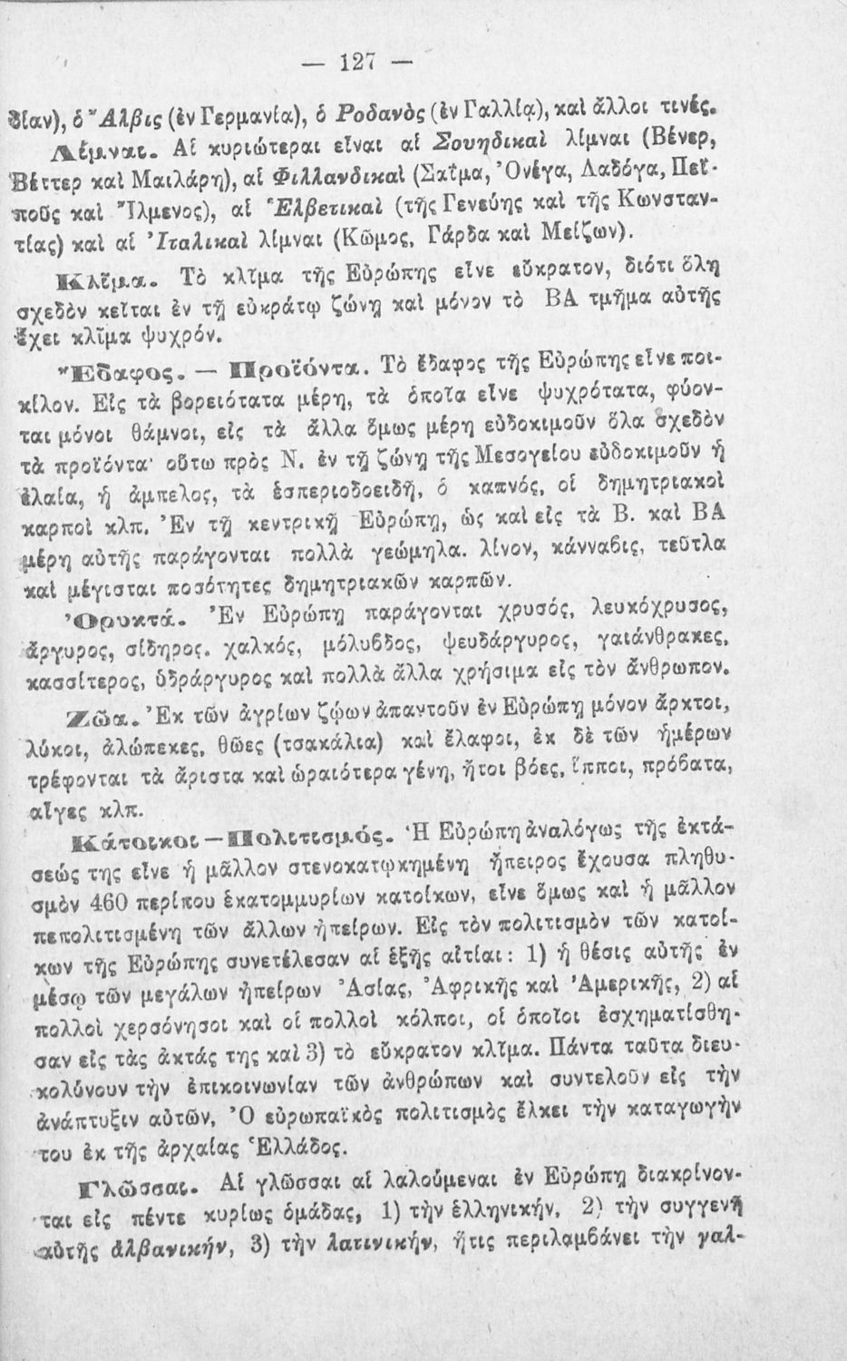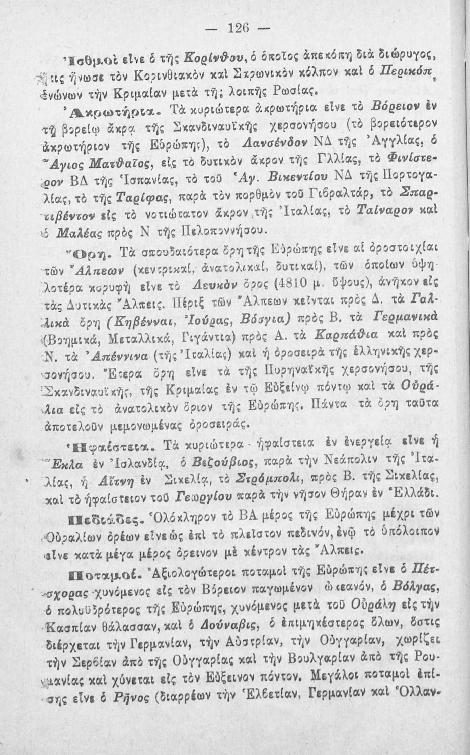 Βαθμίδα εκπαίδευσης: Πρωτοβάθμια Τάξη: Ε' Δημοτικού / ΣΤ' Δημοτικού Μάθημα: Γεωγραφία Γλώσσα: Καθαρεύουσα Παρουσίαση περιεχομένου: Πρόκειται για σχολικό εγχειρίδιο το οποίο προοριζόταν για τη διδασκαλία του μαθήματος της Γεωγραφίας στην Ε΄ και ΣΤ΄ Δημοτικού. Φέρει λίγες προσωπικές σημειώσεις του μαθητή και το εξώφυλλο παρουσιάζεται αρκετά φθαρμένο. |