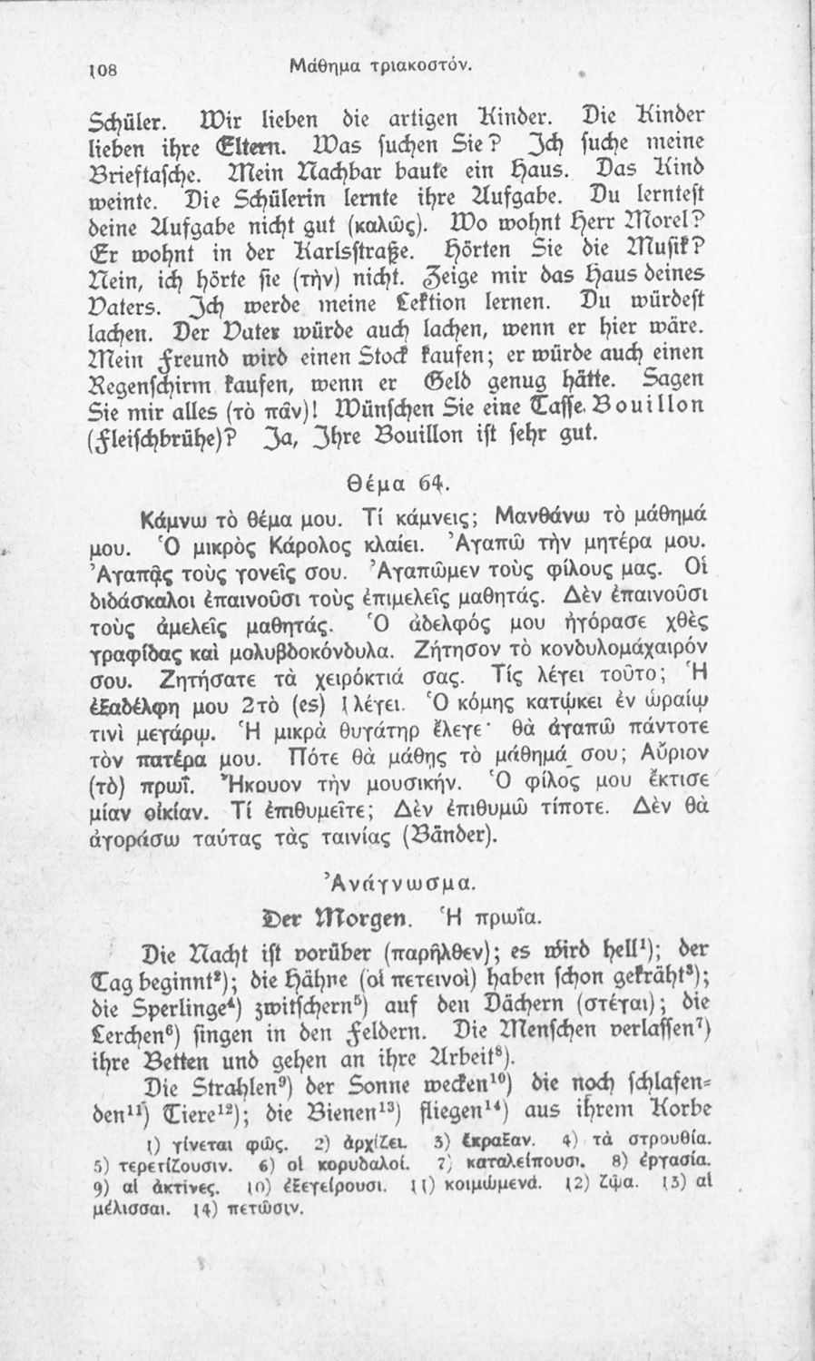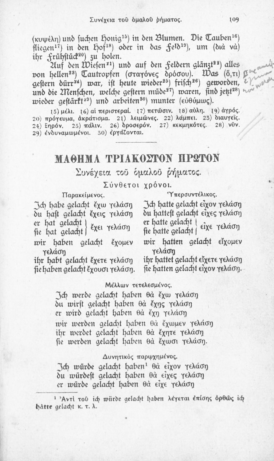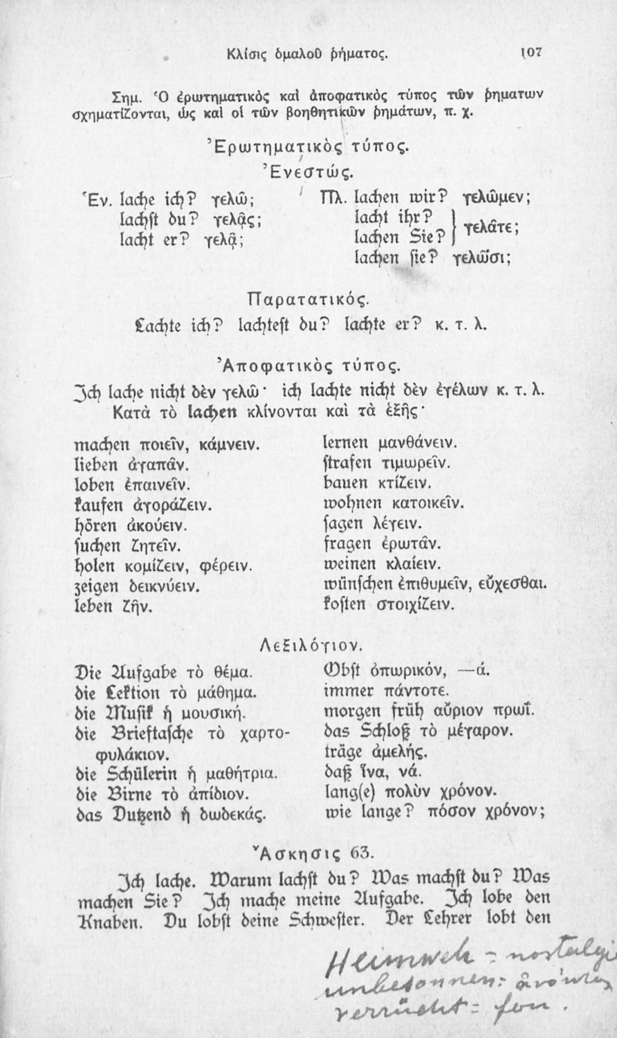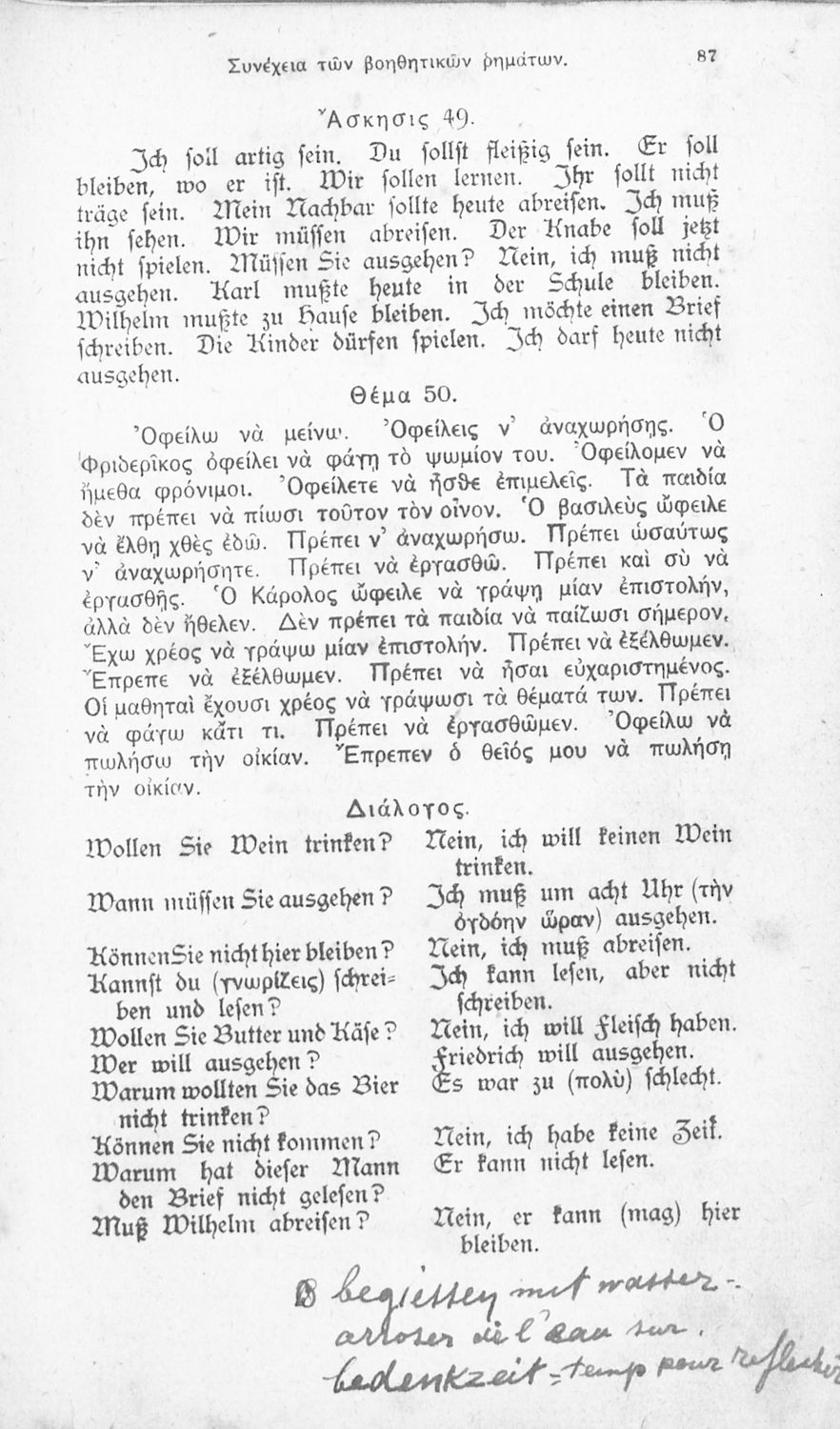 Πρόκειται για εγχειρίδιο που στόχο είχε την εκμάθηση των γραμματικών και συντακτικών φαινομένων της Γερμανικής γλώσσας με στόχο την ταχεία εκμάθησή της από Ελληνικό πληθυσμό. Φέρει λίγες προσωπικές σημειώσεις ...