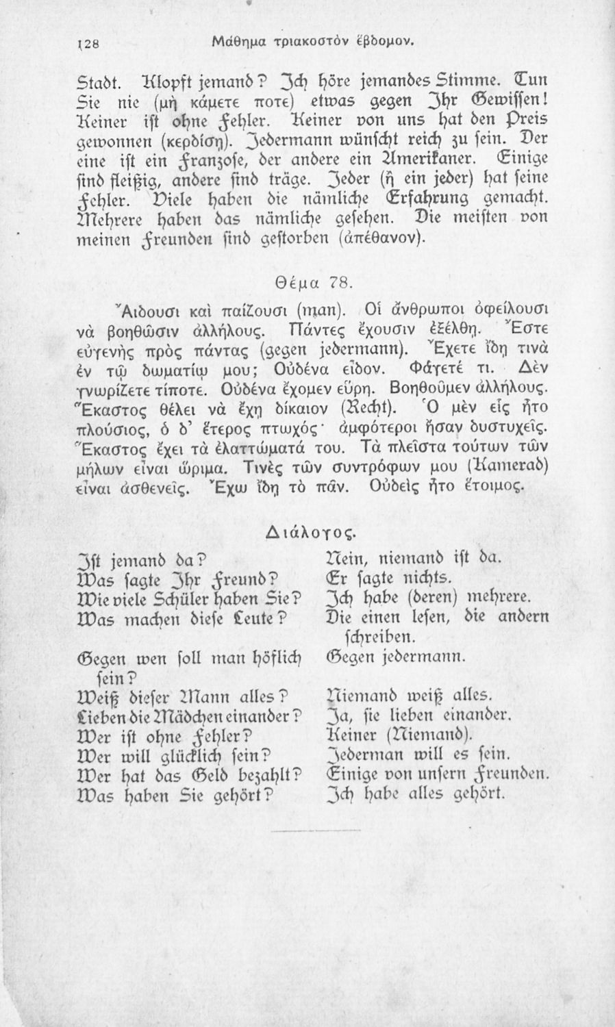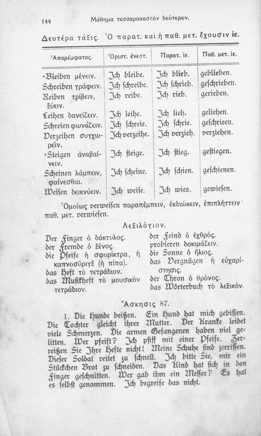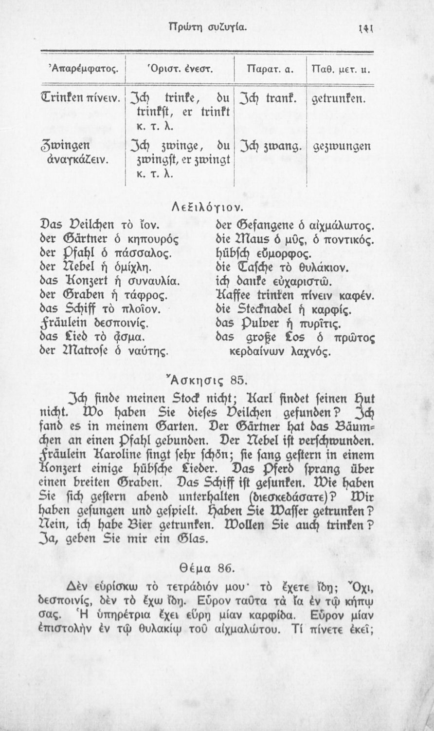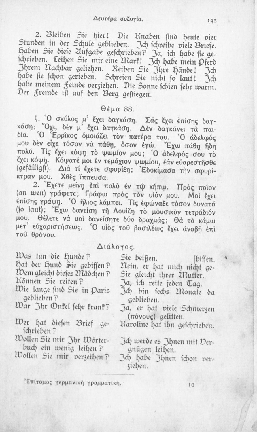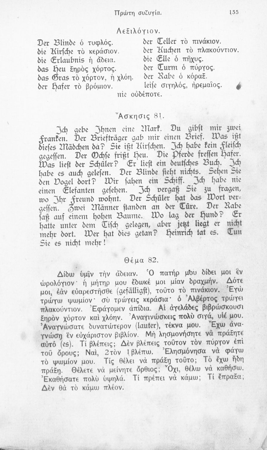 Πρόκειται για εγχειρίδιο που στόχο είχε την εκμάθηση των γραμματικών και συντακτικών φαινομένων της Γερμανικής γλώσσας με στόχο την ταχεία εκμάθησή της από Ελληνικό πληθυσμό. Φέρει λίγες προσωπικές σημειώσεις ...