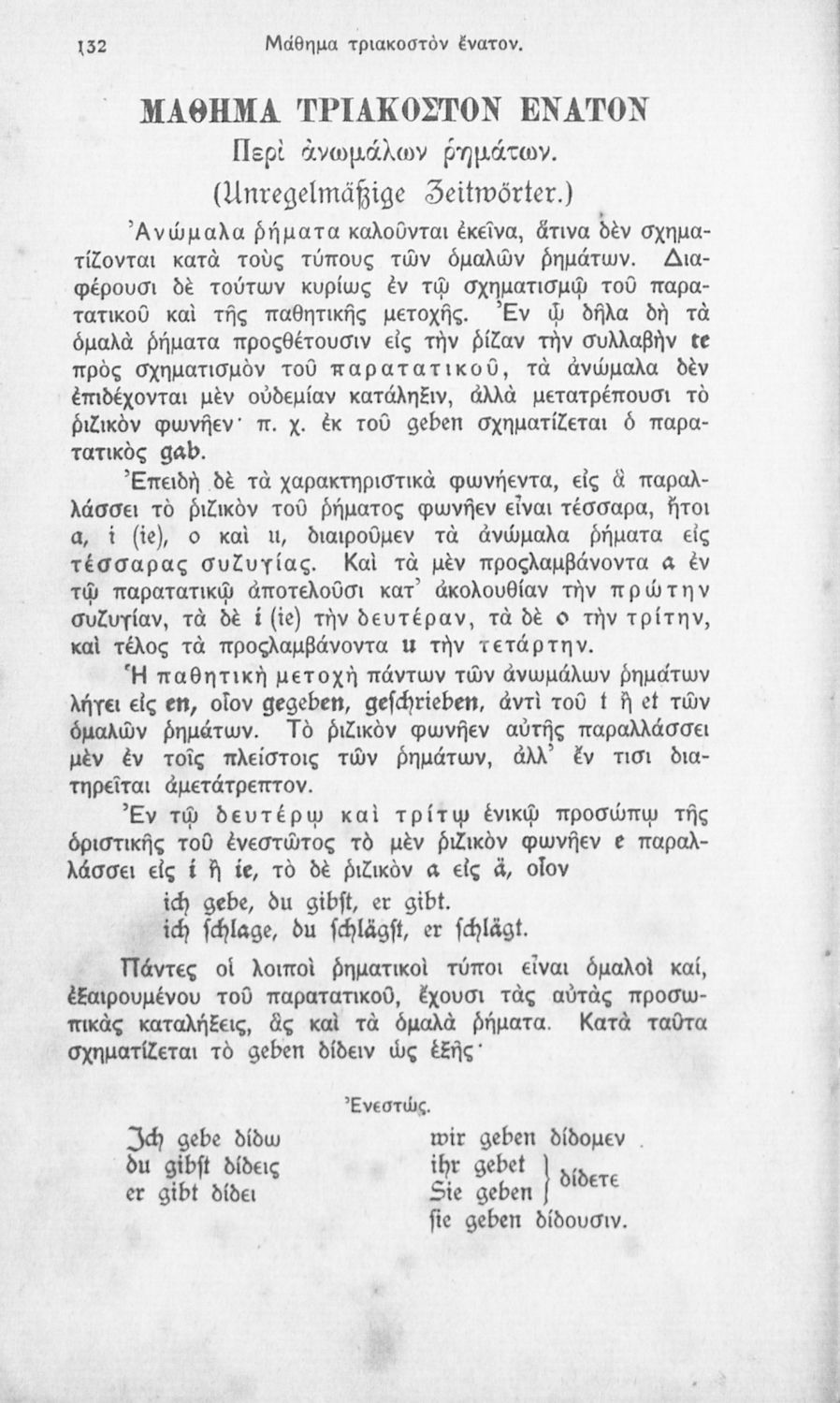 Σχολικό εγχειρίδιο Γ΄ και Δ΄ Δημοτικού που περιέχει τη γραμματικής της νέας ελληνικής. Την έκδοση επιμελήθηκε ο Γ. Λογοθέτης, τέως διευθυντής του επταταξίου δημ. Τμήμ.της Ευαγγελικής Σχολής.