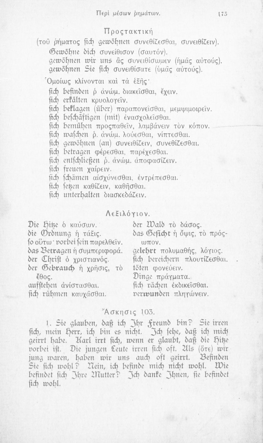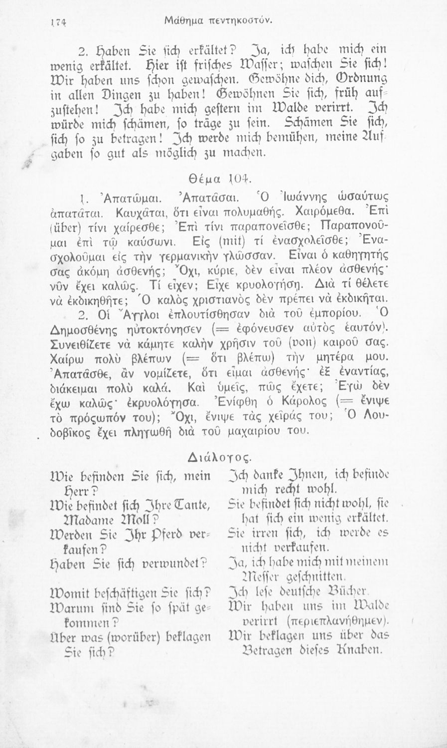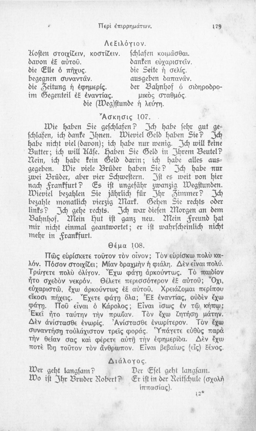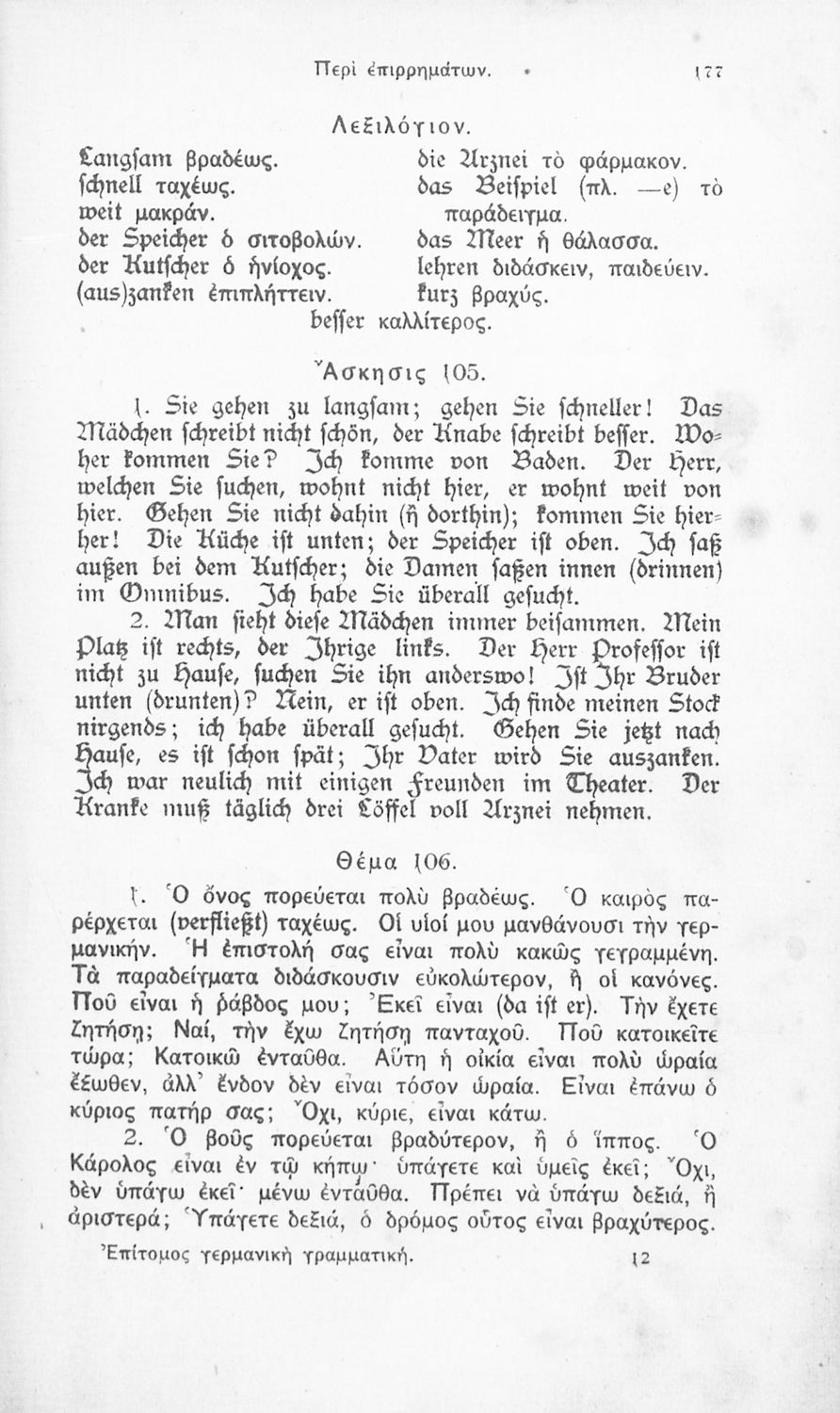Πρόκειται για εγχειρίδιο που στόχο είχε την εκμάθηση των γραμματικών και συντακτικών φαινομένων της Γερμανικής γλώσσας με στόχο την ταχεία εκμάθησή της από Ελληνικό πληθυσμό. Φέρει λίγες προσωπικές σημειώσεις ...