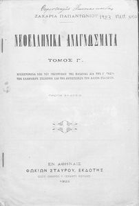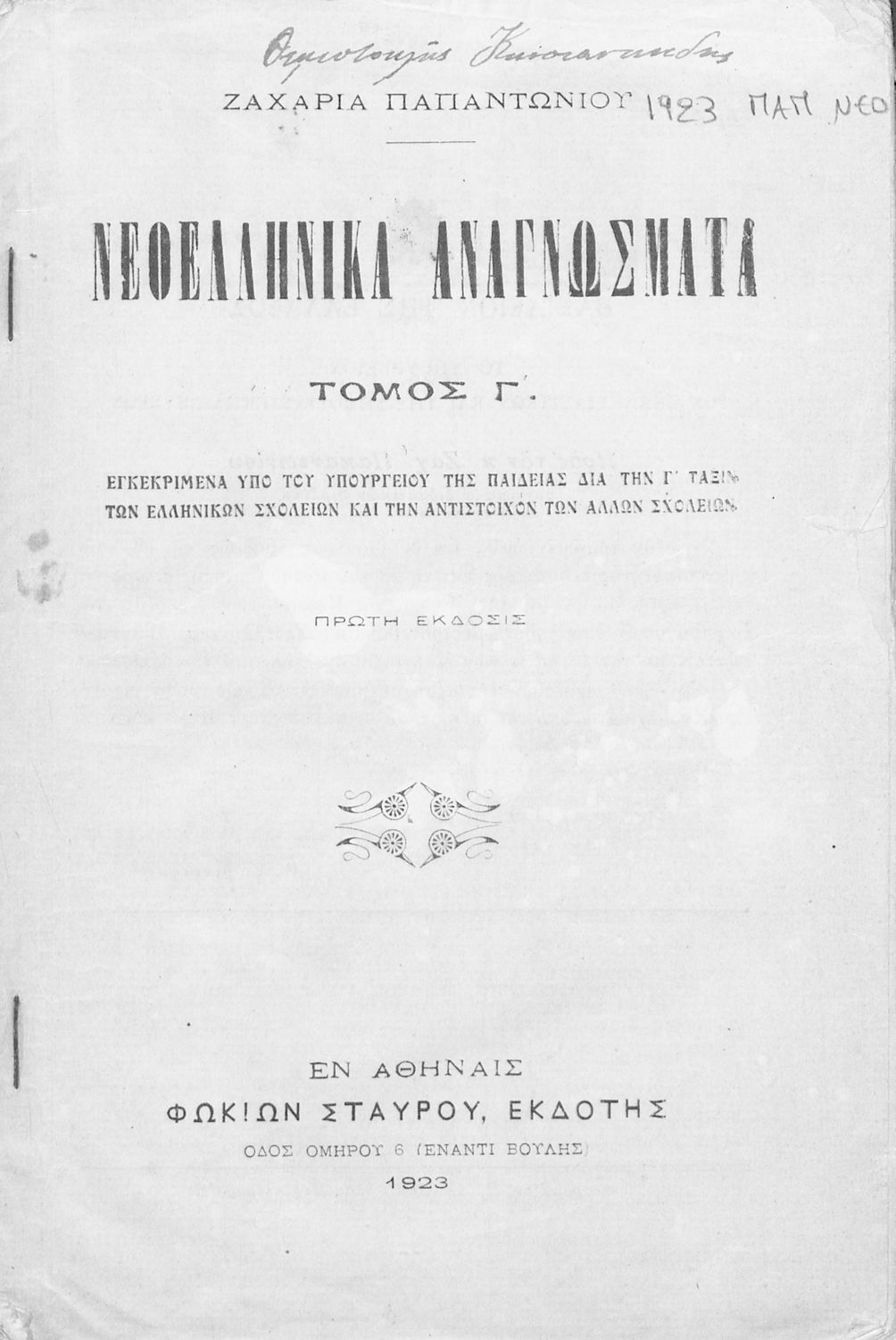 Εντοπισμός πρωτοτύπου: Ελληνικό Λογοτεχνικό και Ιστορικό Αρχείο Κωδικός βιβλιοθήκης: 1923 ΠΑΠ ΝΕΟ |