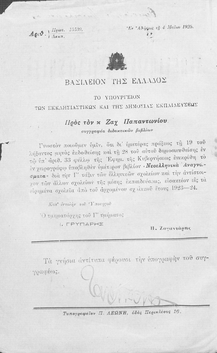 Εκδότης: Φωκίων Σταύρου Έτος έκδοσης: 1923 Τόπος έκδοσης: Αθήνα Έκδοση: 1η Υπουργική απόφαση / Σύμβαση: 15530/4-5-1923 |