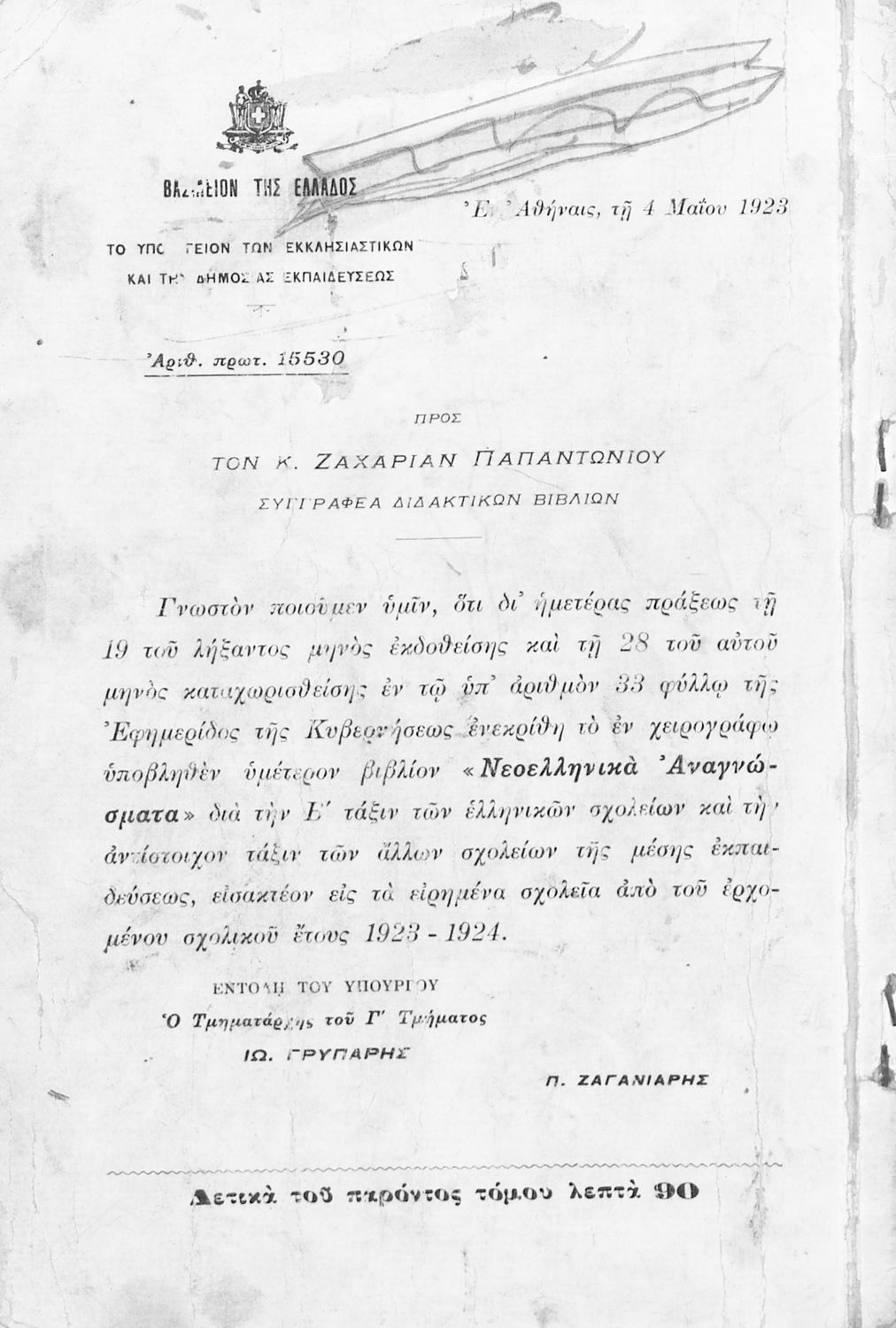 Εκδότης: Φωκίων Σταύρου Έτος έκδοσης: 1923 Τόπος έκδοσης: Αθήνα Έκδοση: 1η Υπουργική απόφαση / Σύμβαση: 15530/4-5-1923 |