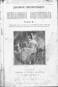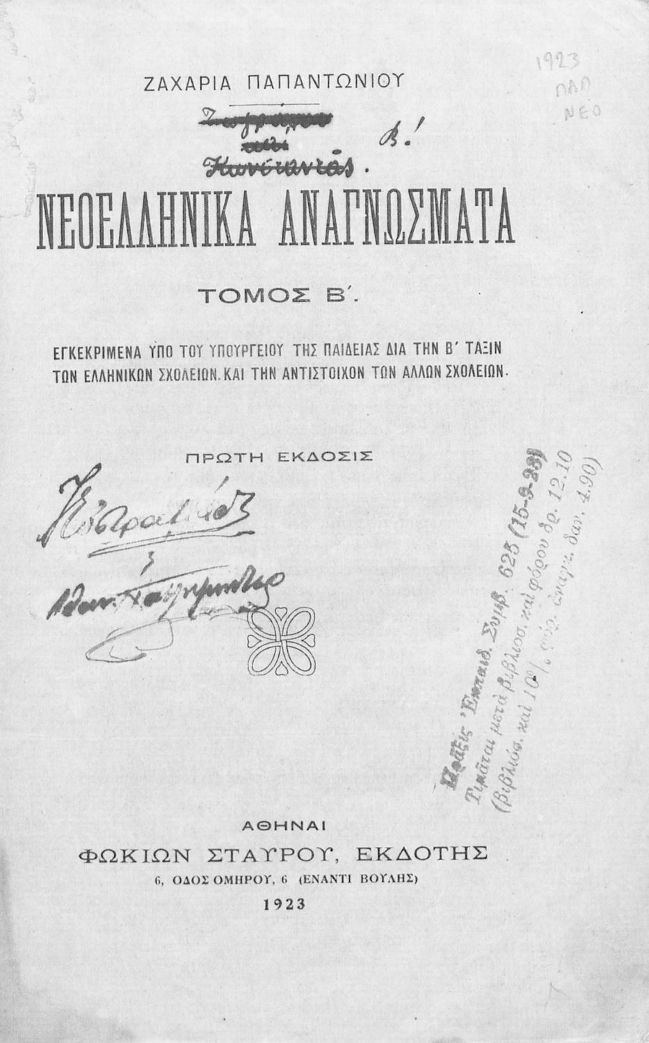 Εντοπισμός πρωτοτύπου: Ελληνικό Λογοτεχνικό και Ιστορικό Αρχείο Κωδικός βιβλιοθήκης: 1923 ΠΑΠ ΝΕΟ |