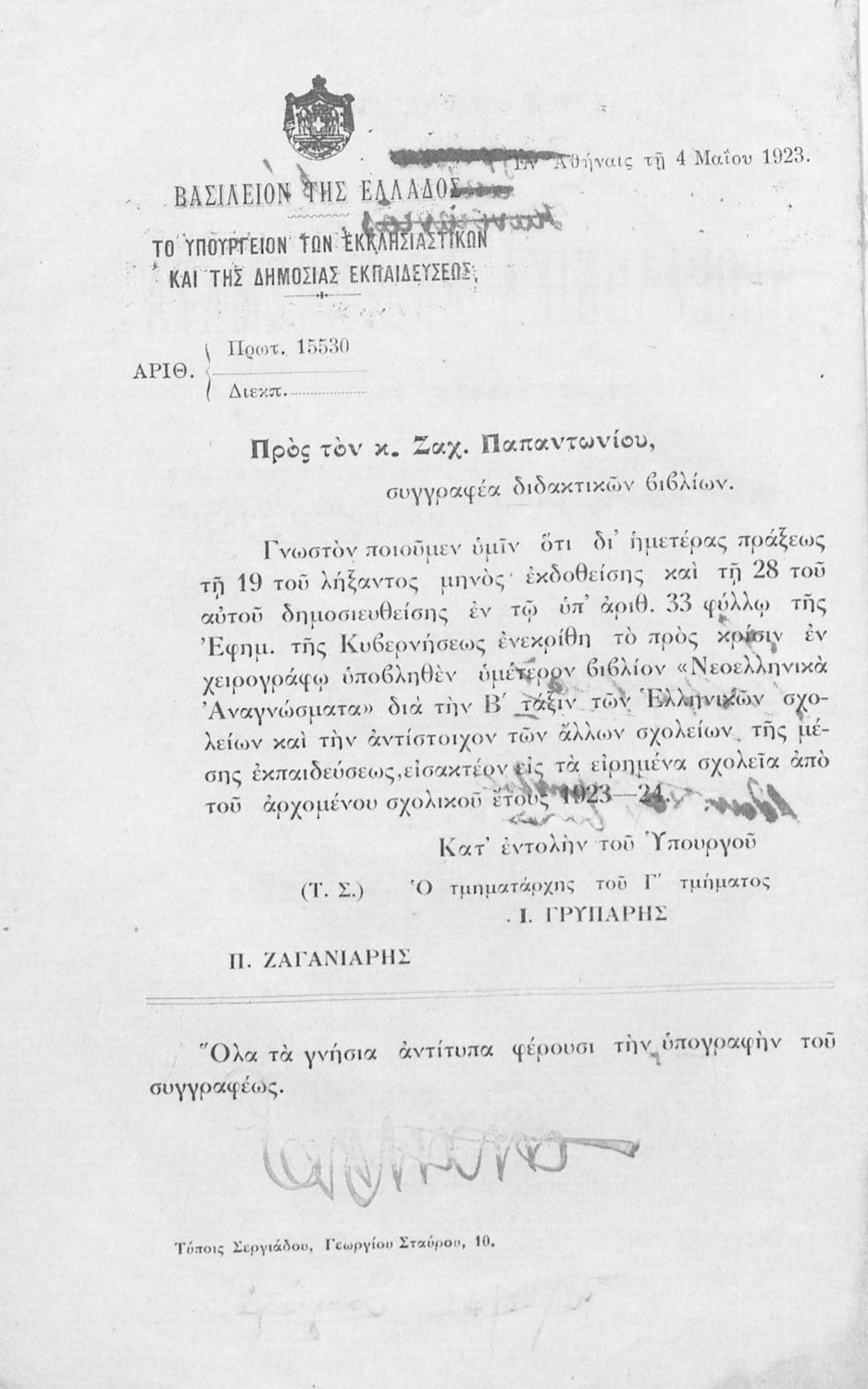 Εκδότης: Φωκίων Σταύρου Έτος έκδοσης: 1923 Τόπος έκδοσης: Αθήνα Έκδοση: 1η Υπουργική απόφαση / Σύμβαση: 15530/4-5-1923 |