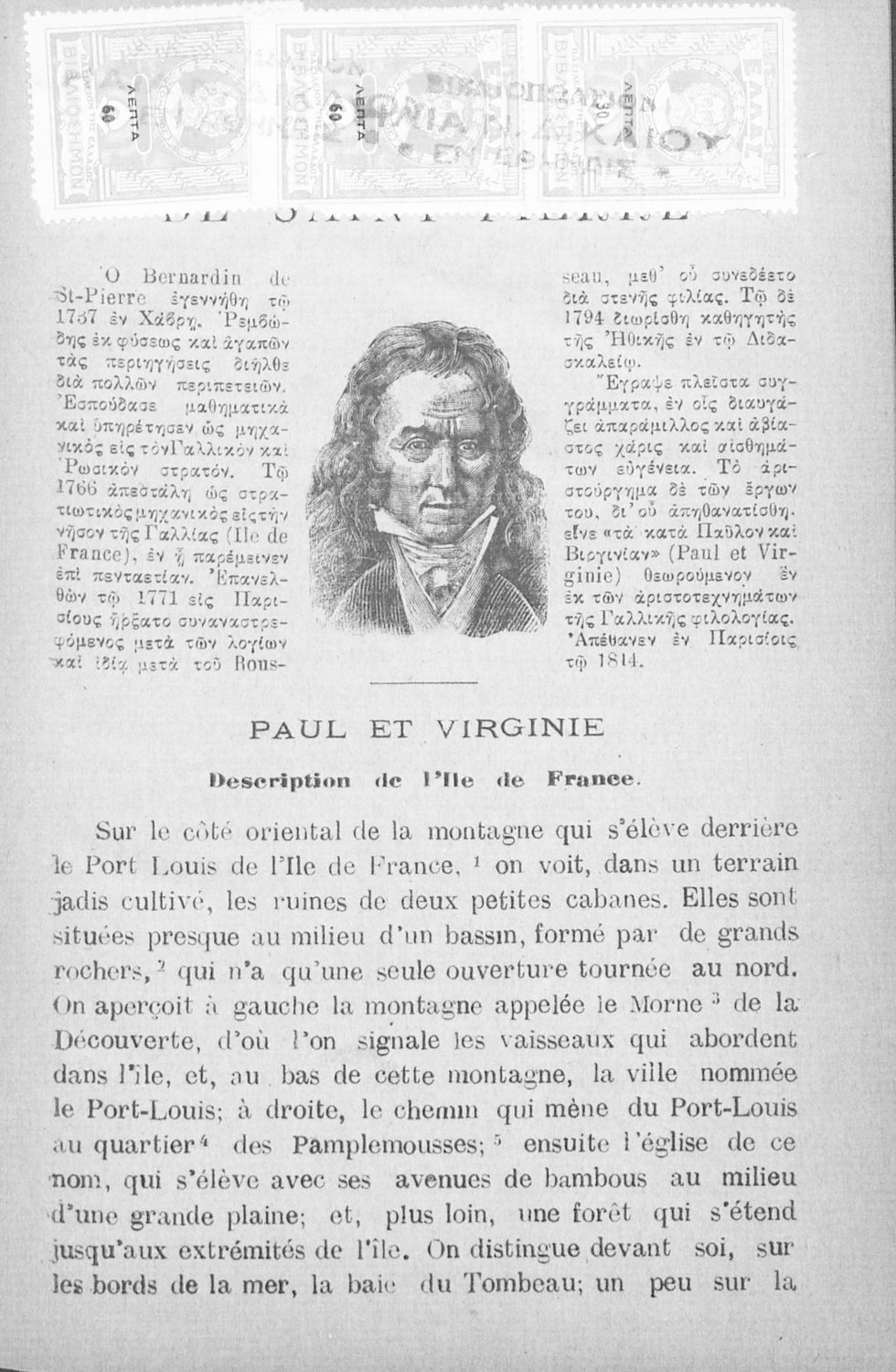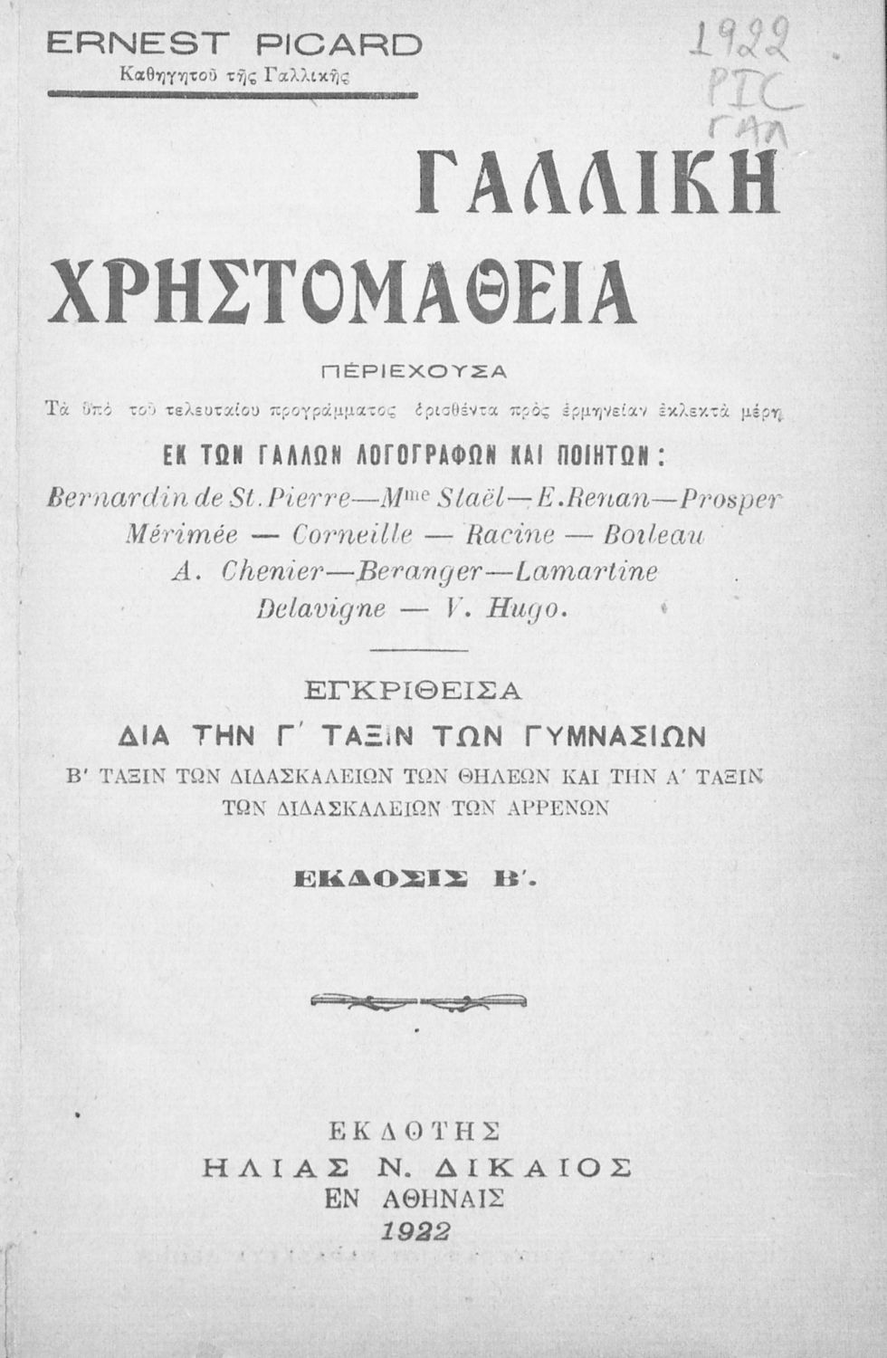 Σχολικό εγχειρίδιο Γαλλικών για τις Γ΄ Γυμνάσιου, Β΄ Διδασκαλείου Θηλέων και Α' Διδασκαλείου Αρρένων που περιέχει αποσπάσματα έργων Γάλλων συγγραφέων, και γλωσσικά και ερμηνευτικά σχόλια.