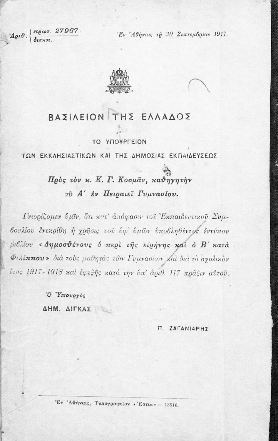 Υπουργική απόφαση / Σύμβαση: 27967/30-9-1917
