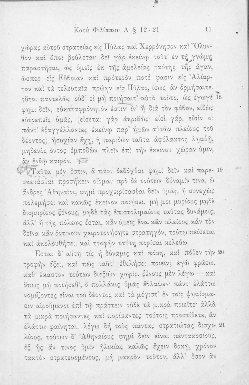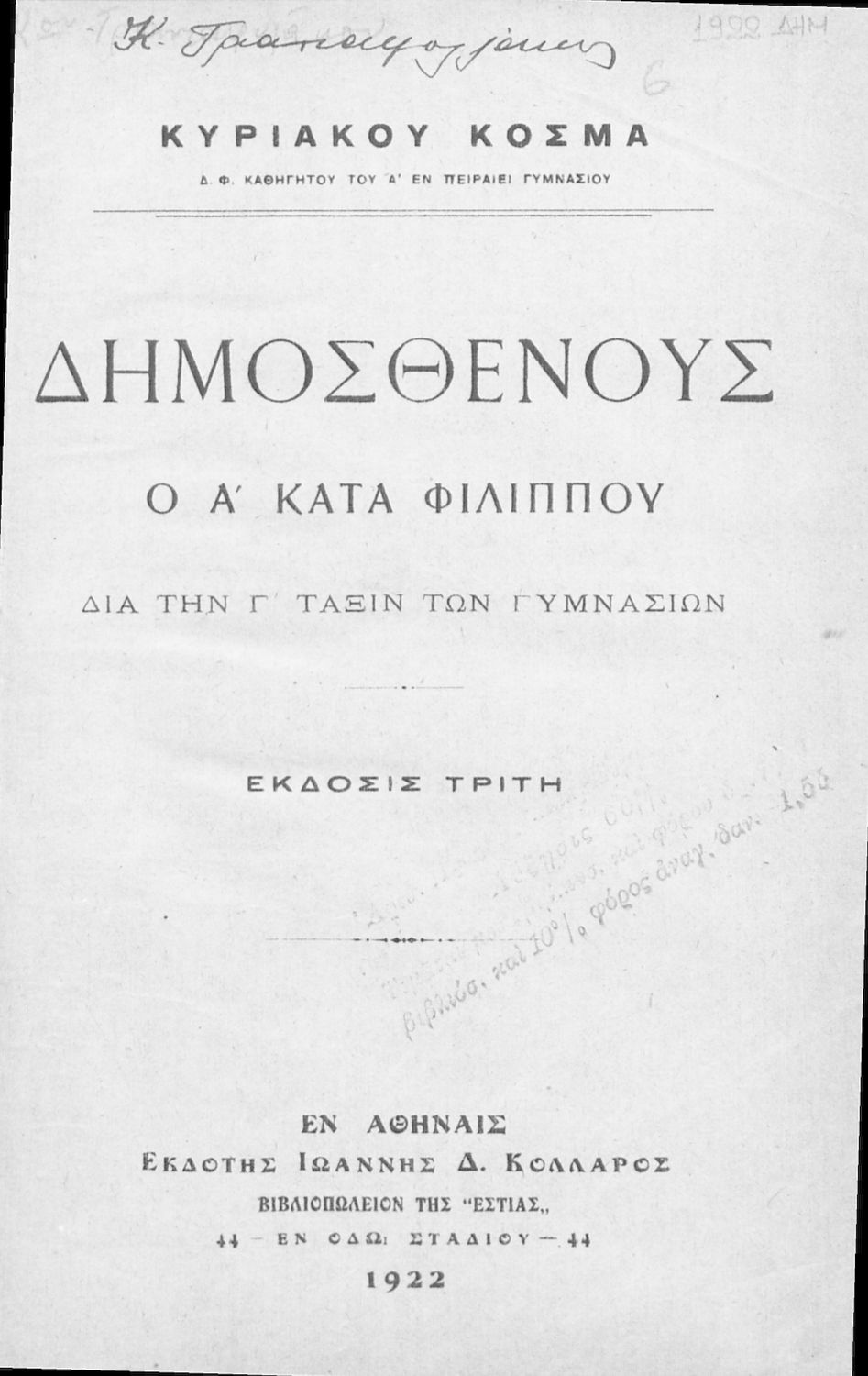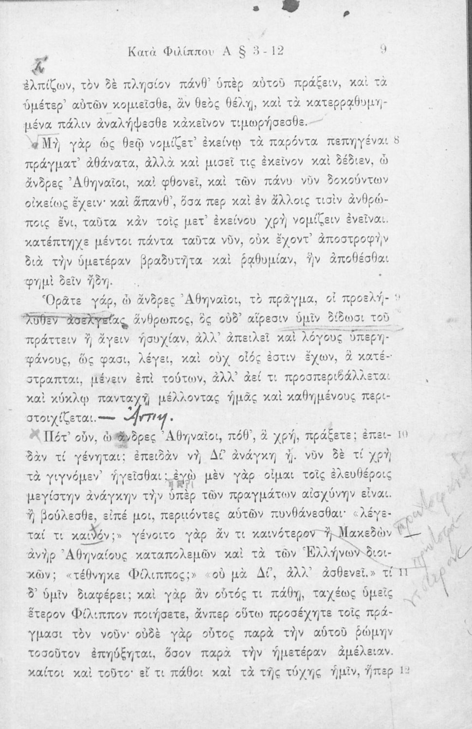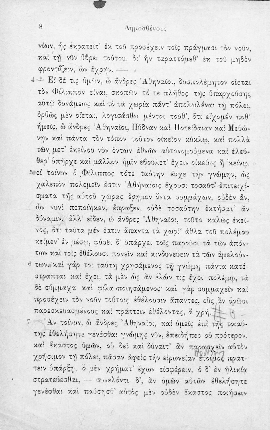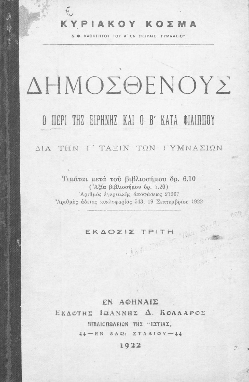 Σχολικό εγχειρίδιο Αρχαίων Ελληνικών Γ΄ Γυμνασίου που περιλαμβάνει τον Λόγο του Δημοσθένη Α΄ κατά Φιλίππου, εισαγωγικά σχόλια στο έργο και τη ζωή του, ερμηνευτικά και γραμματικά σχόλια και παρατηρήσεις.