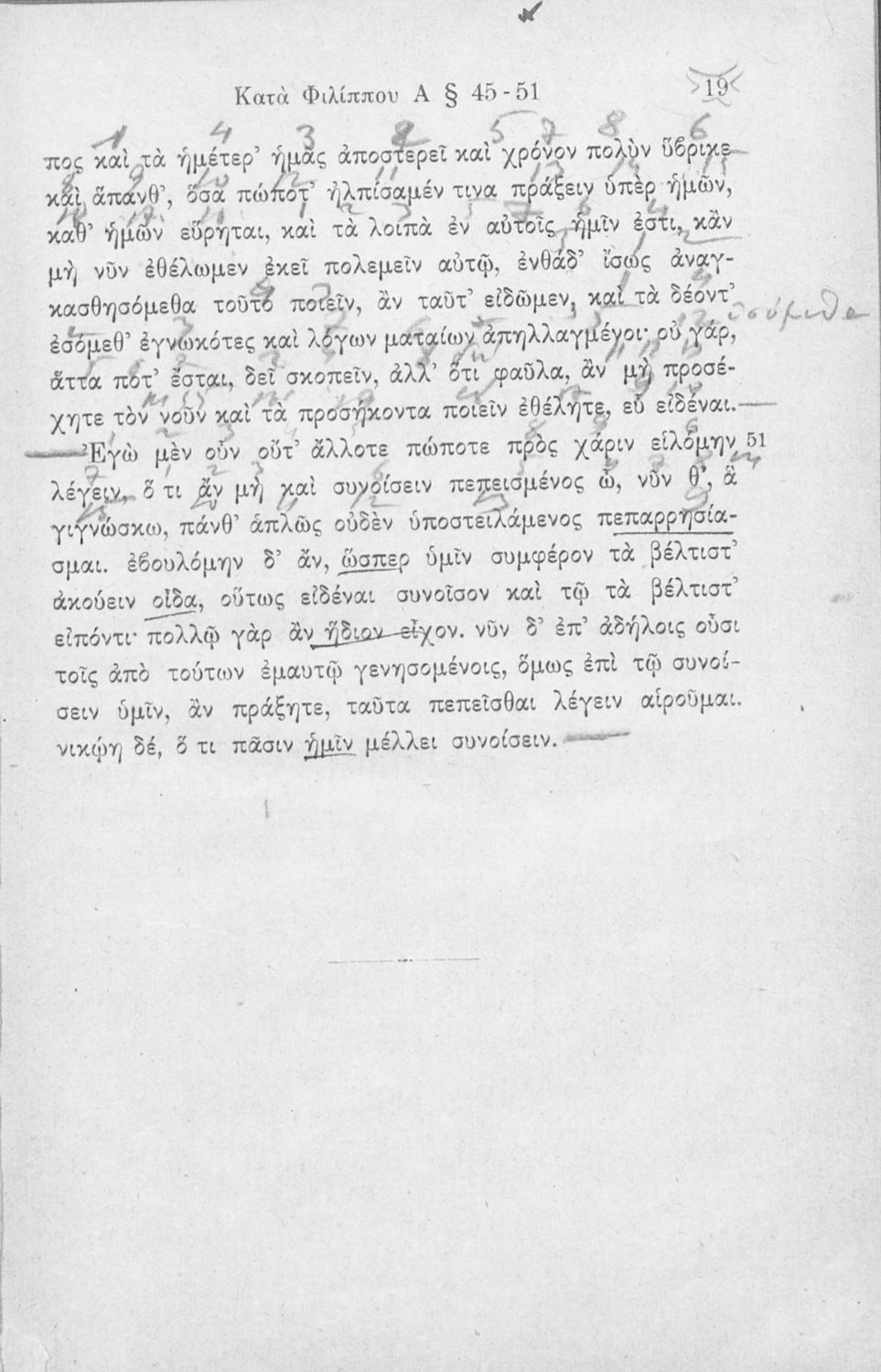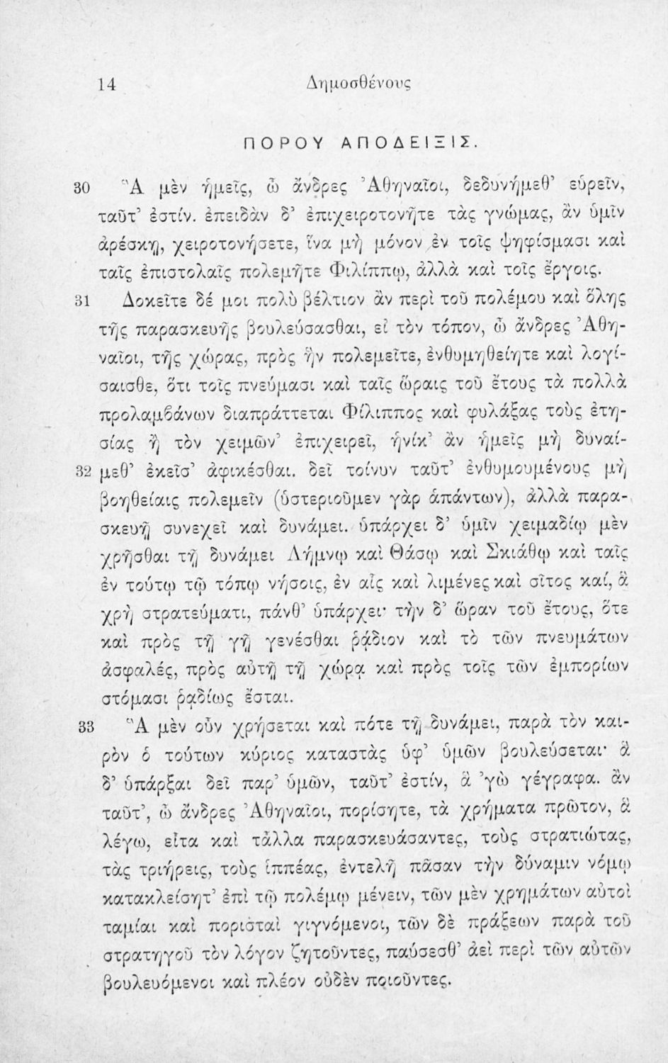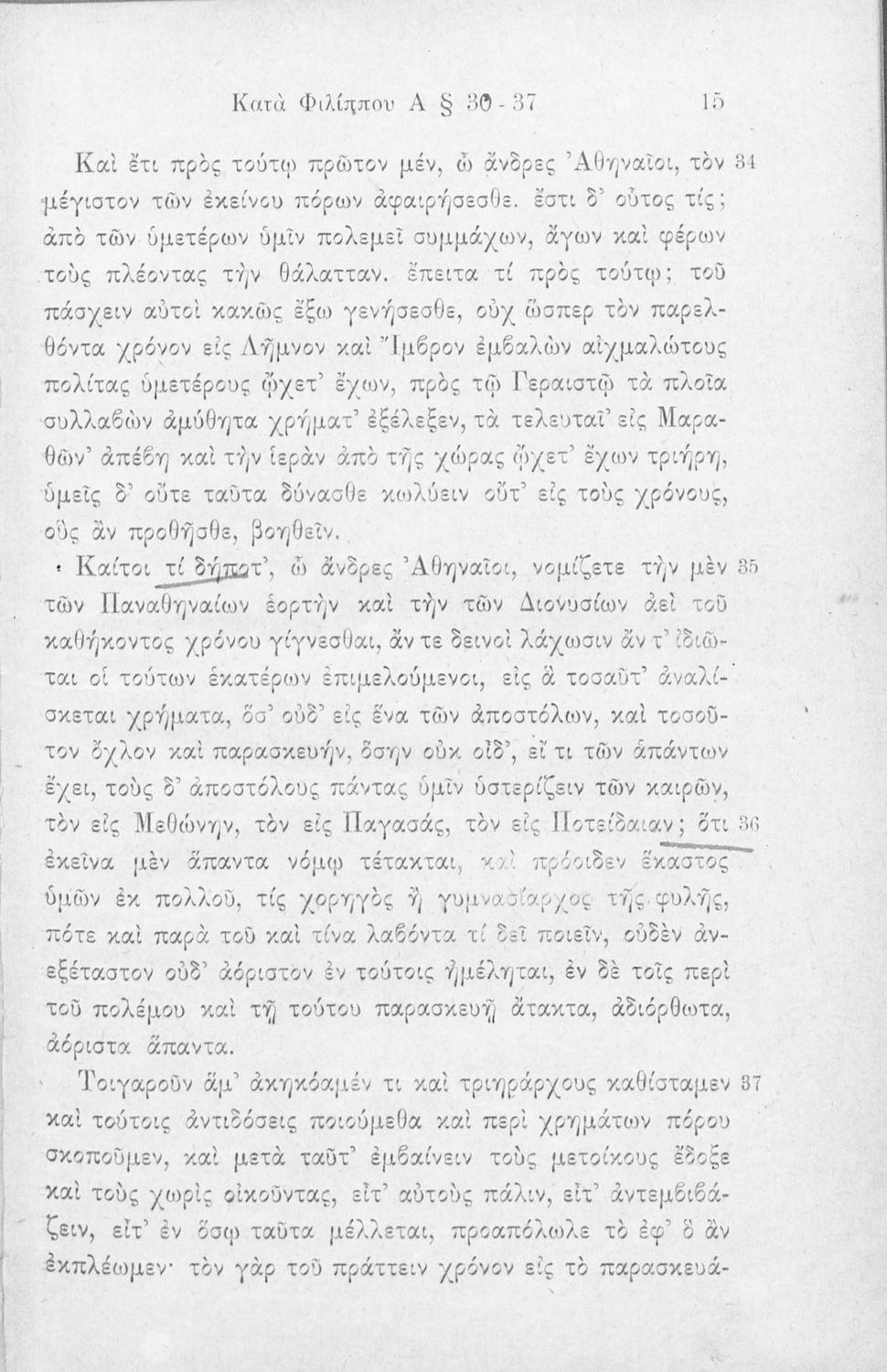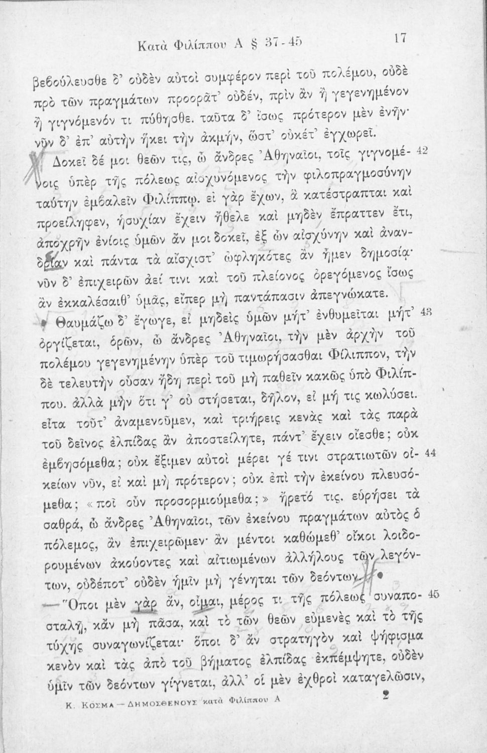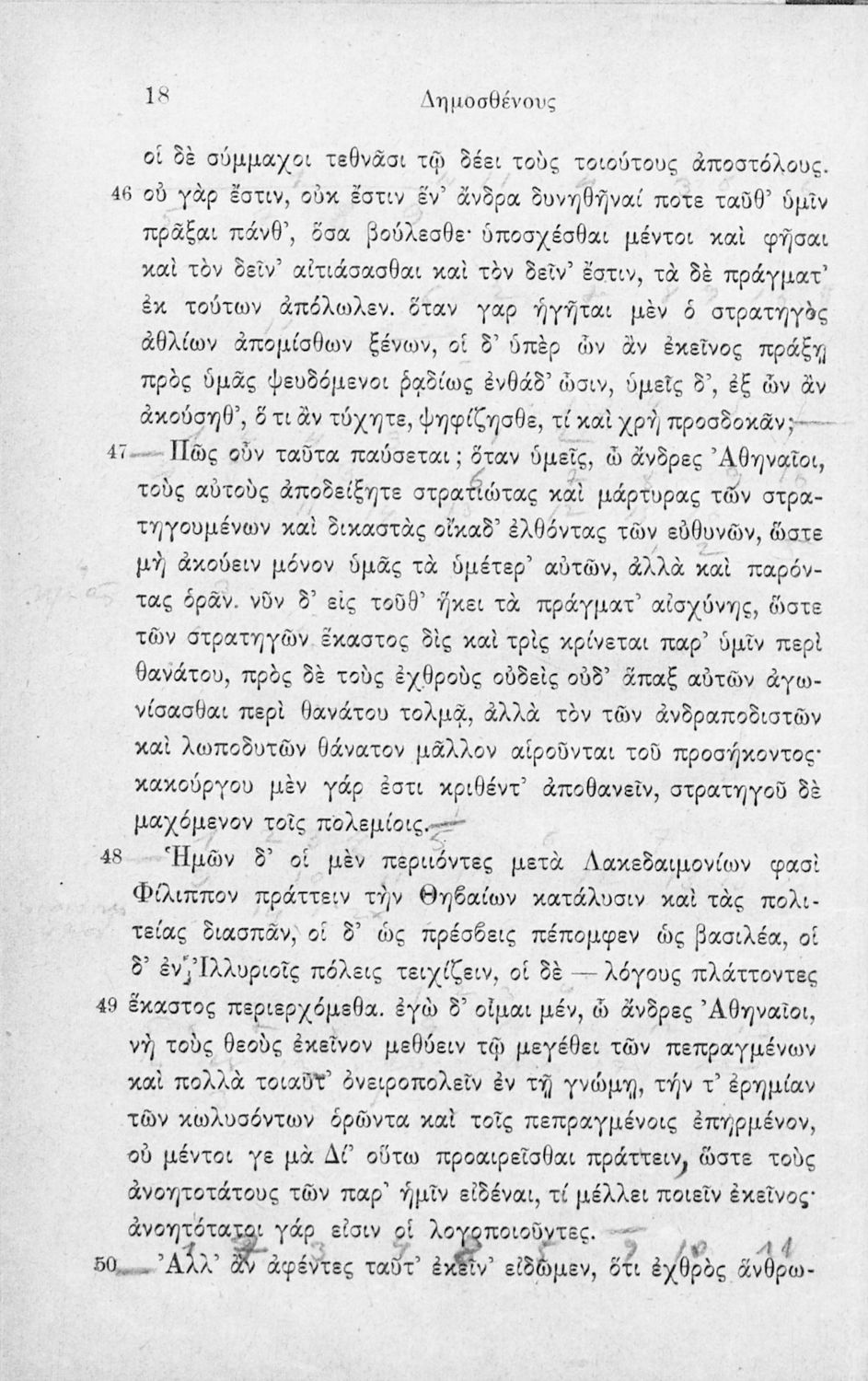Σχολικό εγχειρίδιο Αρχαίων Ελληνικών Γ΄ Γυμνασίου που περιλαμβάνει τον Λόγο του Δημοσθένη Α΄ κατά Φιλίππου, εισαγωγικά σχόλια στο έργο και τη ζωή του, ερμηνευτικά και γραμματικά σχόλια και παρατηρήσεις.