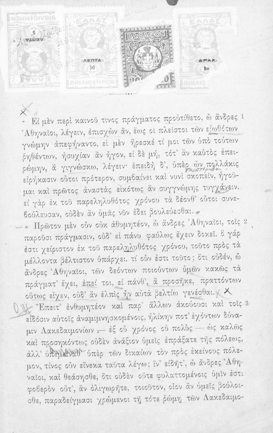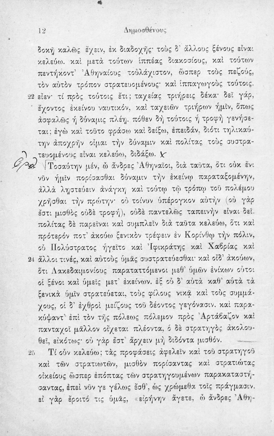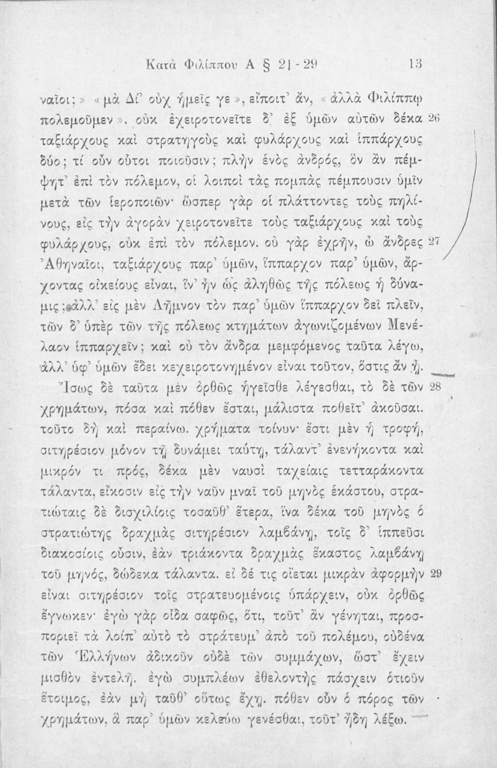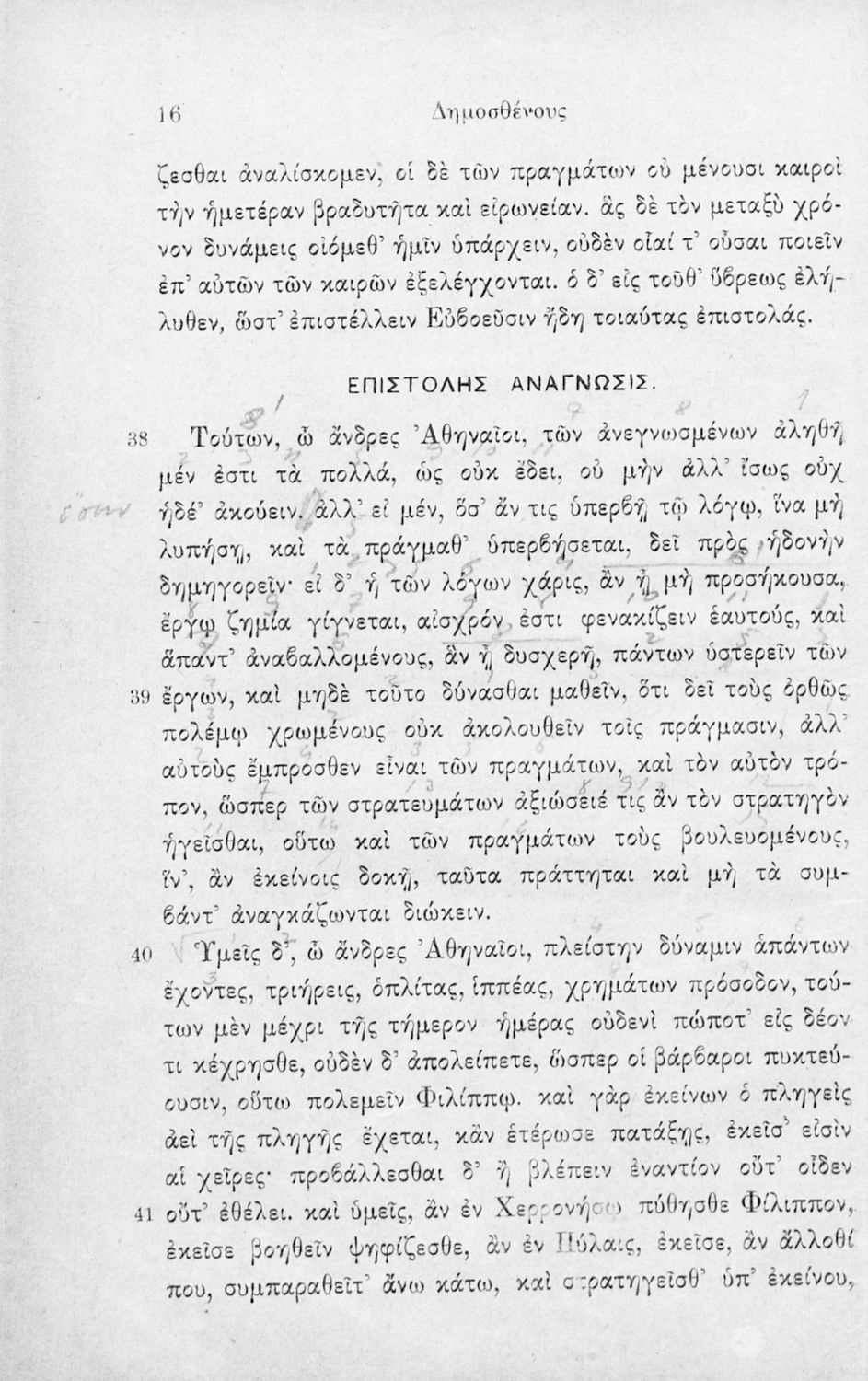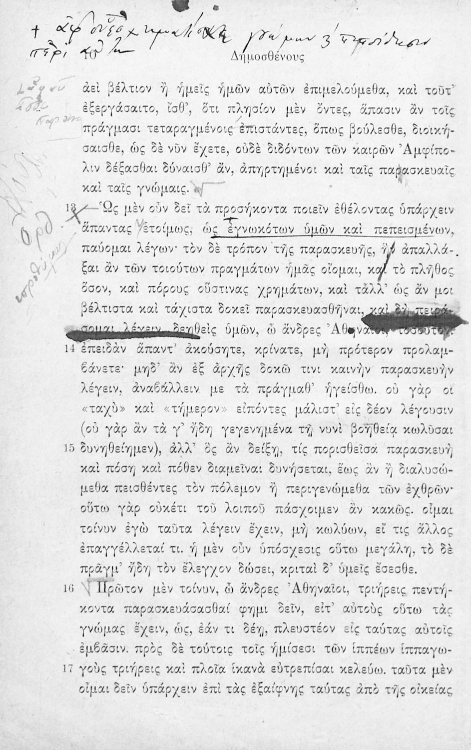 Σχολικό εγχειρίδιο Αρχαίων Ελληνικών Γ΄ Γυμνασίου που περιλαμβάνει τον Λόγο του Δημοσθένη Α΄ κατά Φιλίππου, εισαγωγικά σχόλια στο έργο και τη ζωή του, ερμηνευτικά και γραμματικά σχόλια και παρατηρήσεις.