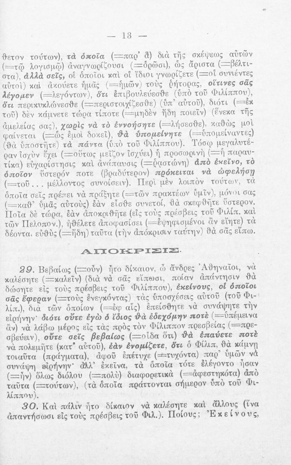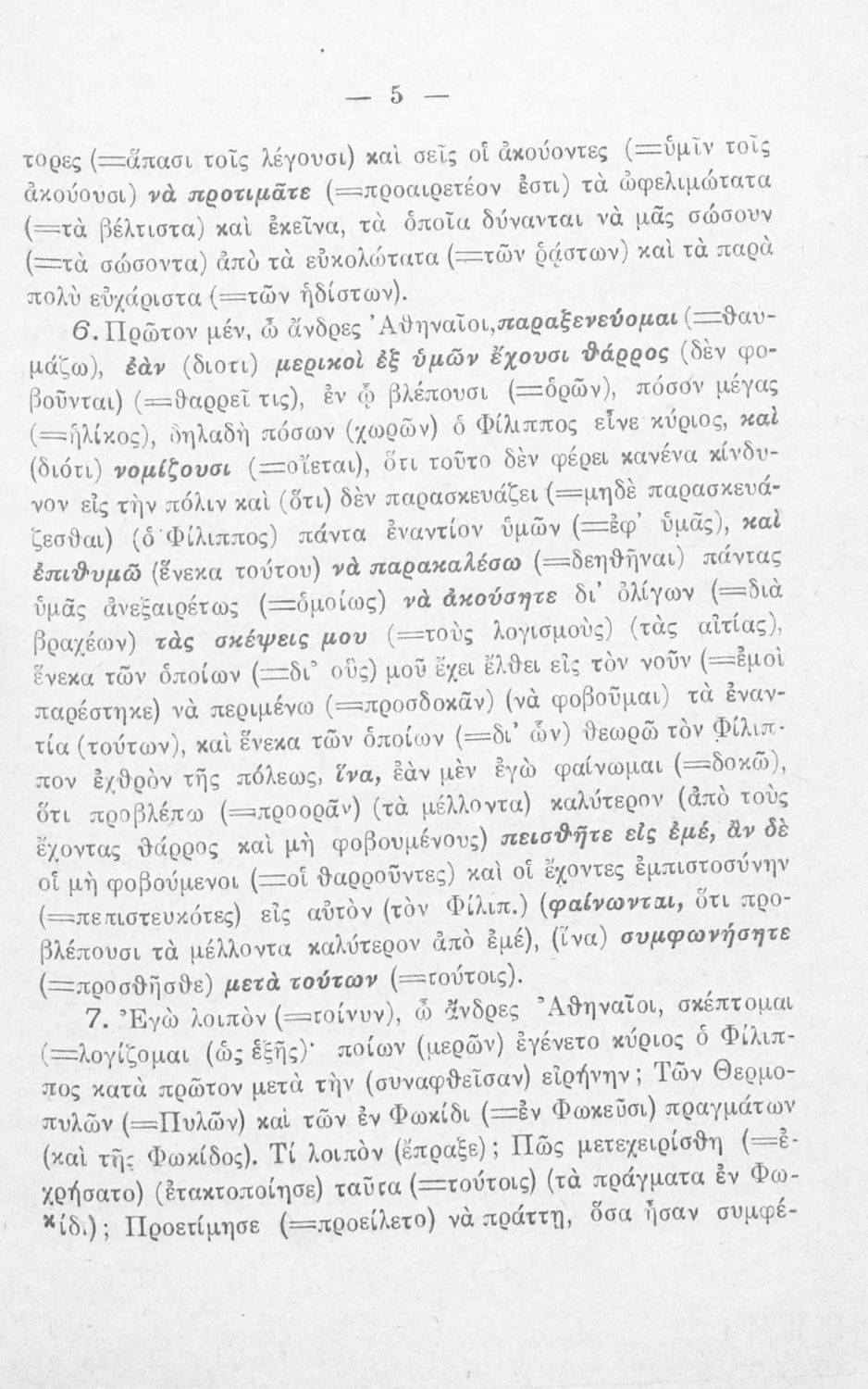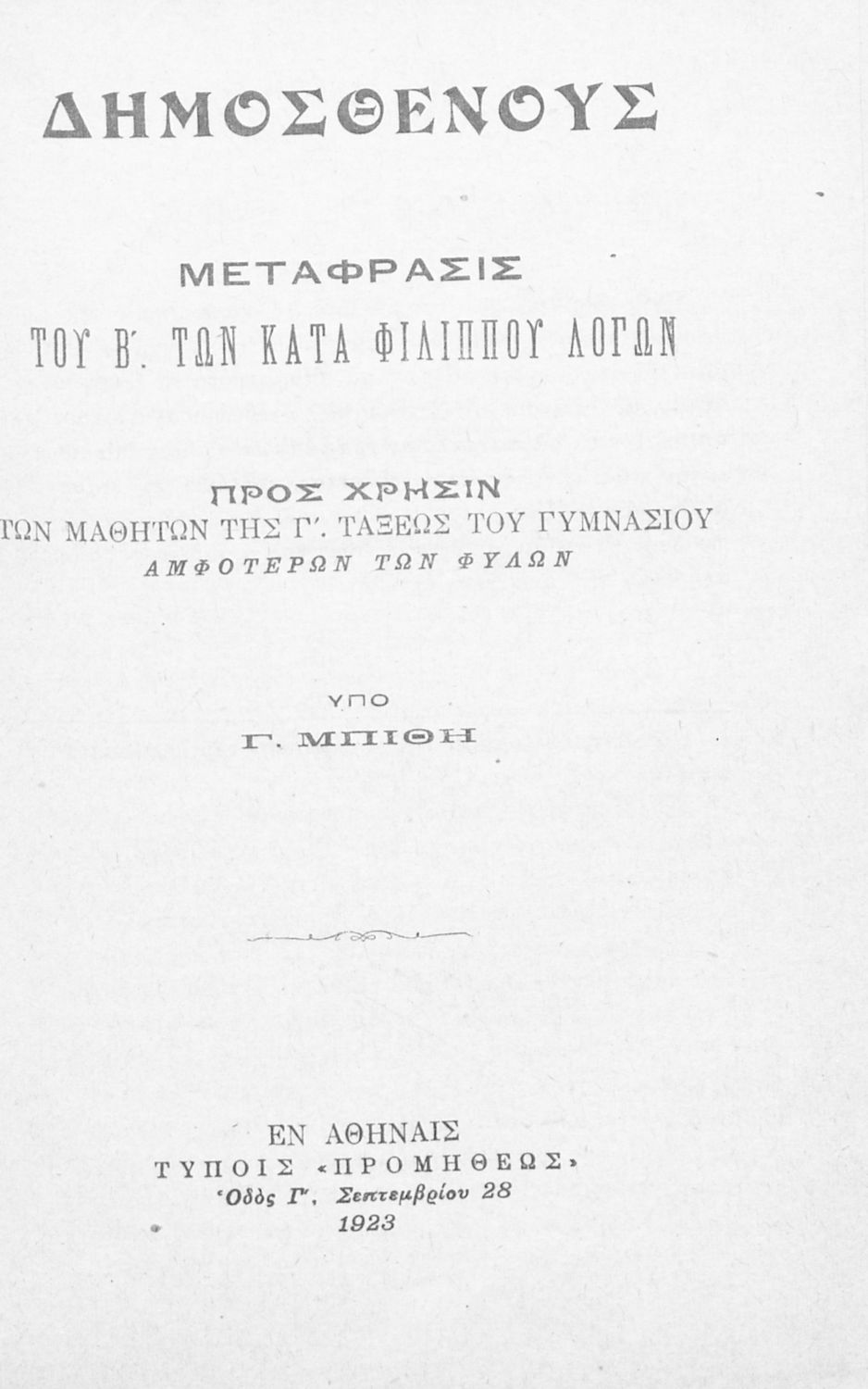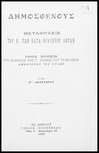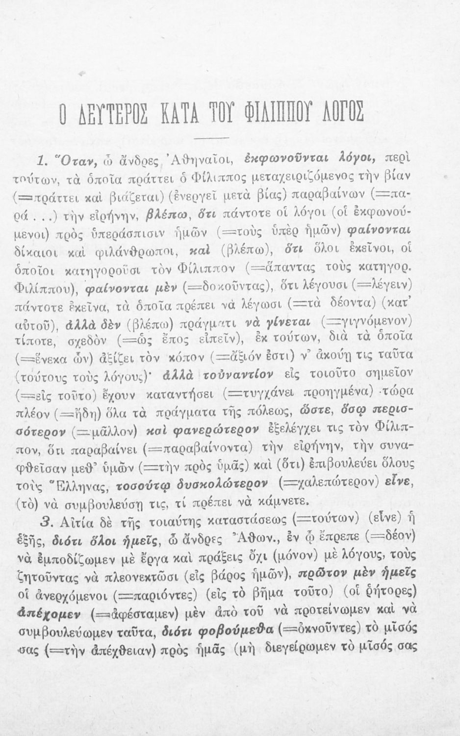 Μαθητικό βοήθημα Αρχαίων Ελληνικών Γ΄ Γυμνασίου που περιλαμβάνει το Λόγο του Δημοσθένη Β΄ κατά Φιλίππου σε μετάφραση.