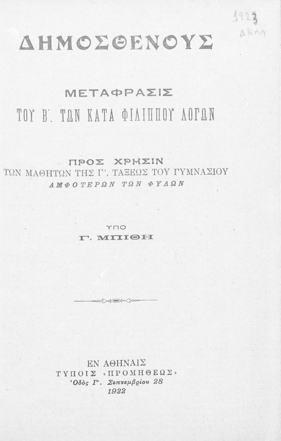 Εντοπισμός πρωτοτύπου: Ελληνικό Λογοτεχνικό και Ιστορικό Αρχείο Κωδικός βιβλιοθήκης: 1923 ΔΗΜ |
