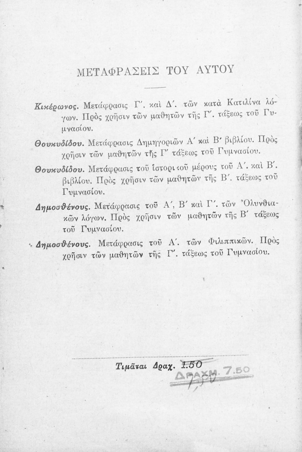 Κωδικός αναγνώρισης: 02-01903 Τίτλος: Δημοσθένους Μετάφρασις του Β΄ των κατά Φιλίππου λόγων, προς χρήσιν των μαθητών της Γ΄ τάξεως του Γυμνασίου αμφοτέρων των φύλων Συγγραφέας: Γ. Μπίθης (μετάφραση) Μέγεθος και υπόστρωμα: Μαθητικό βοήθημα, μαλακό εξώφυλλο, 20 σελίδες. |