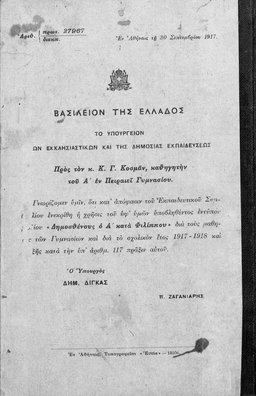 Υπουργική απόφαση / Σύμβαση: 27967/30-9-1917