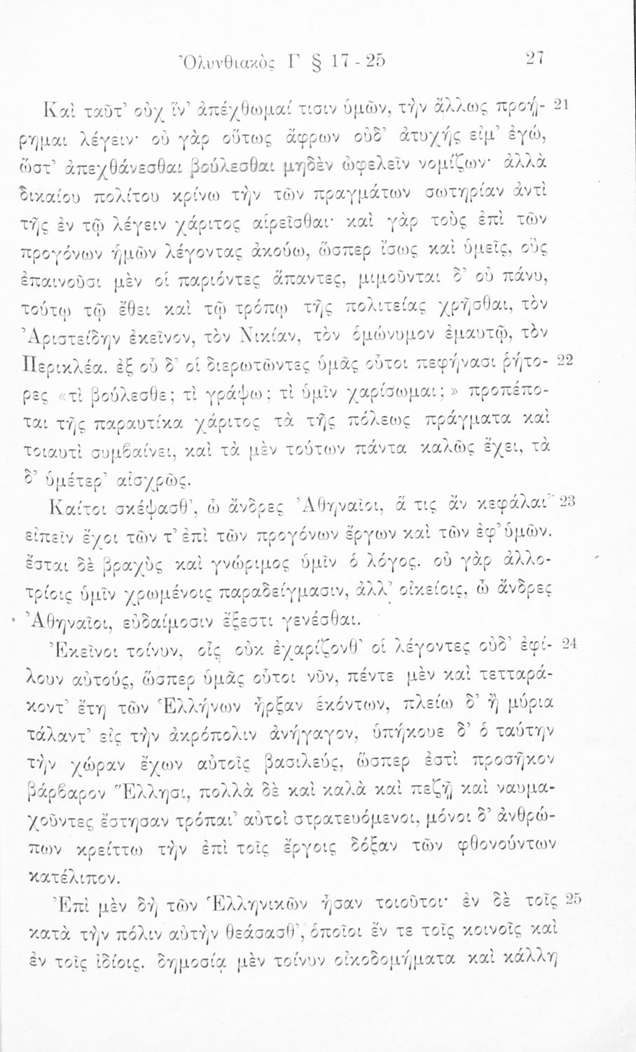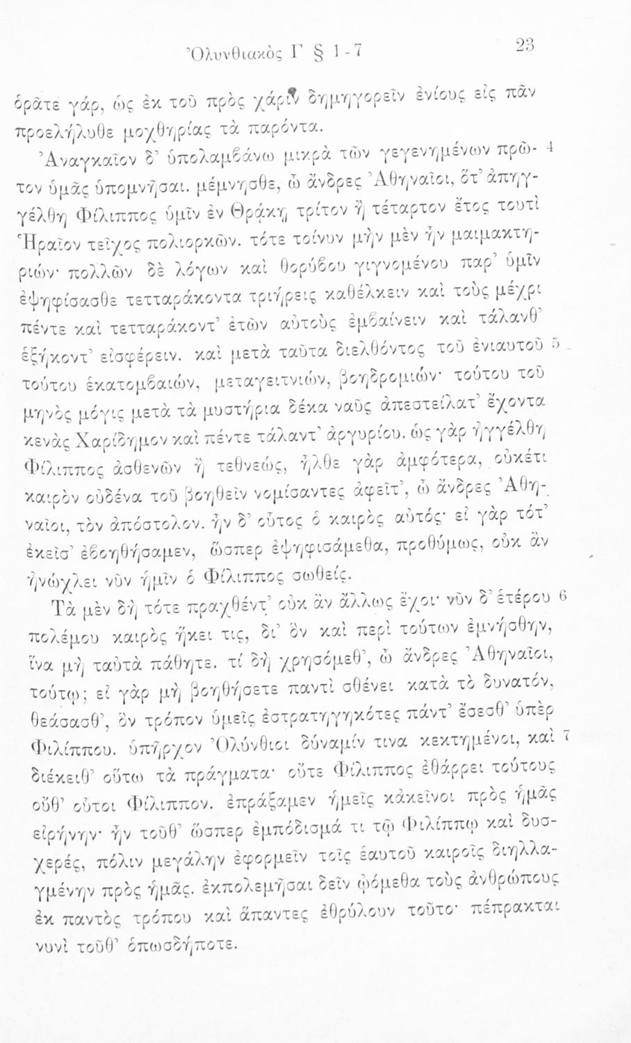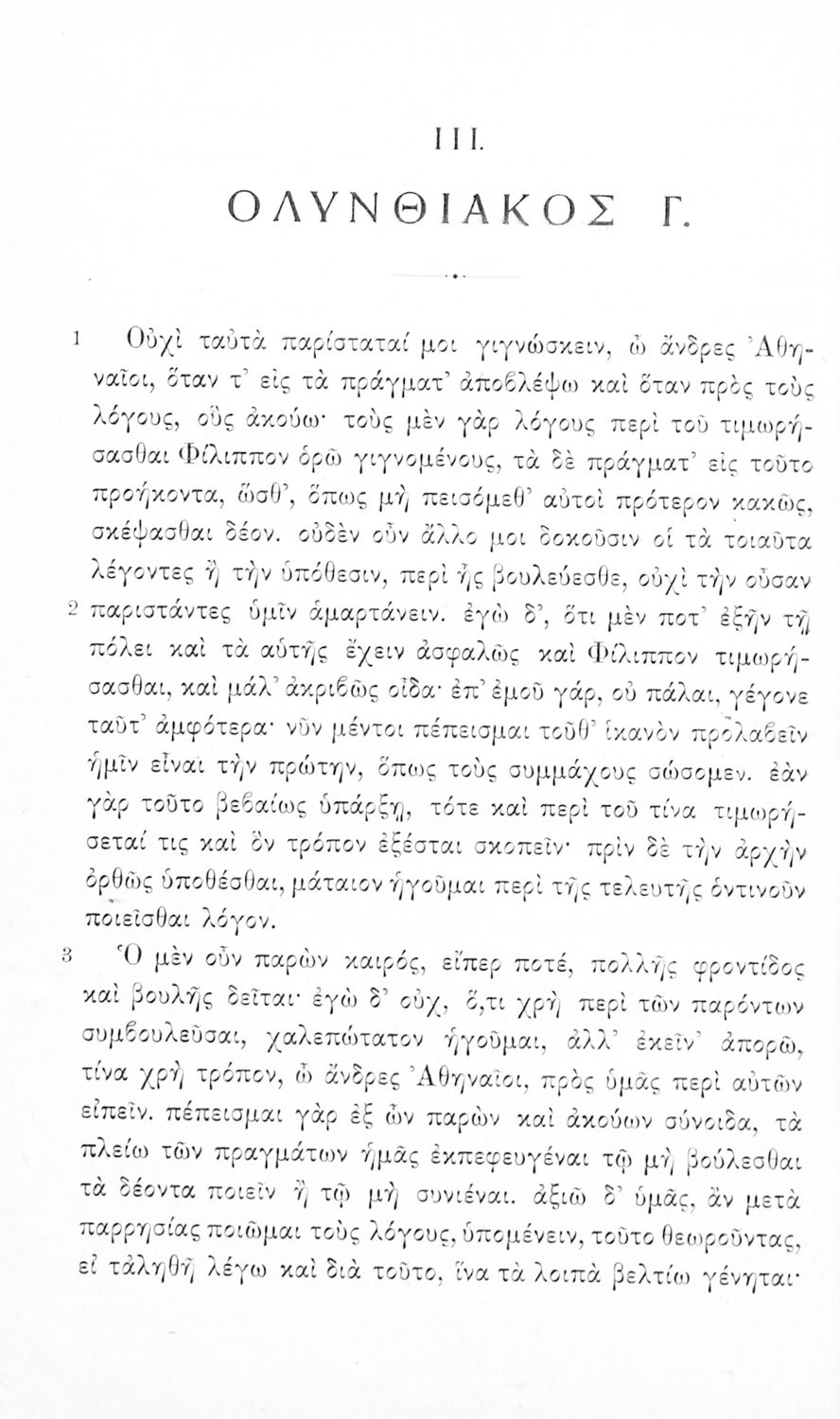 520 ## _aΣχολικό εγχειρίδιο Αρχαίων Ελληνικών Β΄ Γυμνασίου που περιλαμβάνει τους τρεις Ολυνθιακούς Λόγους του Δημοσθένη, εισαγωγικά σχόλια στη ζωή και το έργο του, την υπόθεση των Λόγων, και ερμηνευτικά, πραγματολογικά και λεξιλογικά σχόλια.