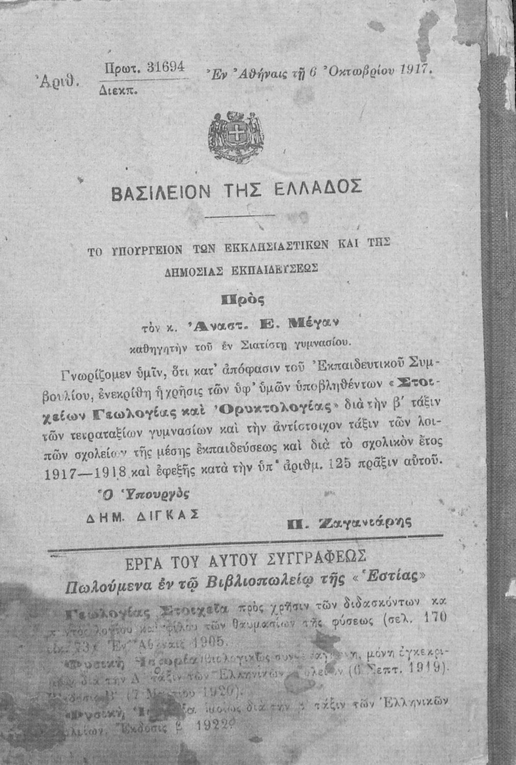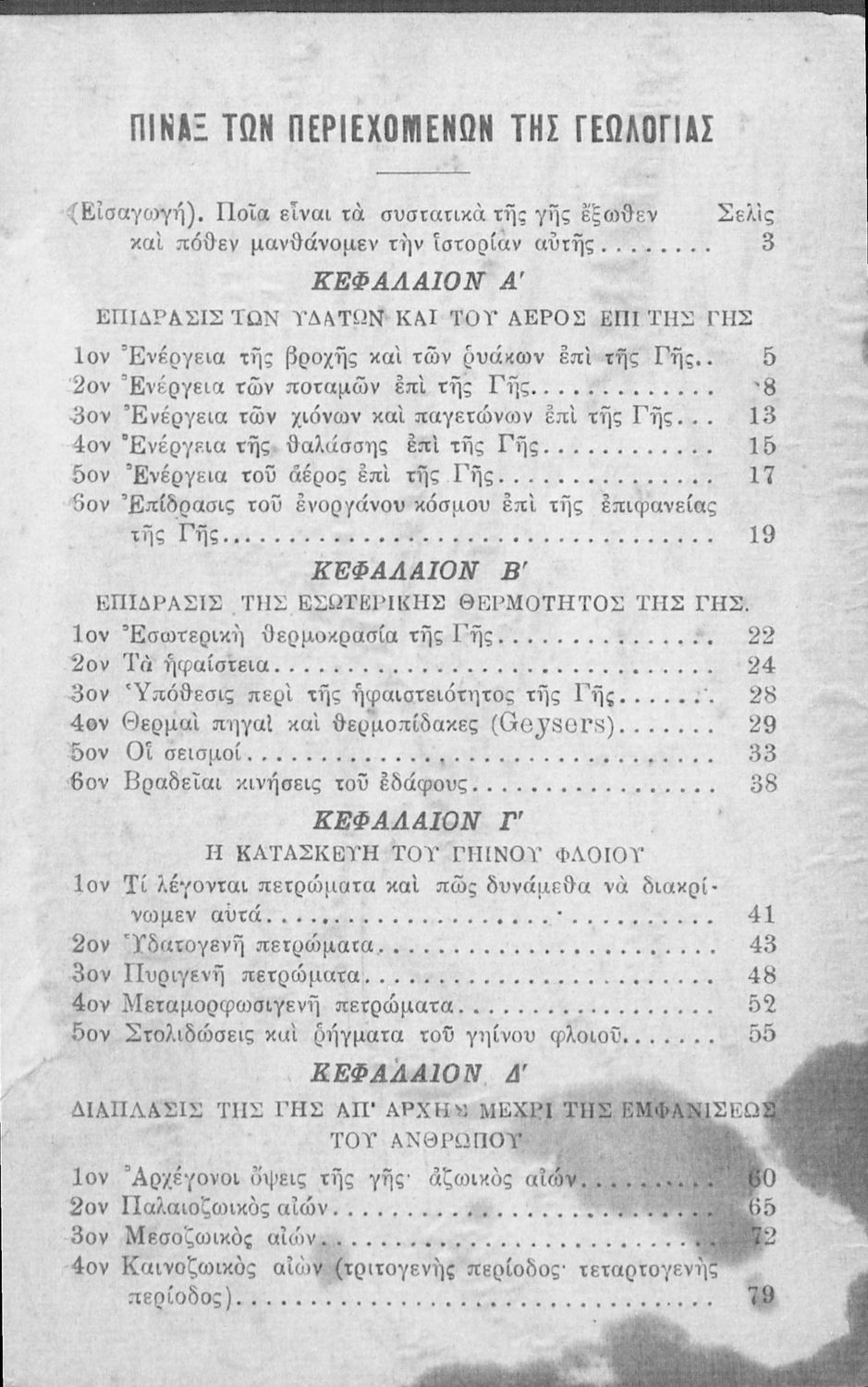 Πρόκειται για σχολικό εγχειρίδιο το οποίο μέσα από πλούσια εικονογράφηση προοριζόταν για τη διδασκαλία του μαθήματος της Γεωλογίας και Ορυκτολογίας στη Β΄ Γυμνασίου. Φέρει την υπογραφή του συγγραφέα, τη σφραγίδα του εκδότη, λίγες προσωπικές σημειώσεις του μαθητή, καθώς και την ένδειξη ΄ Βασίλειον της Ελλάδος΄ .