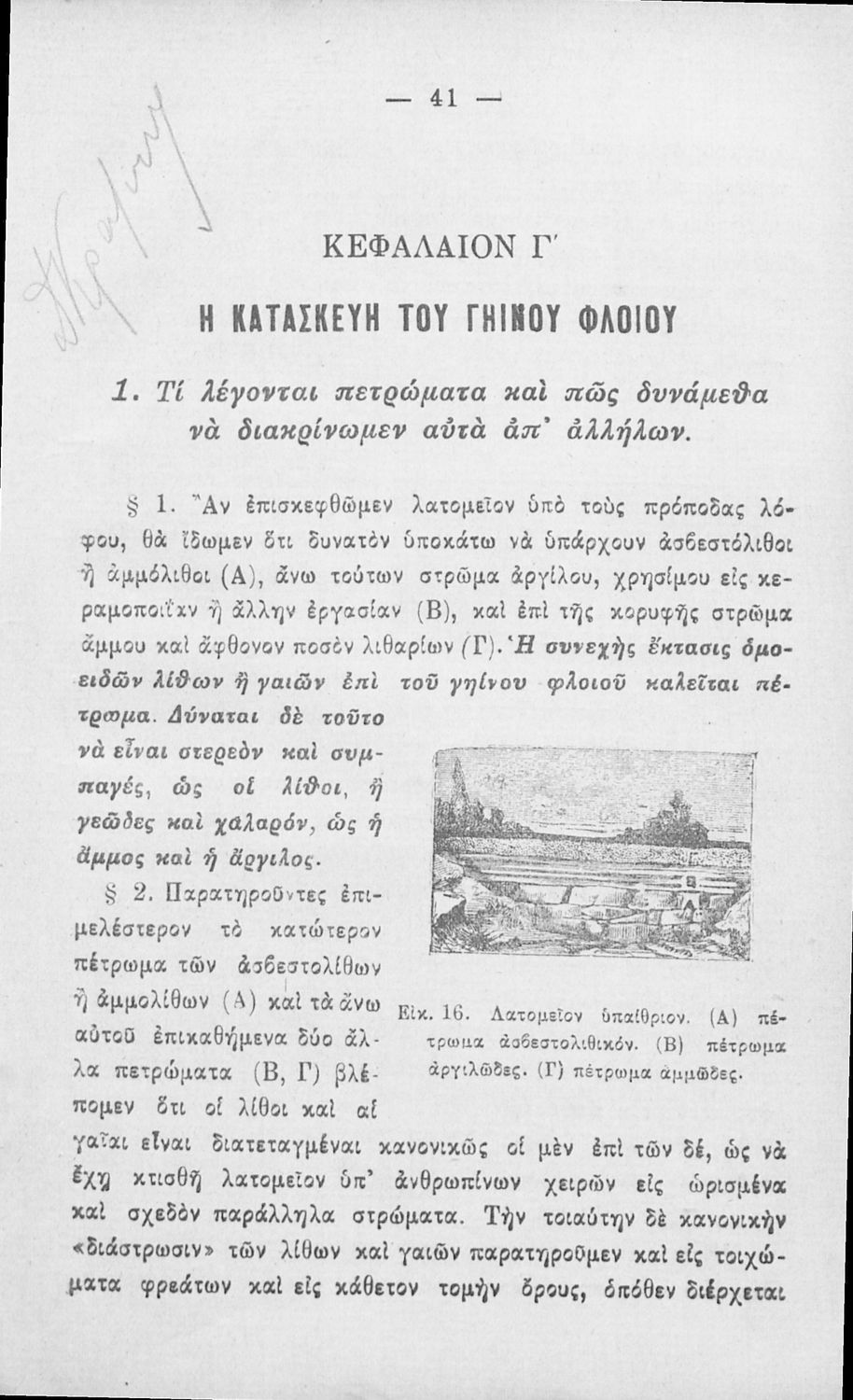 Παρουσίαση περιεχομένου: Πρόκειται για σχολικό εγχειρίδιο το οποίο μέσα από πλούσια εικονογράφηση προοριζόταν για τη διδασκαλία του μαθήματος της Γεωλογίας και Ορυκτολογίας στη Β΄ Γυμνασίου. Φέρει την υπογραφή του συγγραφέα, τη σφραγίδα του εκδότη, λίγες προσωπικές σημειώσεις του μαθητή, καθώς και την ένδειξη ΄ Βασίλειον της Ελλάδος΄ .