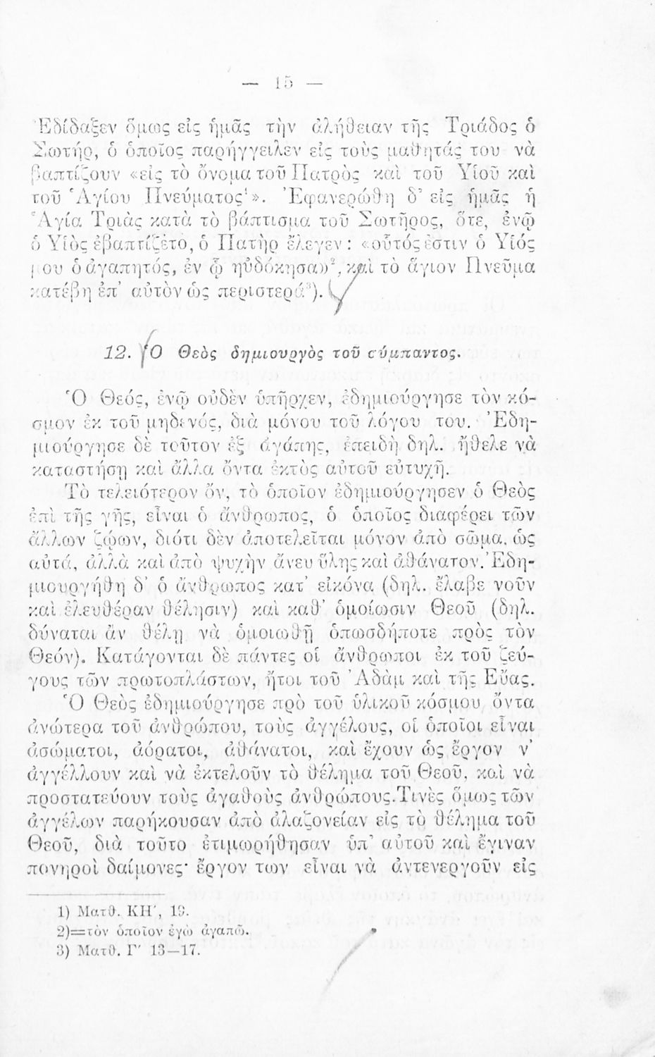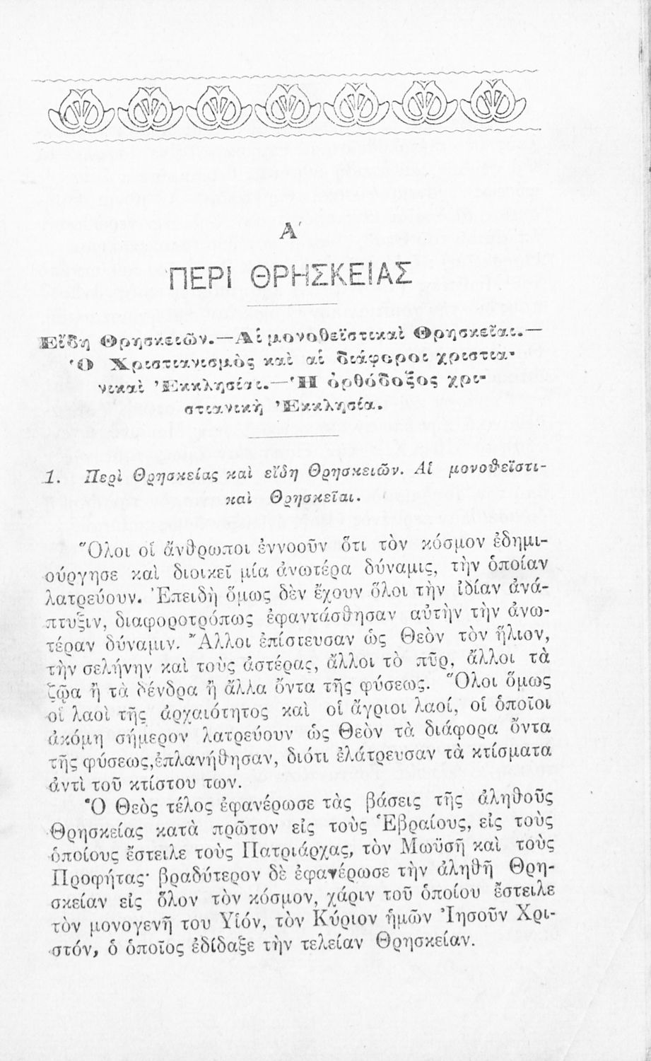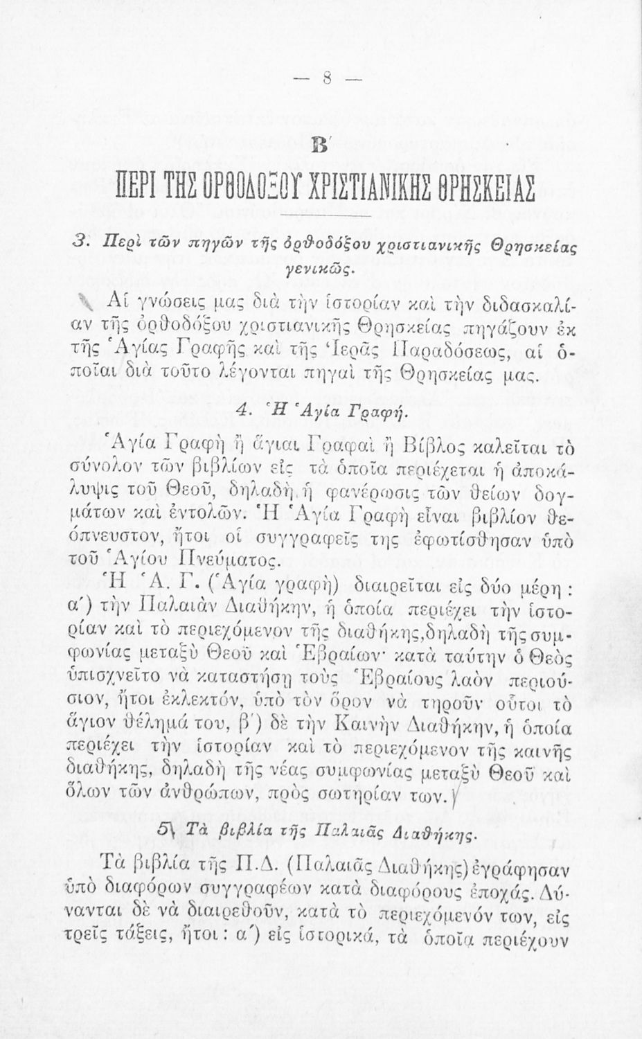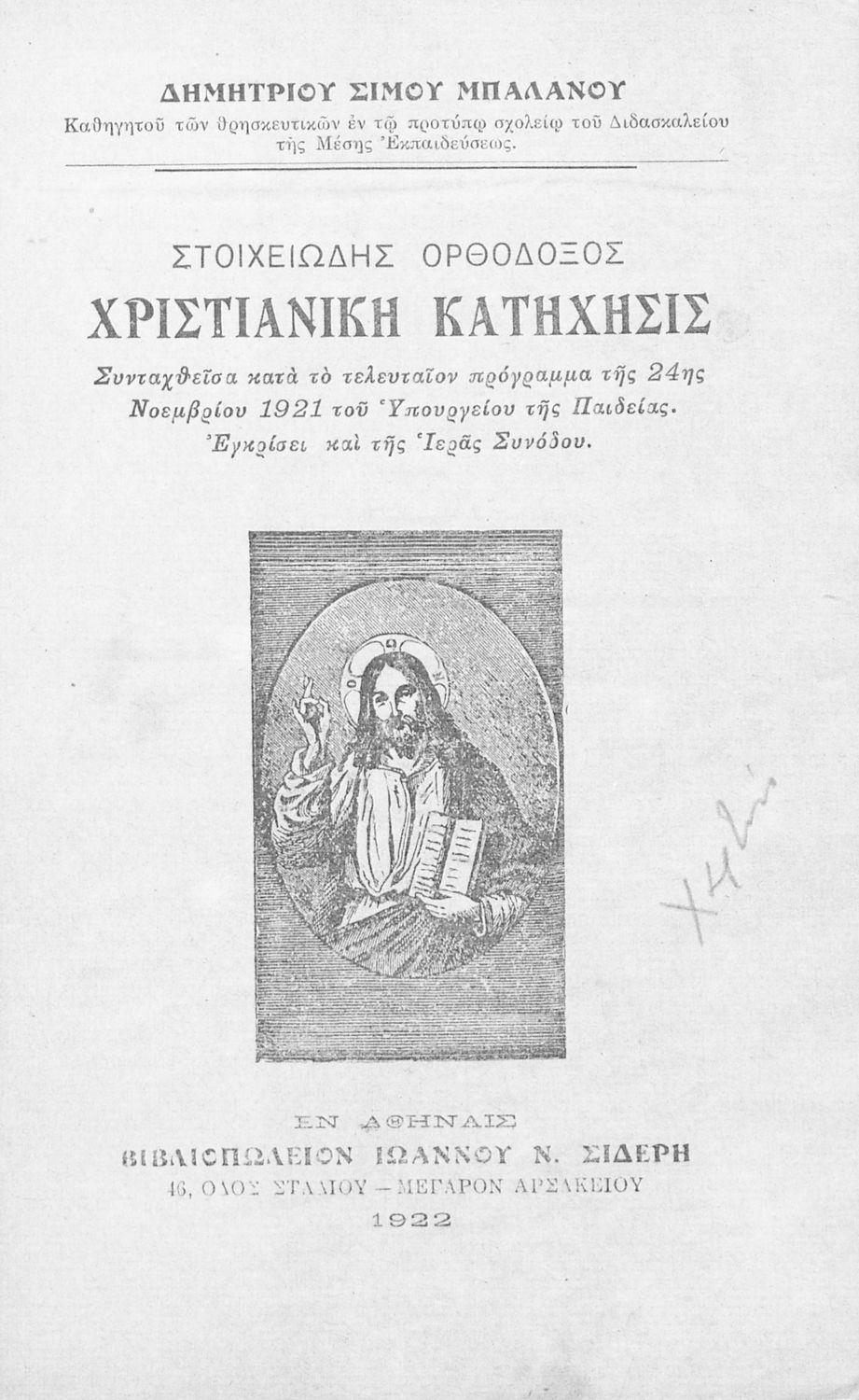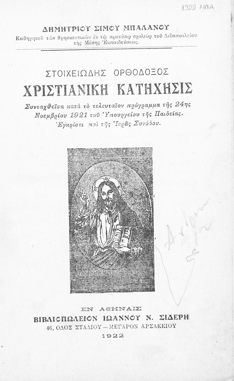 Βαθμίδα εκπαίδευσης: Δευτεροβάθμια Μάθημα: Θρησκευτικά Γλώσσα: Καθαρεύουσα Παρουσίαση περιεχομένου: Σχολικό εγχειρίδιο Θρησκευτικών που πραγματεύεται ζητήματα της ορθόδοξης κατήχησης όπως τα μυστήρια και οι Δέκα Εντολές. |