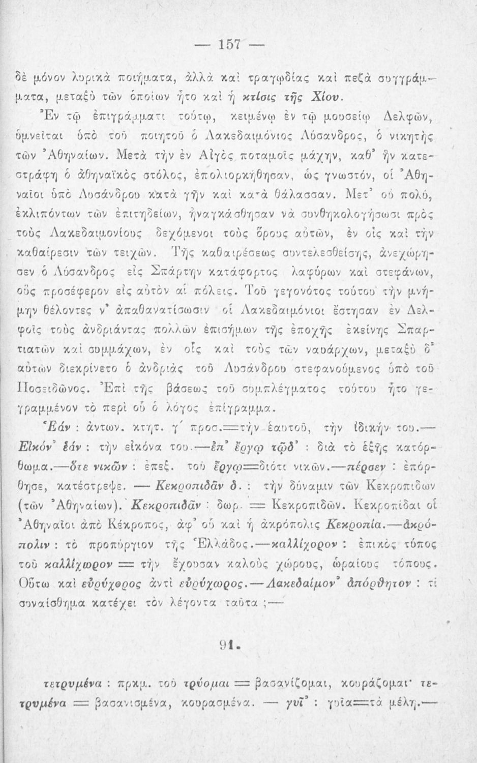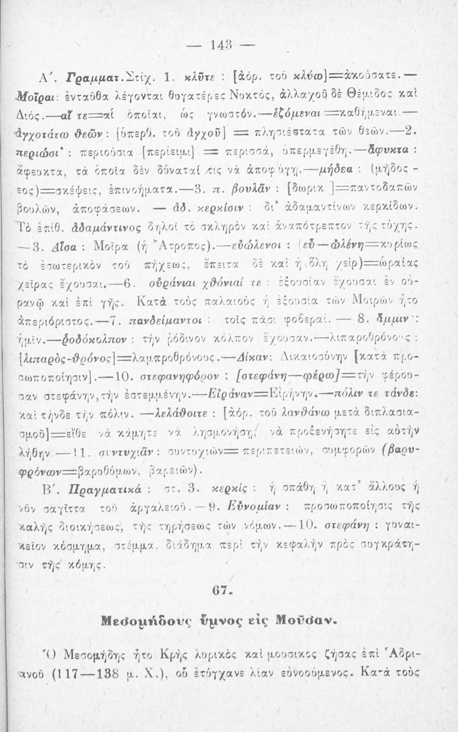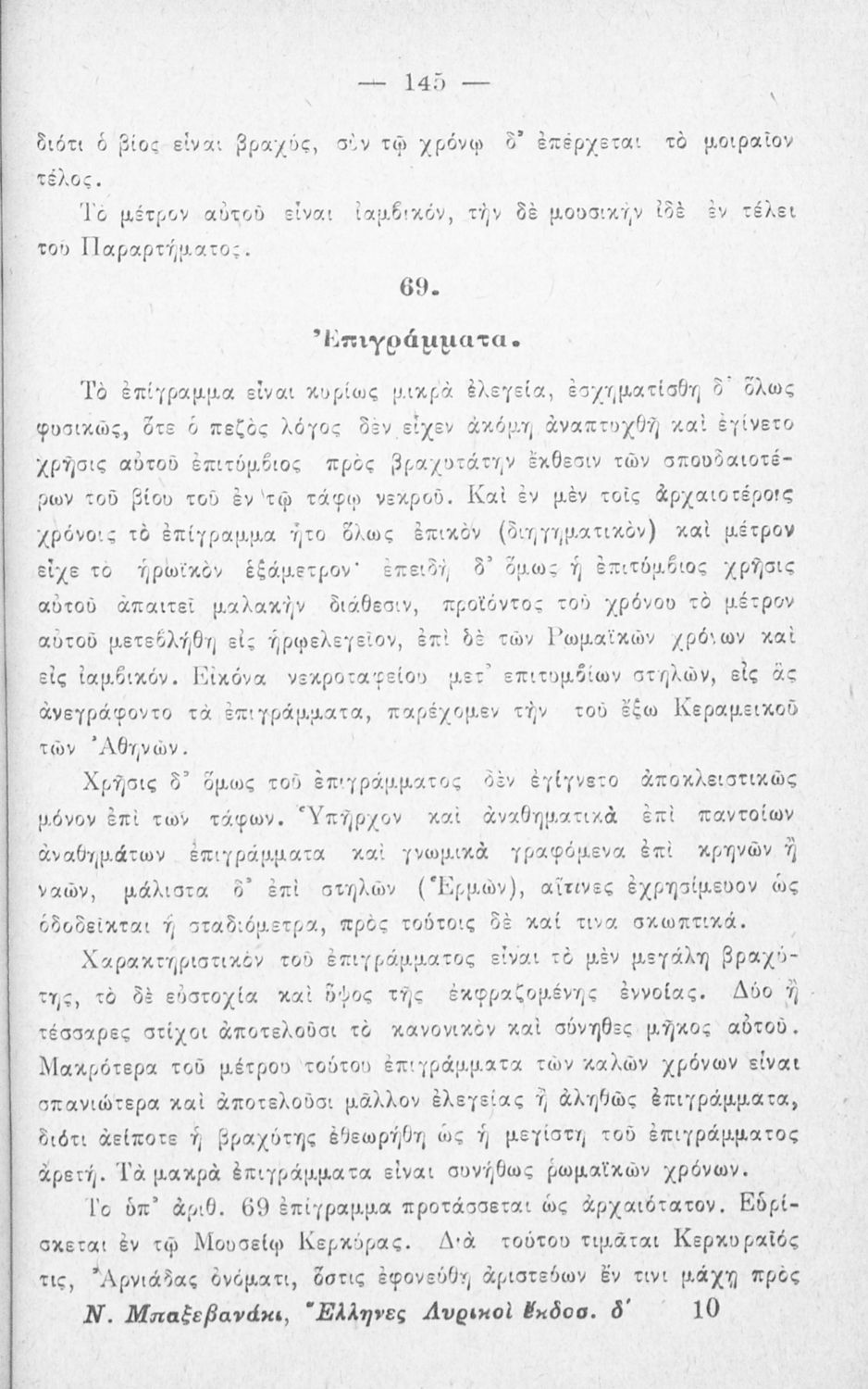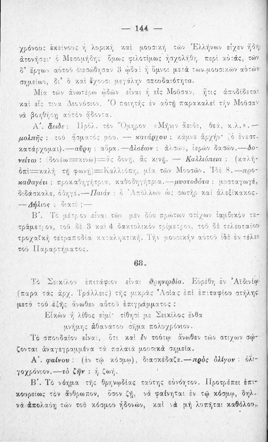 Σχολικό εγχειρίδιο Αρχαίων Ελληνικών Γ΄ Γυμνασίου που περιλαμβάνει αποσπάσματα έργων αρχαίων Ελλήνων λυρικών, πολιτικές και γνωμικές ελεγείες, ιάμβους και επιγράμματα. Περιέχει υπόμνημα με ερμηνευτικά, πραγματολογικά, γλωσσικά και γραμματικά σχόλια και μετρικό παράρτημα.