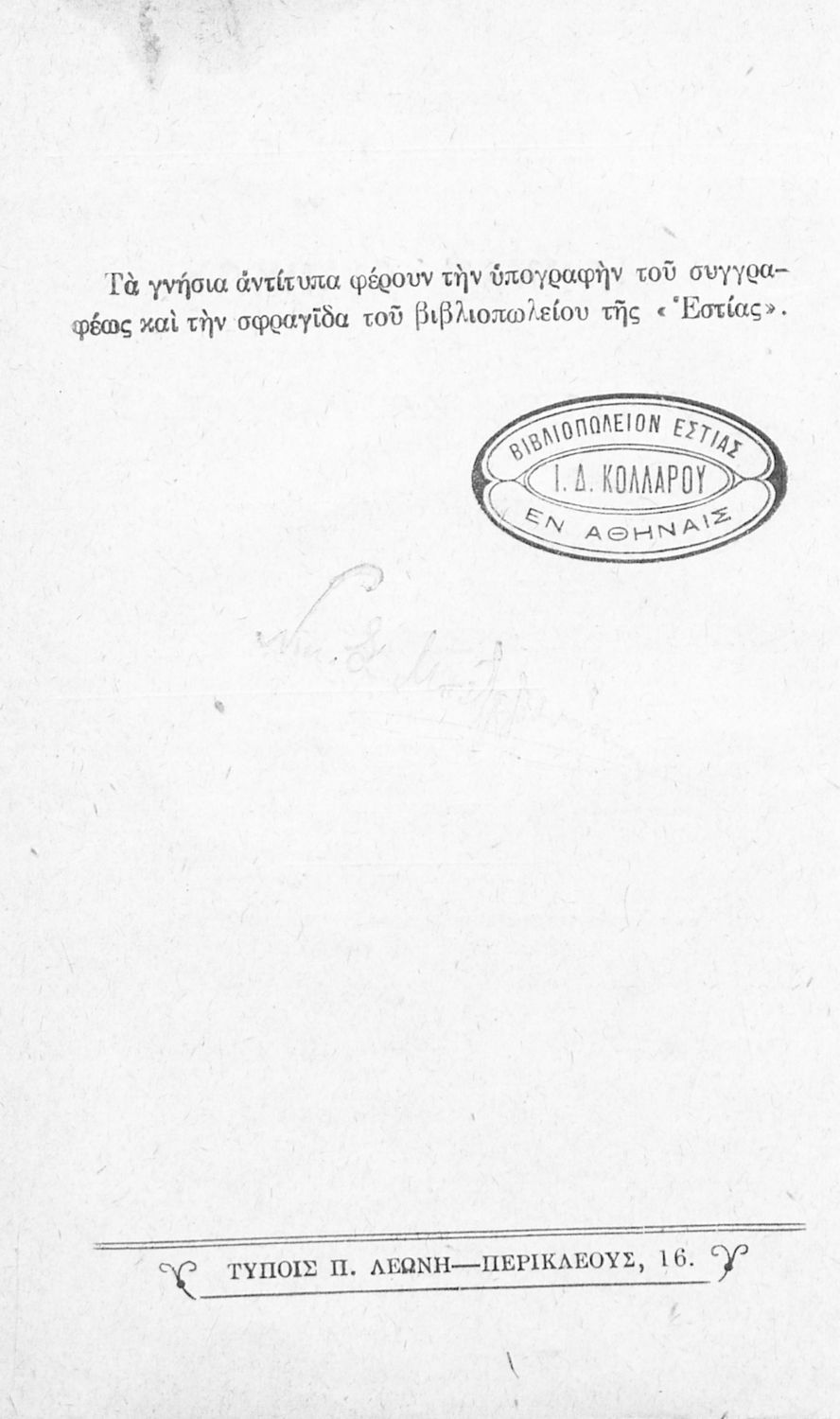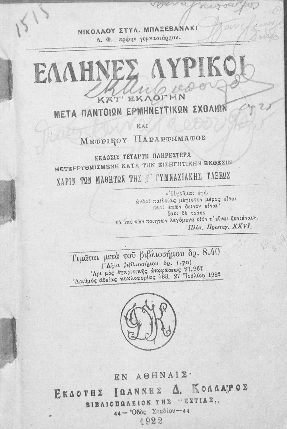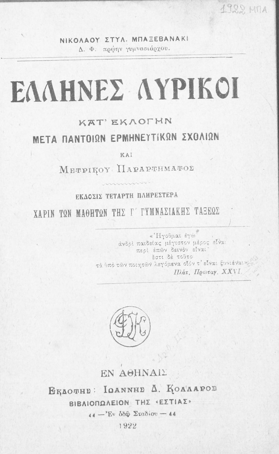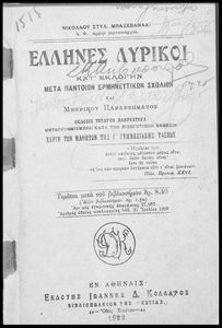 Εντοπισμός πρωτοτύπου: Ελληνικό Λογοτεχνικό και Ιστορικό Αρχείο Κωδικός βιβλιοθήκης: 1922 ΜΠΑ |