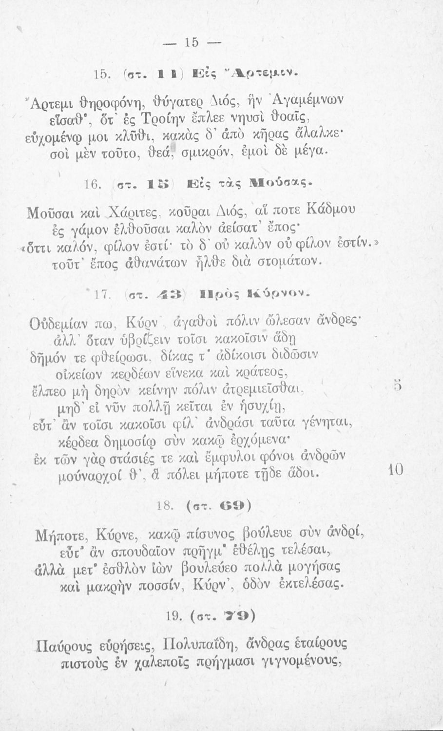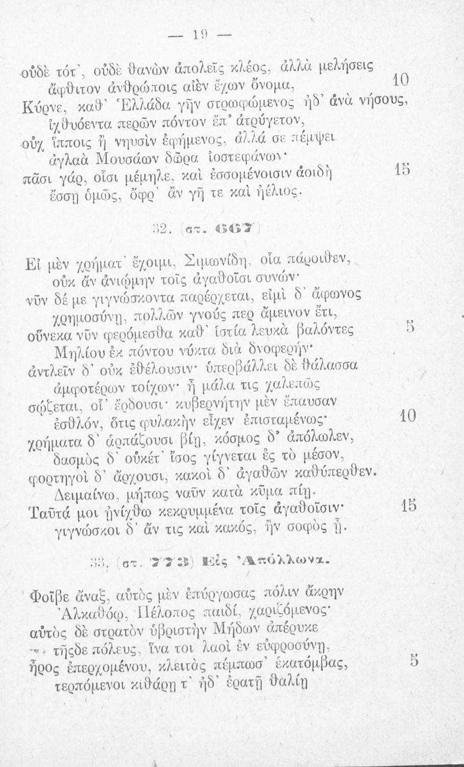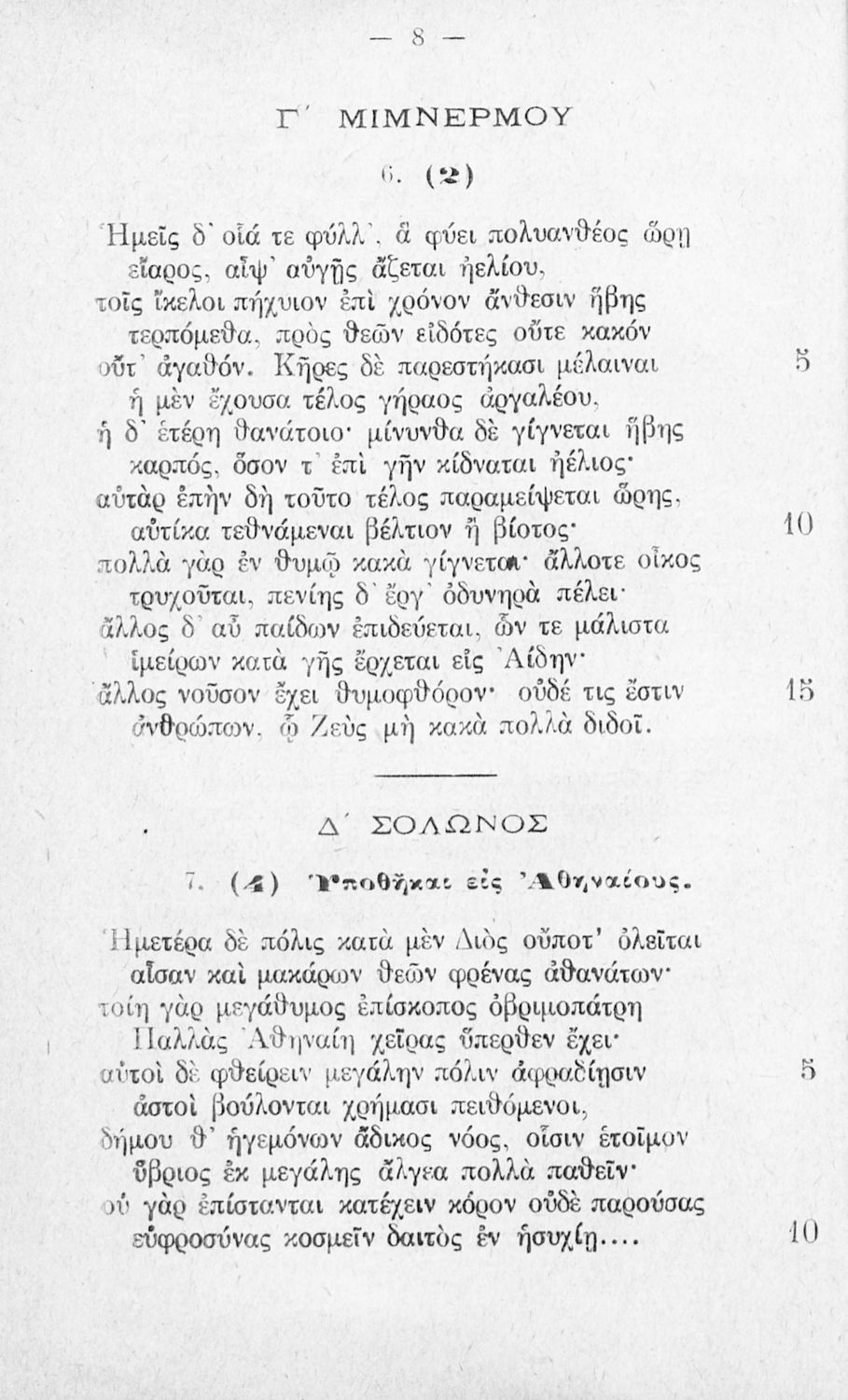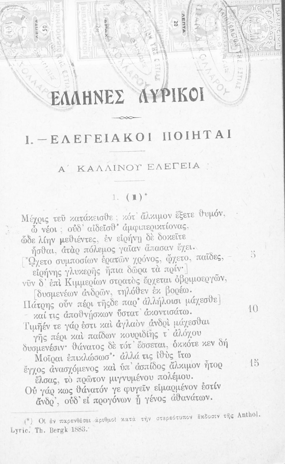 Σχολικό εγχειρίδιο Αρχαίων Ελληνικών Γ΄ Γυμνασίου που περιλαμβάνει αποσπάσματα έργων αρχαίων Ελλήνων λυρικών, πολιτικές και γνωμικές ελεγείες, ιάμβους και επιγράμματα. Περιέχει υπόμνημα με ερμηνευτικά, πραγματολογικά, γλωσσικά και γραμματικά σχόλια και μετρικό παράρτημα.