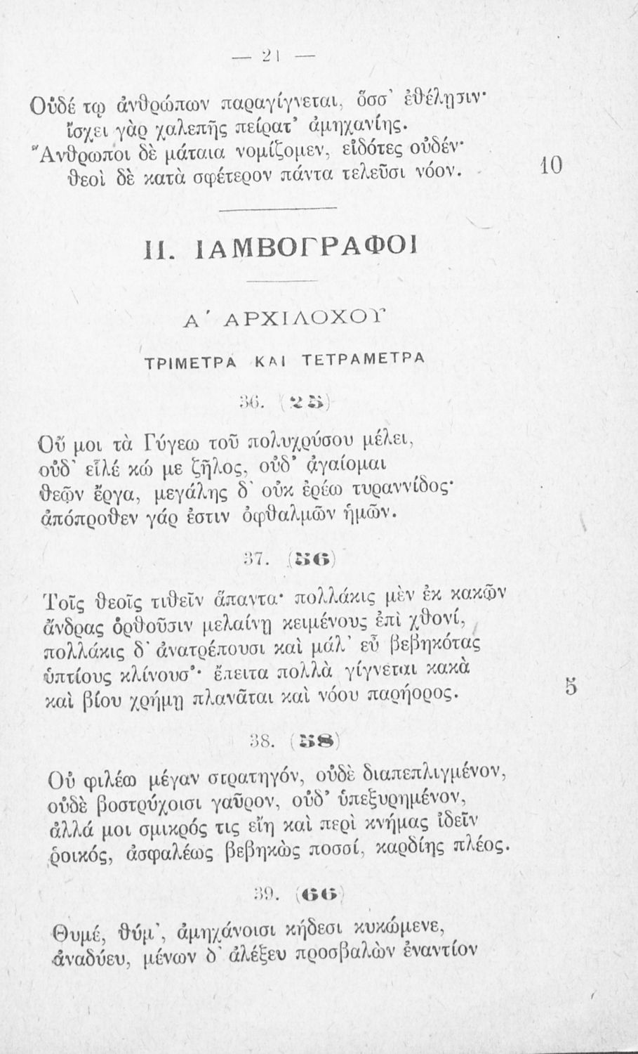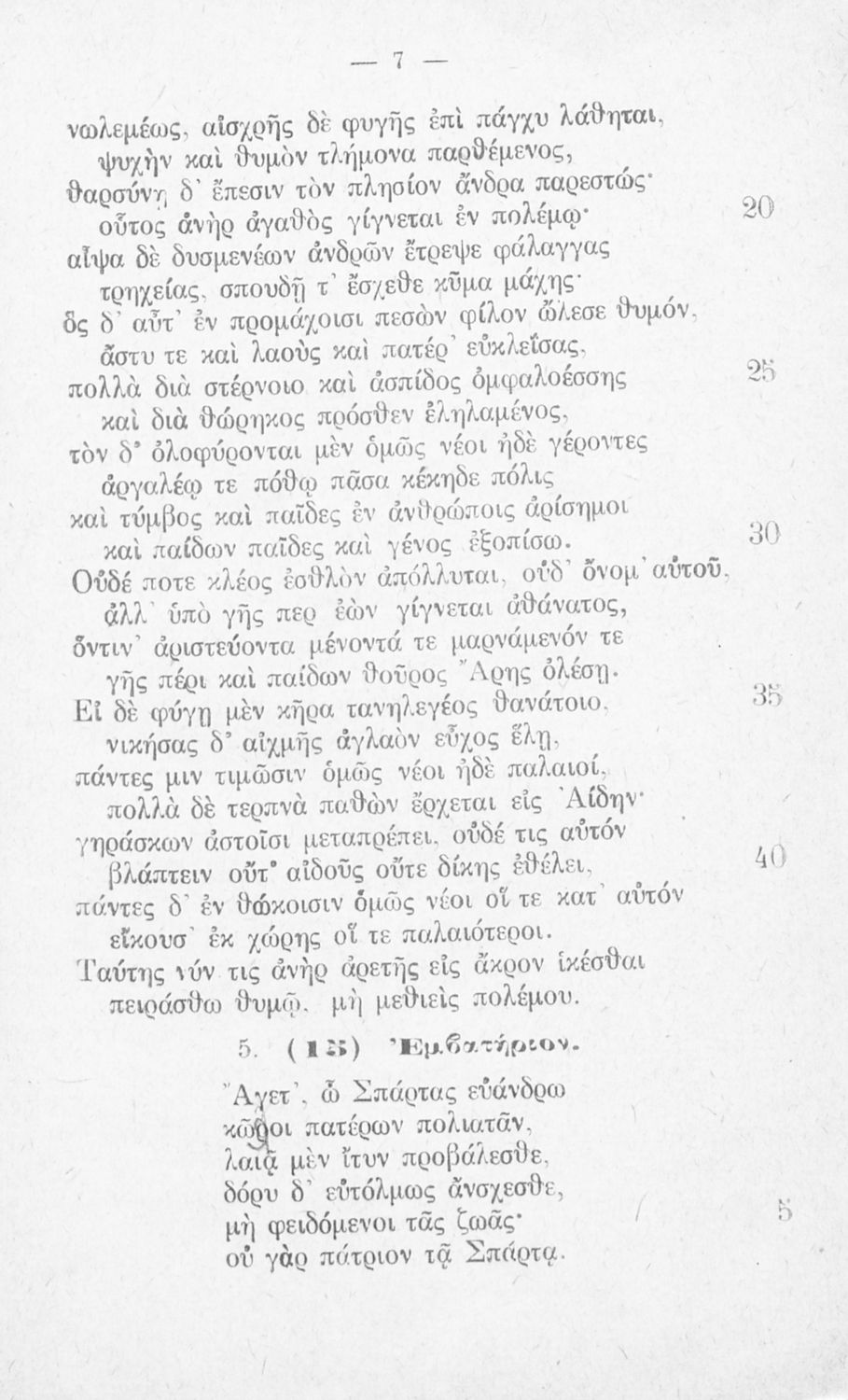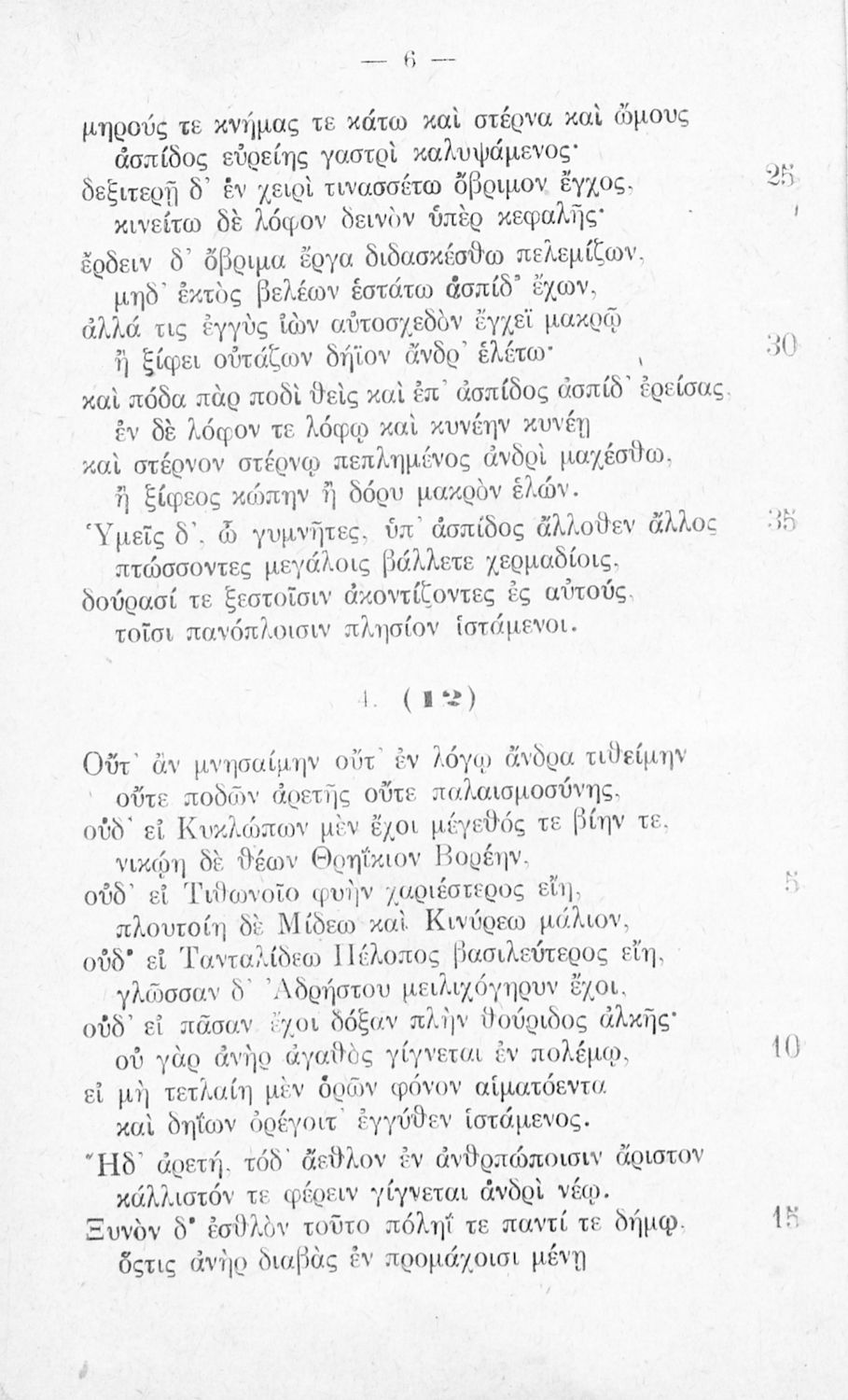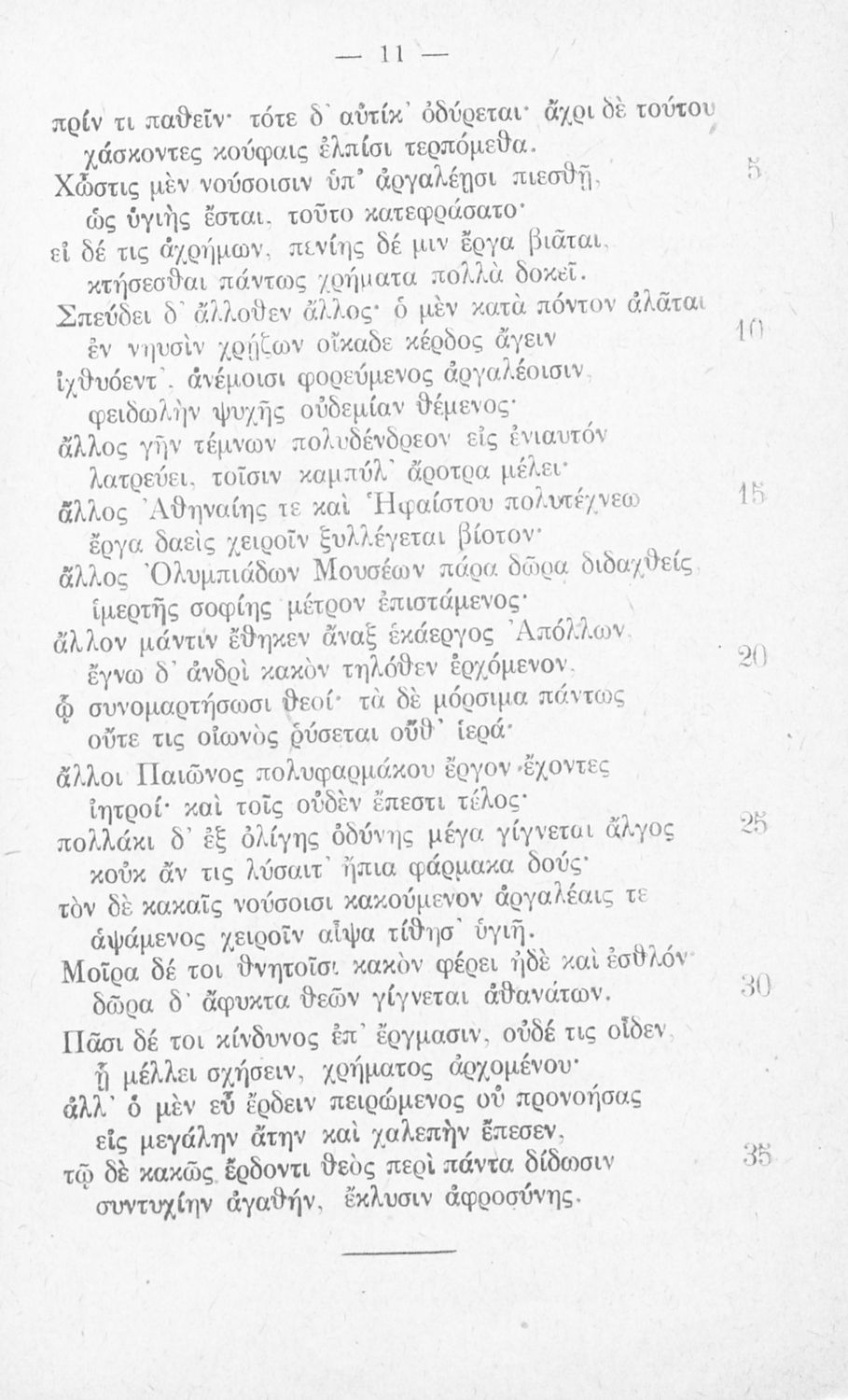Σχολικό εγχειρίδιο Αρχαίων Ελληνικών Γ΄ Γυμνασίου που περιλαμβάνει αποσπάσματα έργων αρχαίων Ελλήνων λυρικών, πολιτικές και γνωμικές ελεγείες, ιάμβους και επιγράμματα. Περιέχει υπόμνημα με ερμηνευτικά, πραγματολογικά, γλωσσικά και γραμματικά σχόλια και μετρικό παράρτημα.
