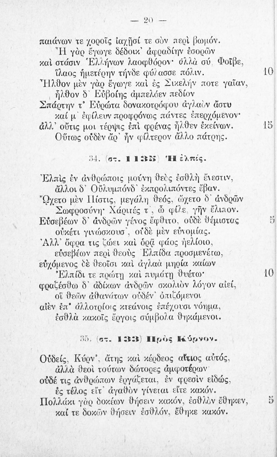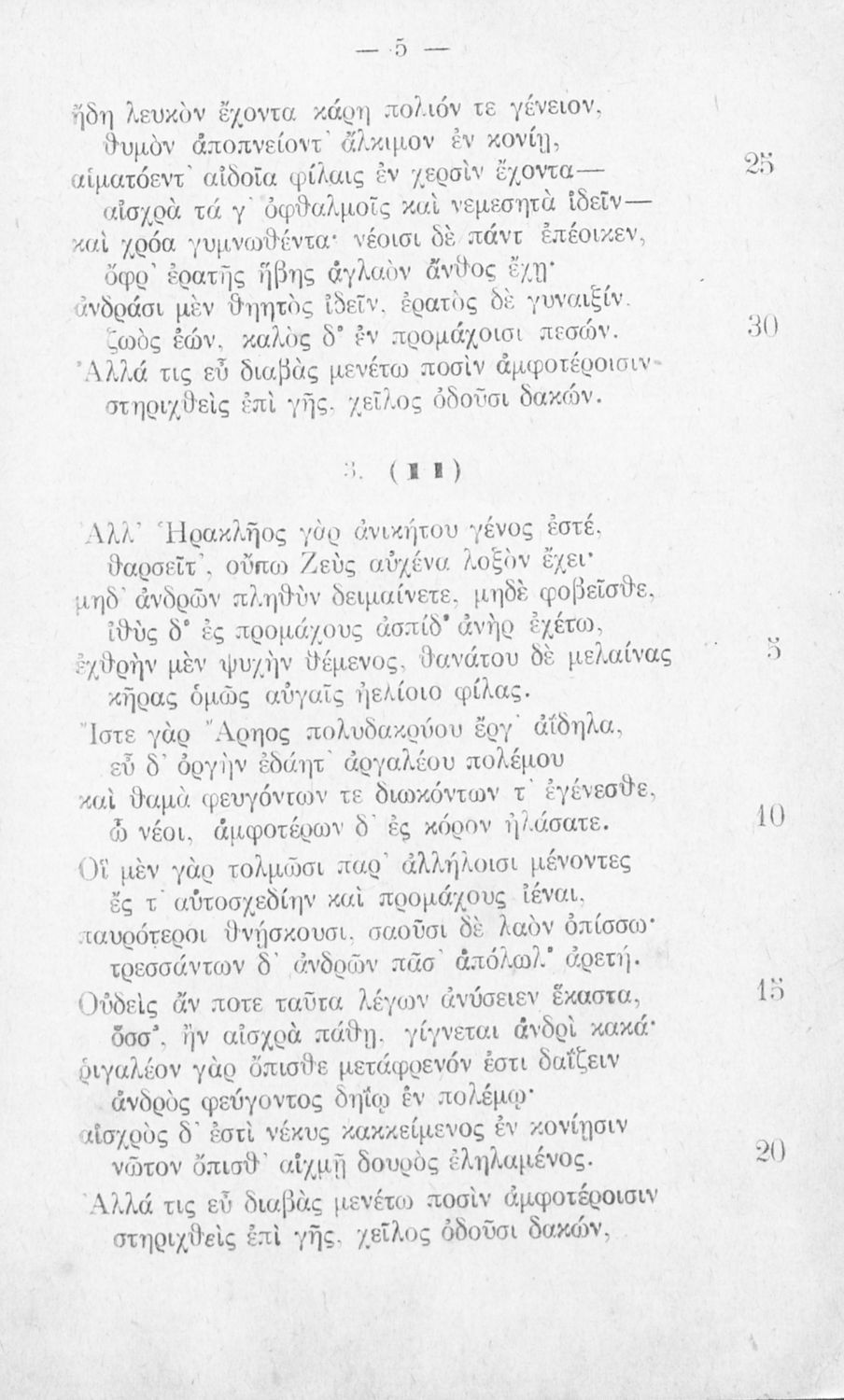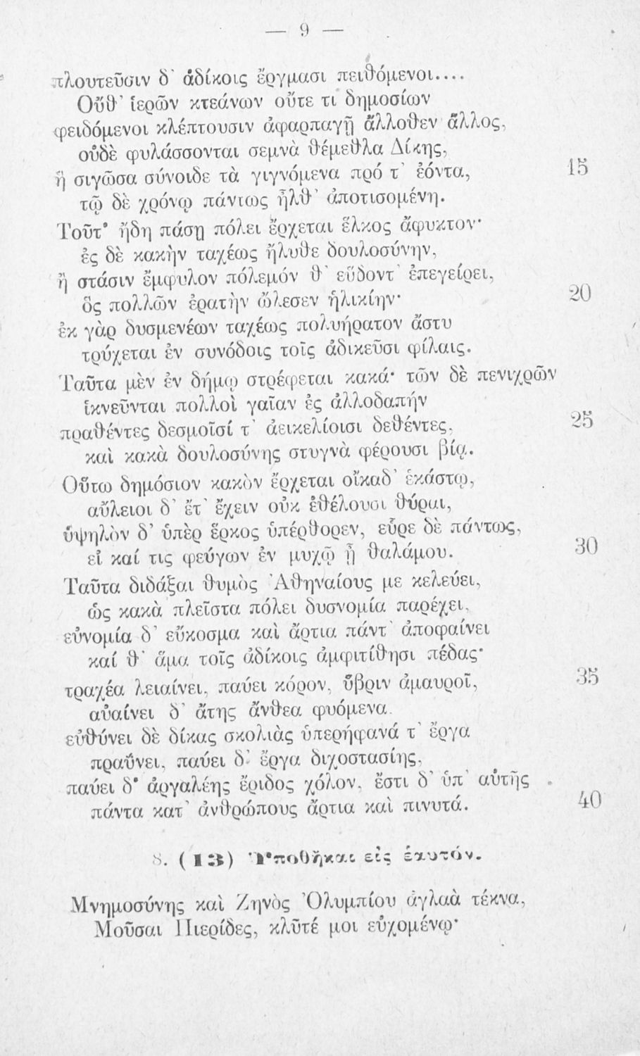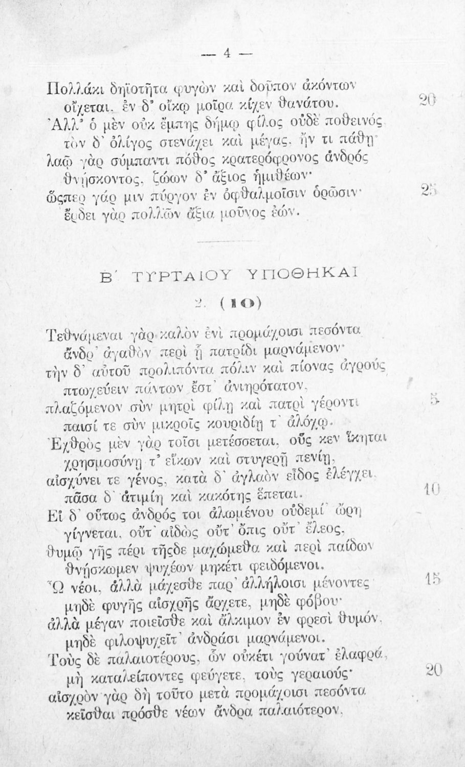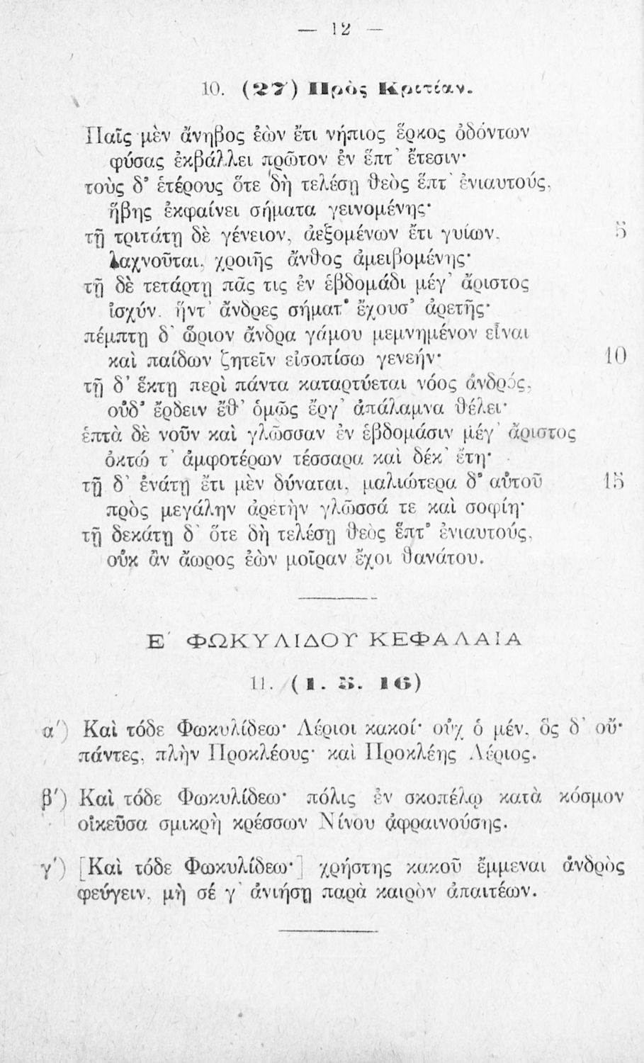 Σχολικό εγχειρίδιο Αρχαίων Ελληνικών Γ΄ Γυμνασίου που περιλαμβάνει αποσπάσματα έργων αρχαίων Ελλήνων λυρικών, πολιτικές και γνωμικές ελεγείες, ιάμβους και επιγράμματα. Περιέχει υπόμνημα με ερμηνευτικά, πραγματολογικά, γλωσσικά και γραμματικά σχόλια και μετρικό παράρτημα.