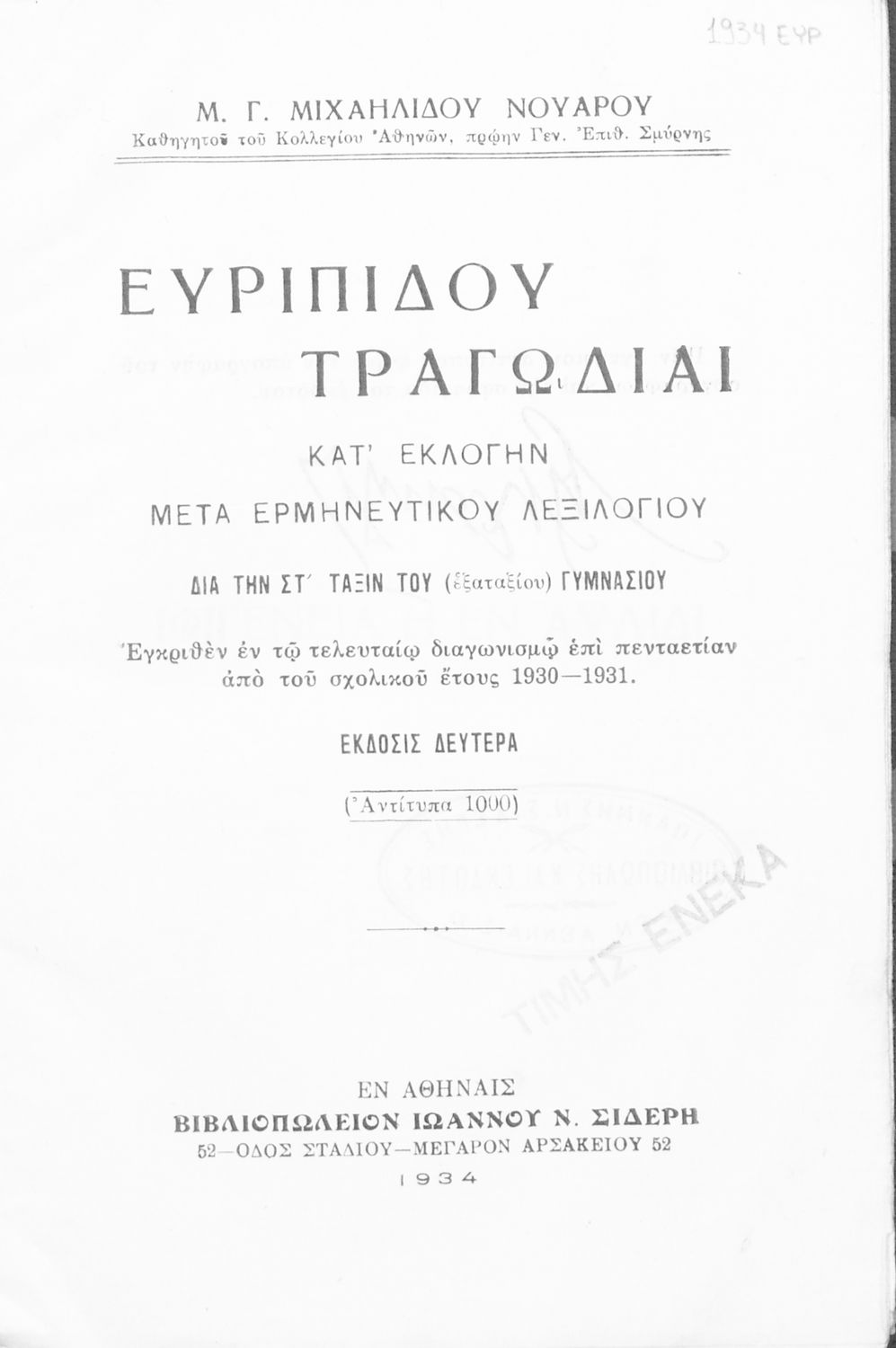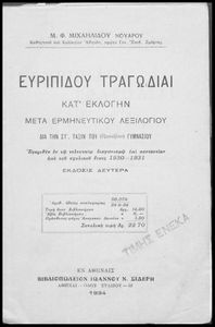 Ευριπίδου Τραγωδίαι, κατ' εκλογήν μετά ερμηνευτικού λεξιλογίου, δια την ΣΤ΄ τάξιν του (εξατάξιου) Γυμνασίου