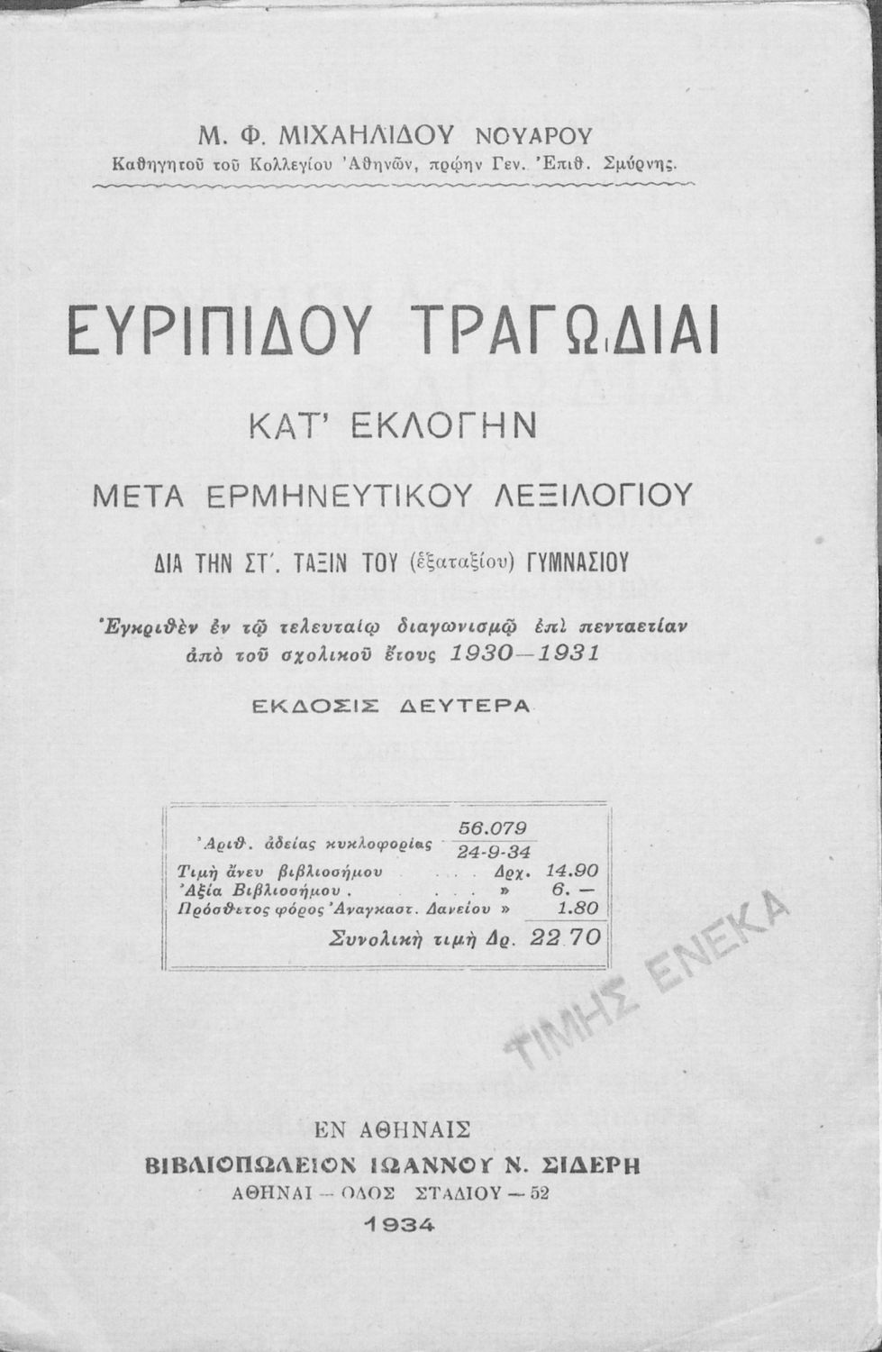 Συγγραφέας: Ευριπίδης, Μ. Γ. Μιχαηλίδης-Νουάρος (σχόλια)