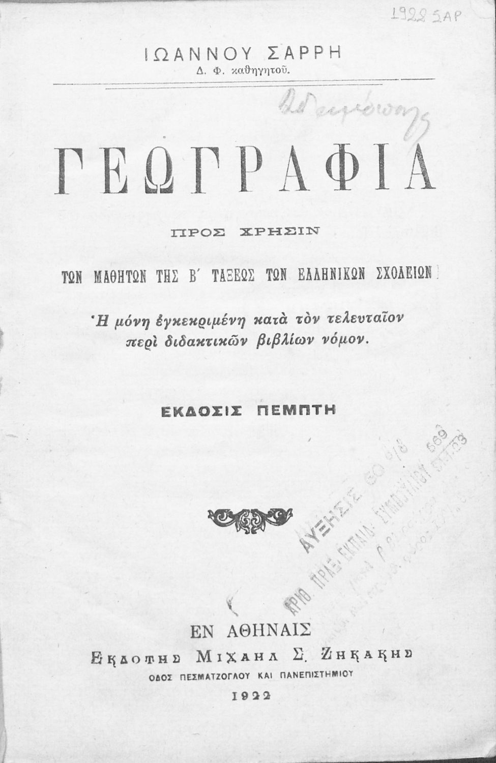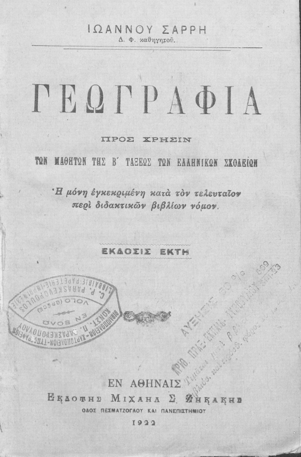 Εκδότης: Μιχαήλ Σ. Ζηκάκης Έτος έκδοσης: 1922 Τόπος έκδοσης: Αθήνα Έκδοση: 5η |