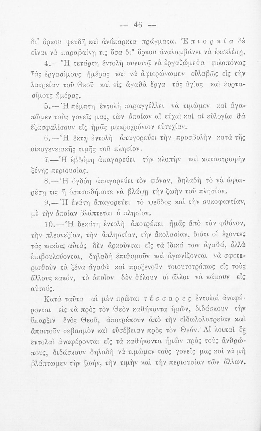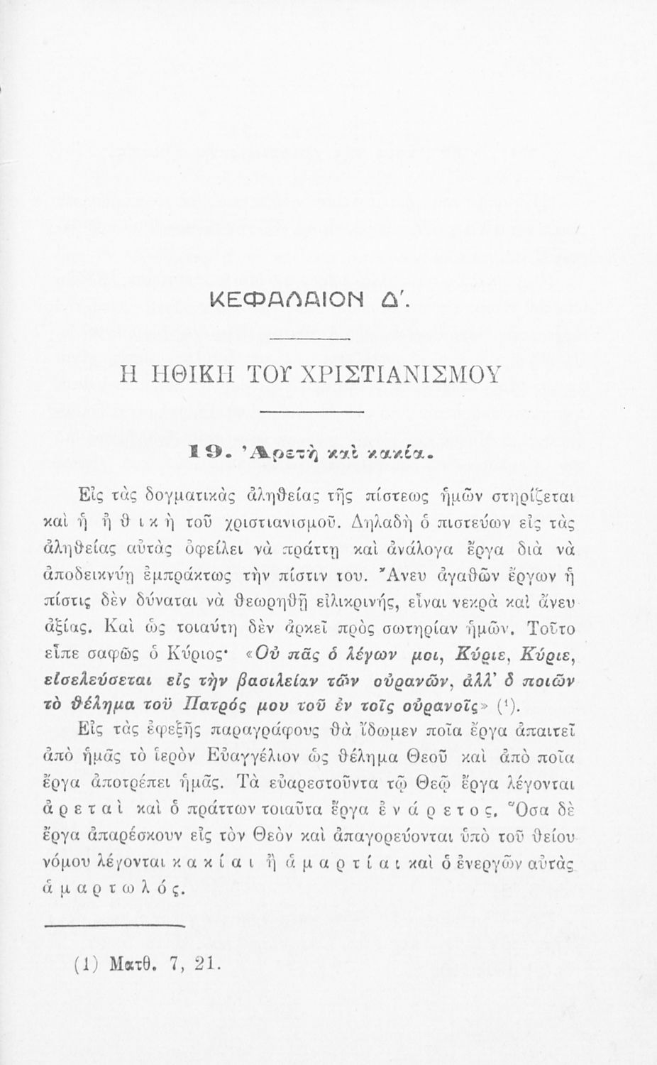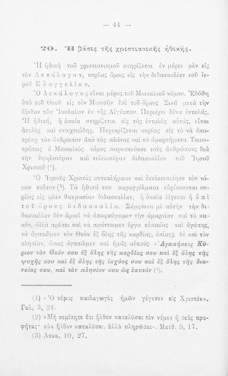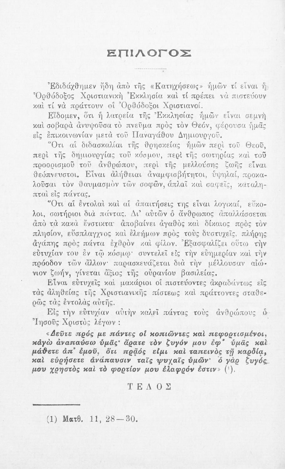 Βαθμίδα εκπαίδευσης: Δευτεροβάθμια Τάξη: Γ' Ελληνικού Σχολείου Μάθημα: Θρησκευτικά Γλώσσα: Καθαρεύουσα Παρουσίαση περιεχομένου: Σχολικό εγχειρίδιο Θρησκευτικών Γ' Ελληνικού Σχολείου που περιλαμβάνει εισαγωγή στη χριστιανική κατήχηση και τα δόγματά της και πραγματεύεται δογματικά και ηθικά ζητήματα της ορθόδοξης παράδοσης. |