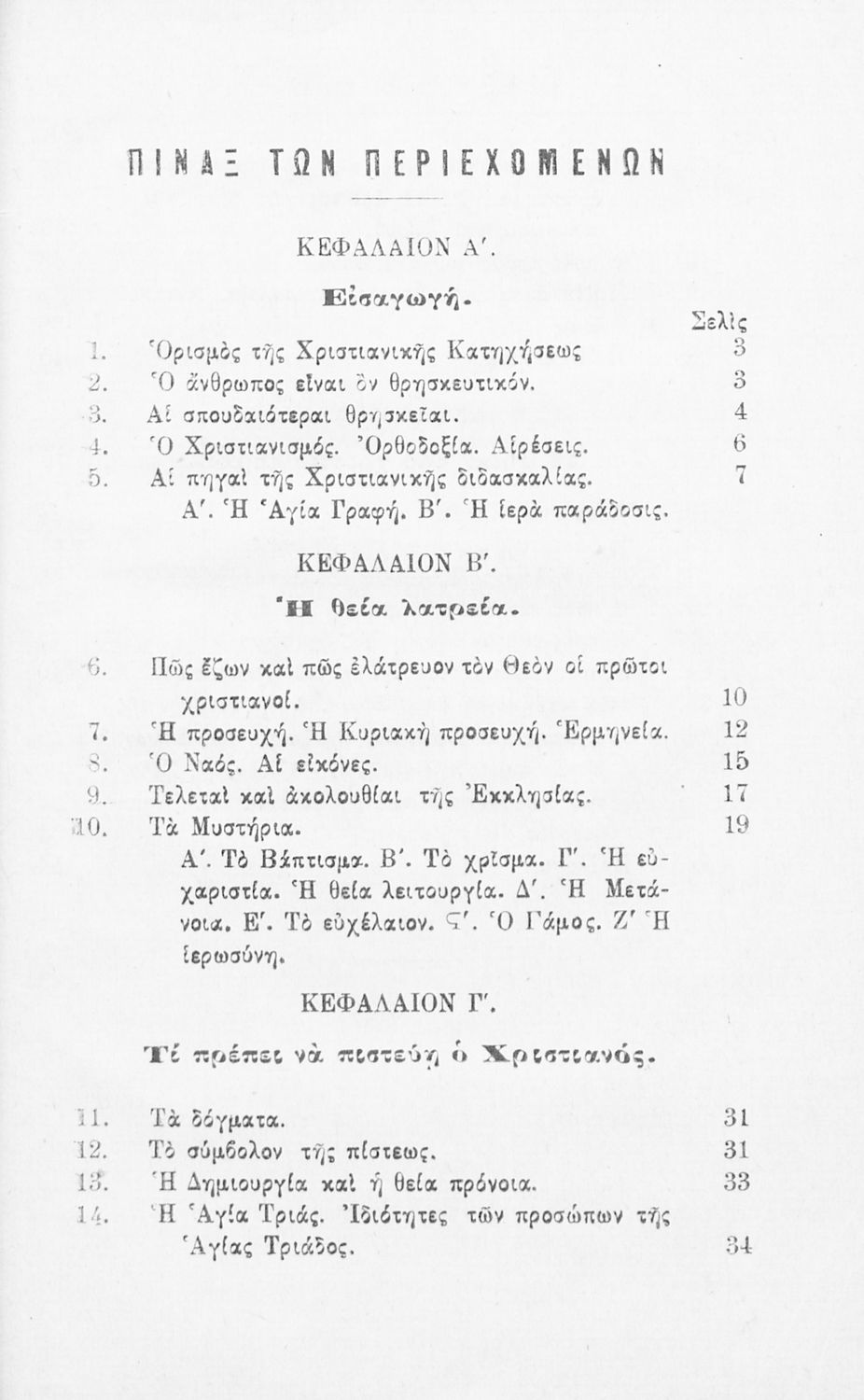 Σχολικό εγχειρίδιο Θρησκευτικών Γ' Ελληνικού Σχολείου που περιλαμβάνει εισαγωγή στη χριστιανική κατήχηση και τα δόγματά της και πραγματεύεται δογματικά και ηθικά ζητήματα της ορθόδοξης παράδοσης.