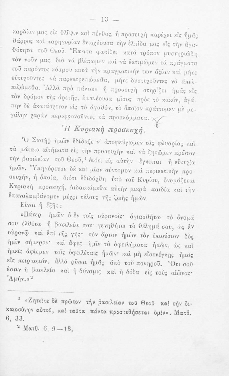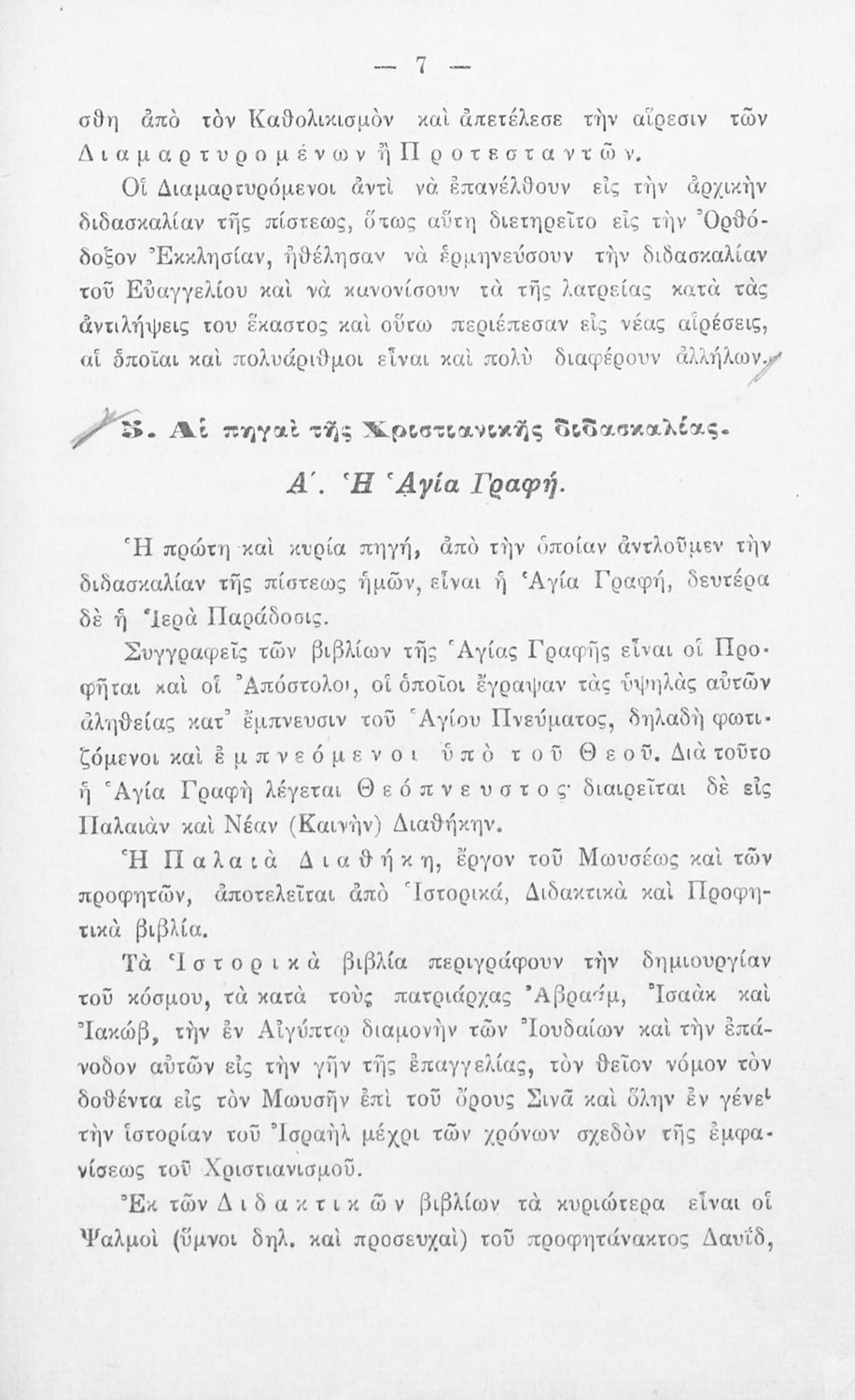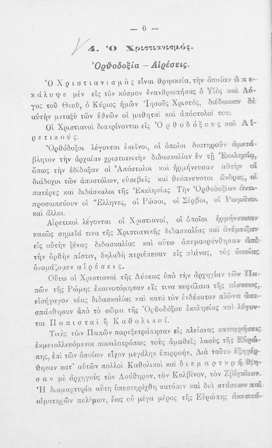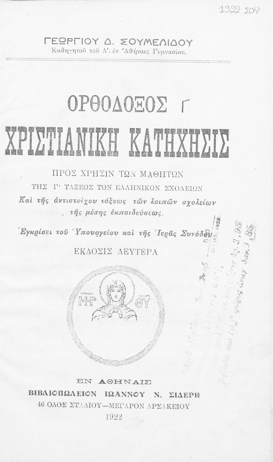 Βαθμίδα εκπαίδευσης: Δευτεροβάθμια Τάξη: Γ' Ελληνικού Σχολείου Μάθημα: Θρησκευτικά Γλώσσα: Καθαρεύουσα Παρουσίαση περιεχομένου: Σχολικό εγχειρίδιο Θρησκευτικών Γ' Ελληνικού Σχολείου που περιλαμβάνει εισαγωγή στη χριστιανική κατήχηση και τα δόγματά της και πραγματεύεται δογματικά και ηθικά ζητήματα της ορθόδοξης παράδοσης. |