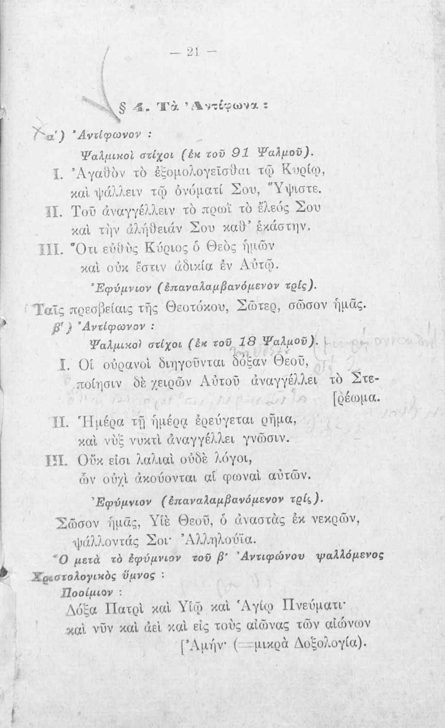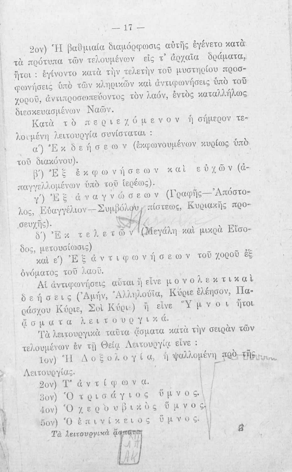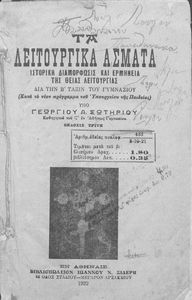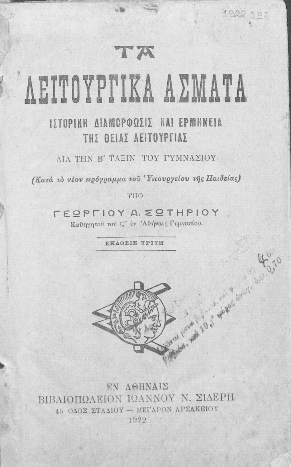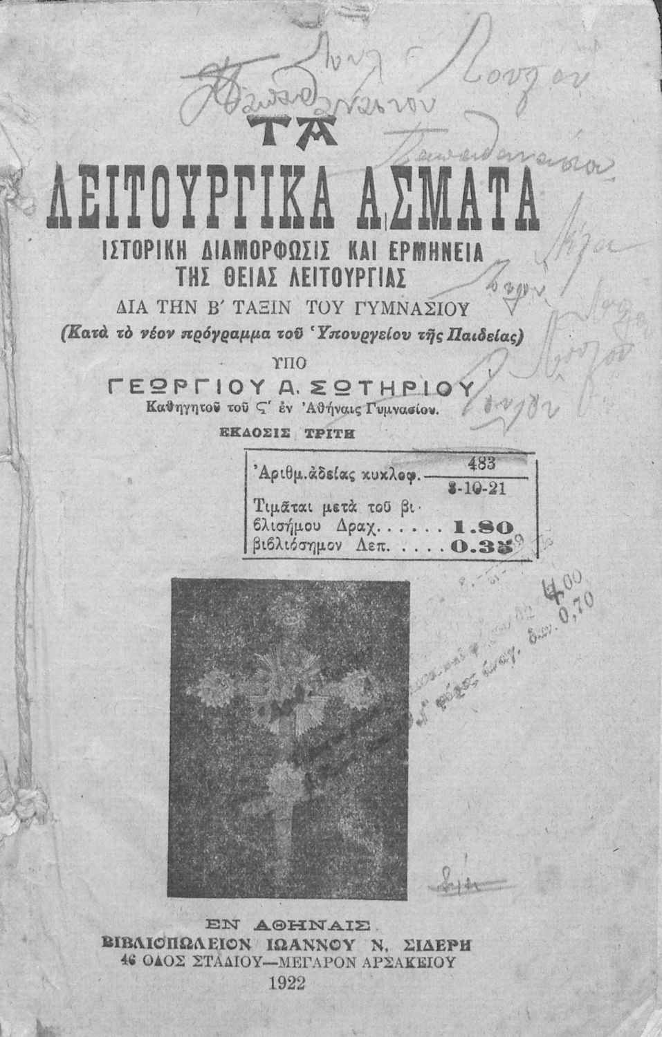 Κωδικός αναγνώρισης: 02-01940 Τίτλος: Τα λειτουργικά άσματα. Ιστορική διαμόρφωσις και ερμηνεία της Θείας Λειτουργίας δια την Β΄ τάξιν του Γυμνασίου Συγγραφέας: Γεώργιος Α. Σωτηρίου Μέγεθος και υπόστρωμα: Σχολικό εγχειρίδιο, μαλακό εξώφυλλο, 44 σελίδες. |