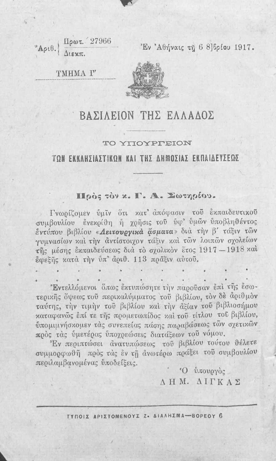 Εκδότης: Ιωάννης Ν. Σιδέρης Έτος έκδοσης: 1922 Τόπος έκδοσης: Αθήνα Έκδοση: 3η Υπουργική απόφαση / Σύμβαση: 27966/6-10-1917 |