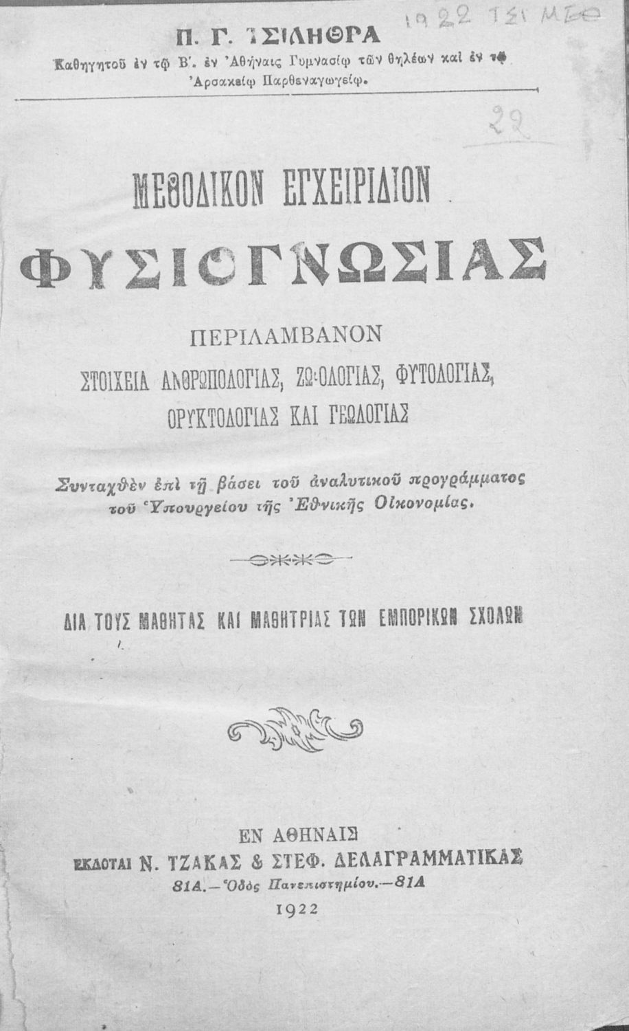 Τίτλος: Μεθοδικόν εγχειρίδιον Φυσιογνωσίας, περιλαμβάνον στοιχεία Ανθρωπολογίας, Ζωολογίας, Φυτολογίας, Ορυκτολογίας και Γεωλογίας, δια τους μαθητάς και μαθήτριας των Εμπορικών Σχολών