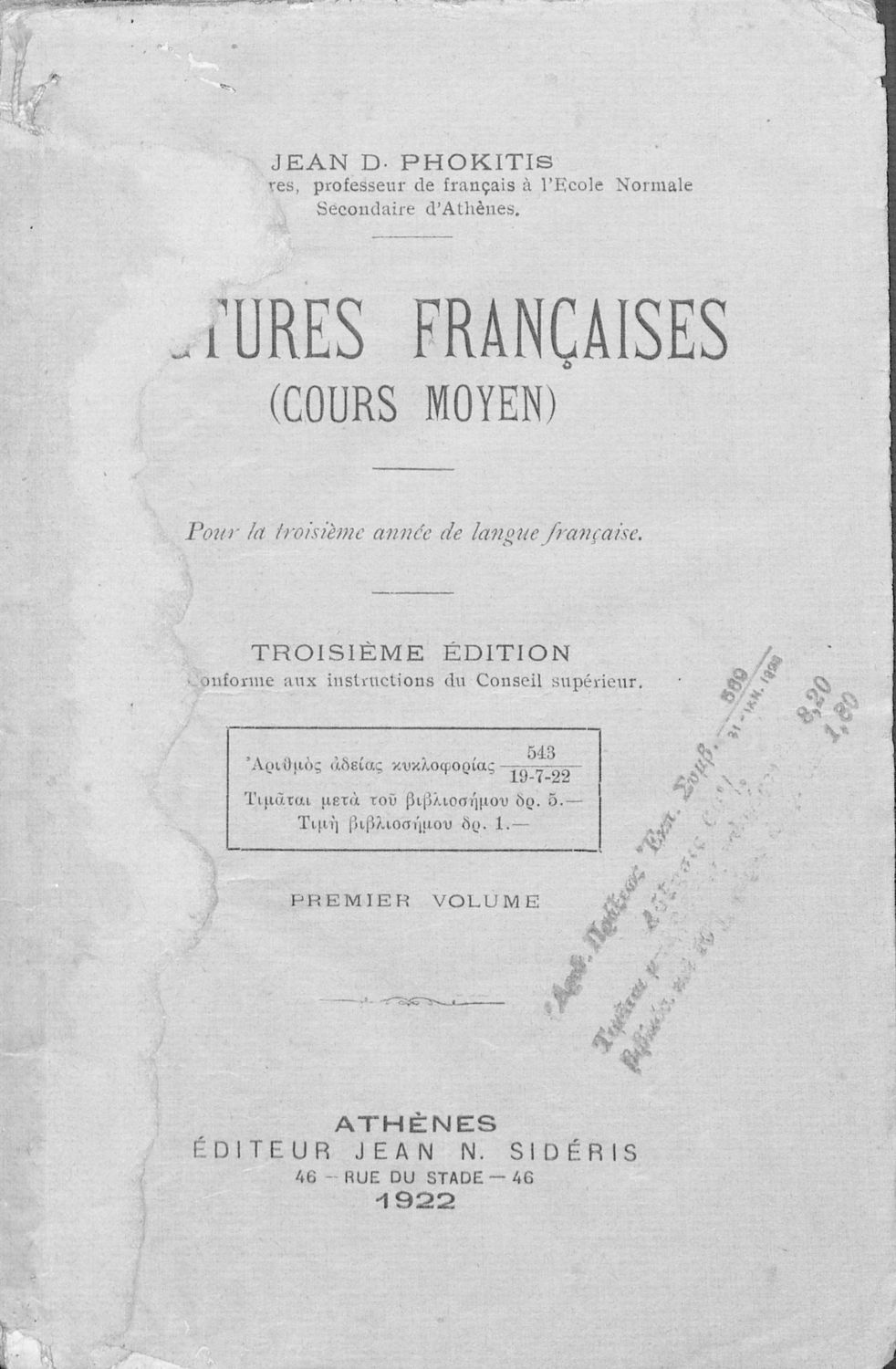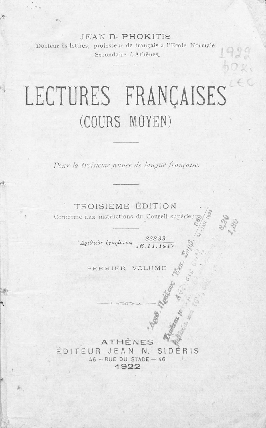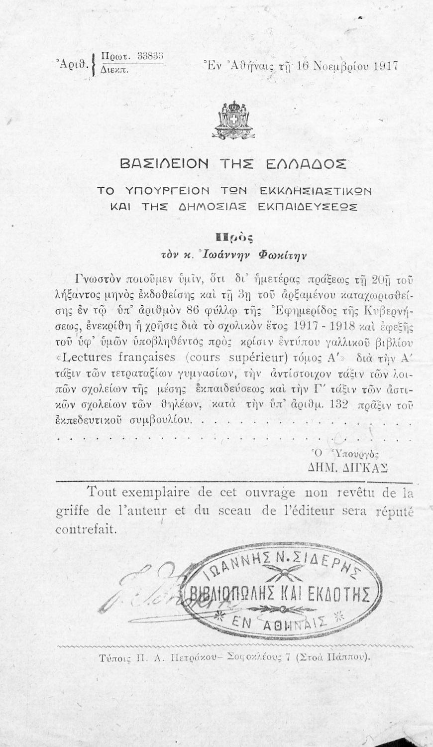 Εκδότης: Ιωάννης Ν. Σιδέρης Έτος έκδοσης: 1922 Τόπος έκδοσης: Αθήνα Έκδοση: 1η Υπουργική απόφαση / Σύμβαση: 33833/16-11-1917 |