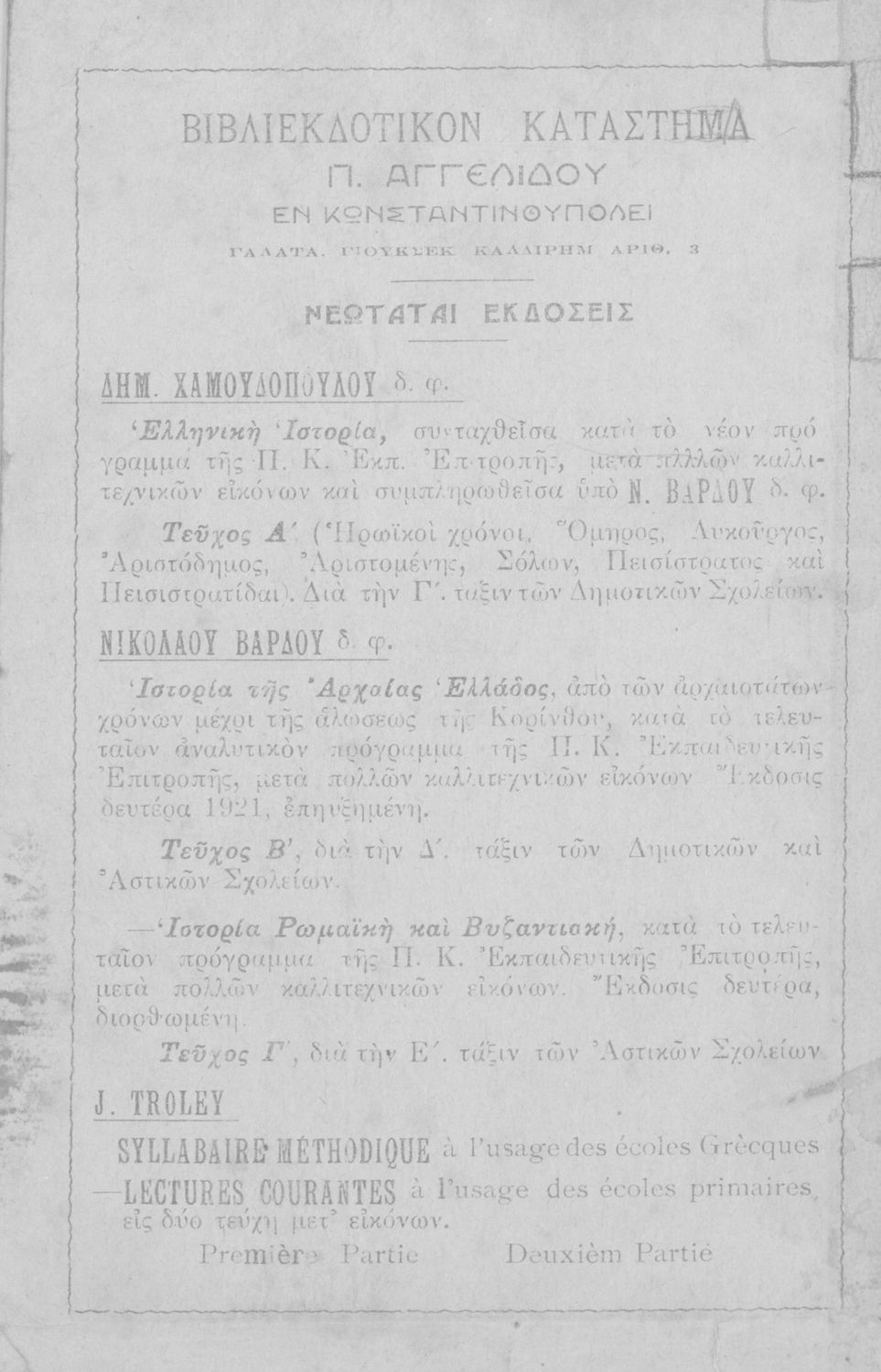 Τίτλος: Ιστορία ρωμαϊκή και βυζαντιακή δια την Ε΄ τάξιν των Αστικών Σχολείων αμφοτέρων των φύλων, τεύχος Γ΄ κατά το τελευταίον αναλυτικόν πρόγραμμα της πατριαρχικής κεντρικής εκπαιδευτικής επιτροπής