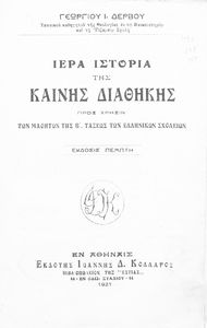 Κωδικός αναγνώρισης: 02-01955 Τίτλος: Ιερά ιστορία της Καινής Διαθήκης προς χρήσιν των μαθητών της Β΄ τάξεως των Ελληνικών Σχολείων Συγγραφέας: Γεώργιος Ι. Δέρβος Μέγεθος και υπόστρωμα: Σχολικό εγχειρίδιο, μαλακό εξώφυλλο, 104 σελίδες. Εικόνες (ασπρόμαυρες), σκίτσα (ασπρόμαυρα). |