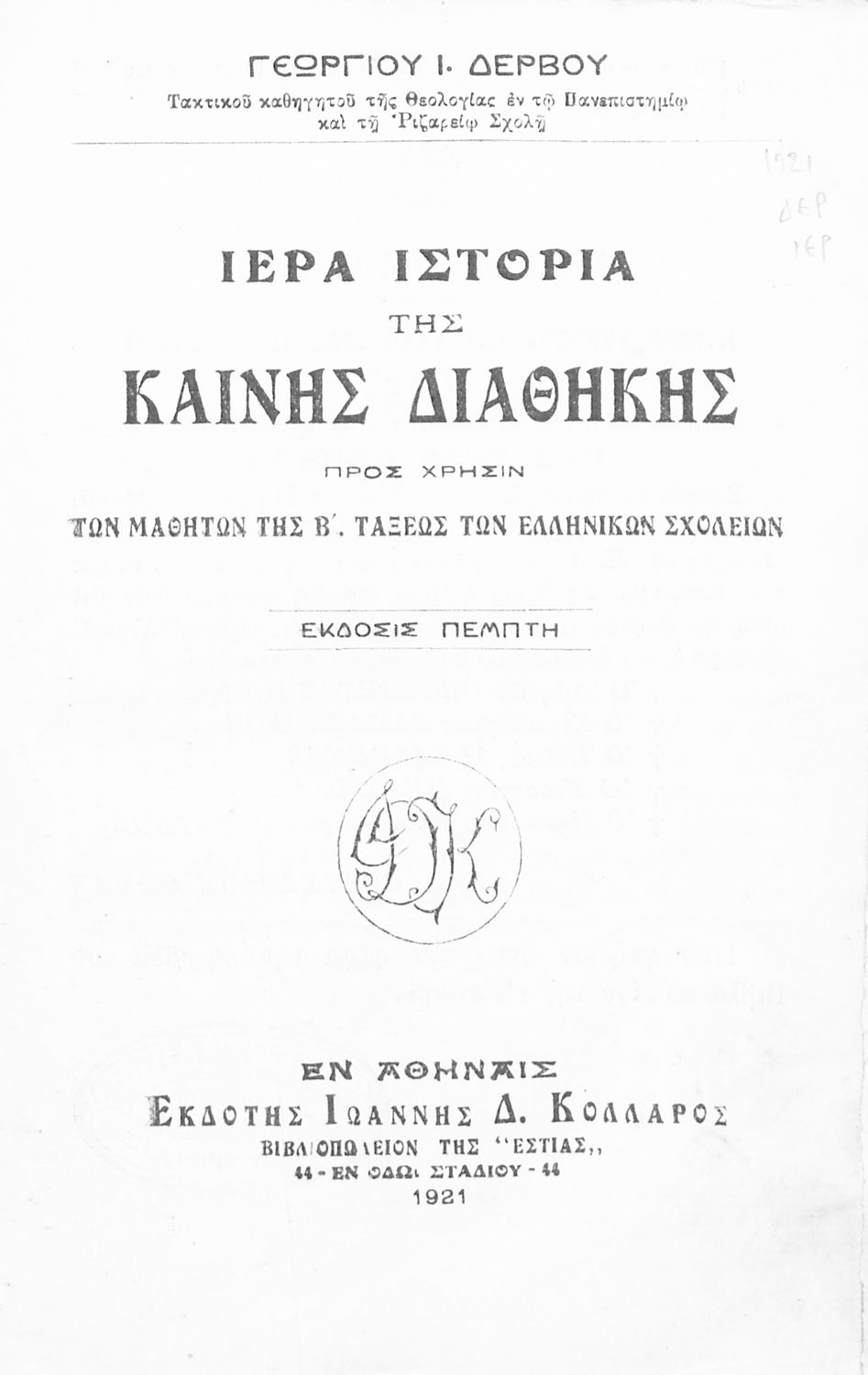Εντοπισμός πρωτοτύπου: Ελληνικό Λογοτεχνικό και Ιστορικό Αρχείο Κωδικός βιβλιοθήκης: 1921 ΔΕΡ ΙΕΡ |