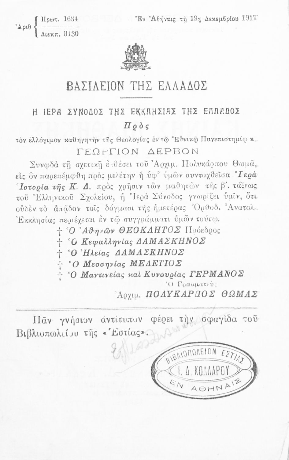 Εκδότης: Ιωάννης Δ. Κολλάρος Έτος έκδοσης: 1921 Τόπος έκδοσης: Αθήνα Έκδοση: 5η Υπουργική απόφαση / Σύμβαση: 1634/19-12-1917 |