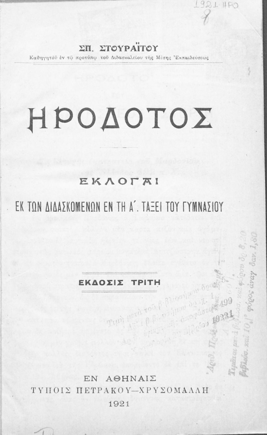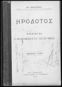 Κωδικός αναγνώρισης: 02-01958 Τίτλος: Ηροδότου Εκλογαί εκ των διδασκομένων εν τη Α΄ τάξει του γυμνασίου Συγγραφέας: Ηρόδοτος, Σπυρίδων Στουραΐτης (σχόλια) Μέγεθος και υπόστρωμα: Σχολικό εγχειρίδιο, σκληρό εξώφυλλο, 137 σελίδες. Εικόνες (ασπρόμαυρες), σκίτσα (ασπρόμαυρα), σχεδιαγράμματα (ασπρόμαυρα), χάρτες (ασπρόμαυροι). |