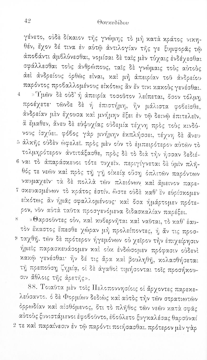 Σχολικό εγχειρίδιο Αρχαίων Ελληνικών Β΄ και Γ΄ Γυμνασίου που περιέχει αποσπάσματα από το έργο του Θουκυδίδη Ιστορία, και ερμηνευτικές και πραγματολογικές παρατηρήσεις.