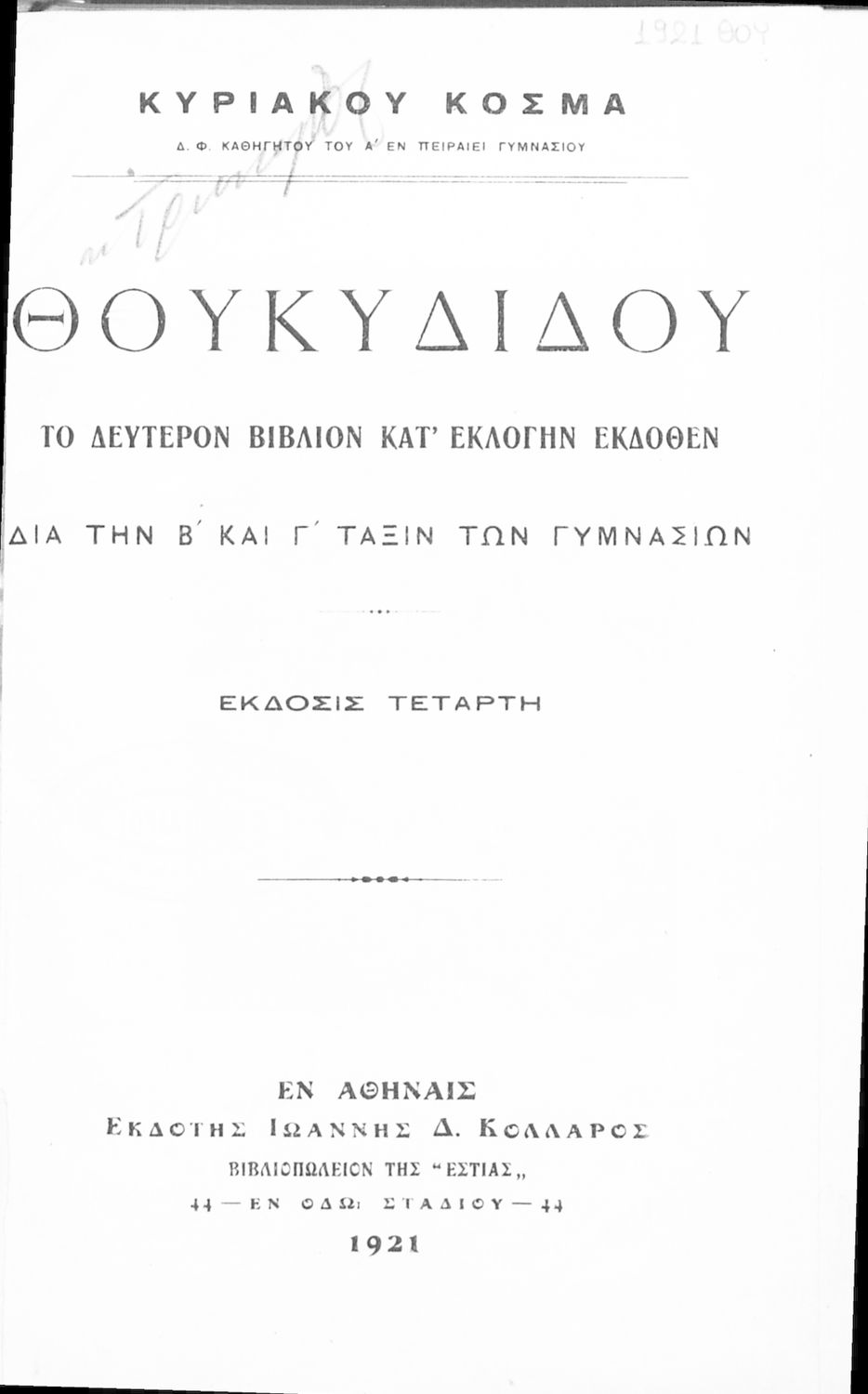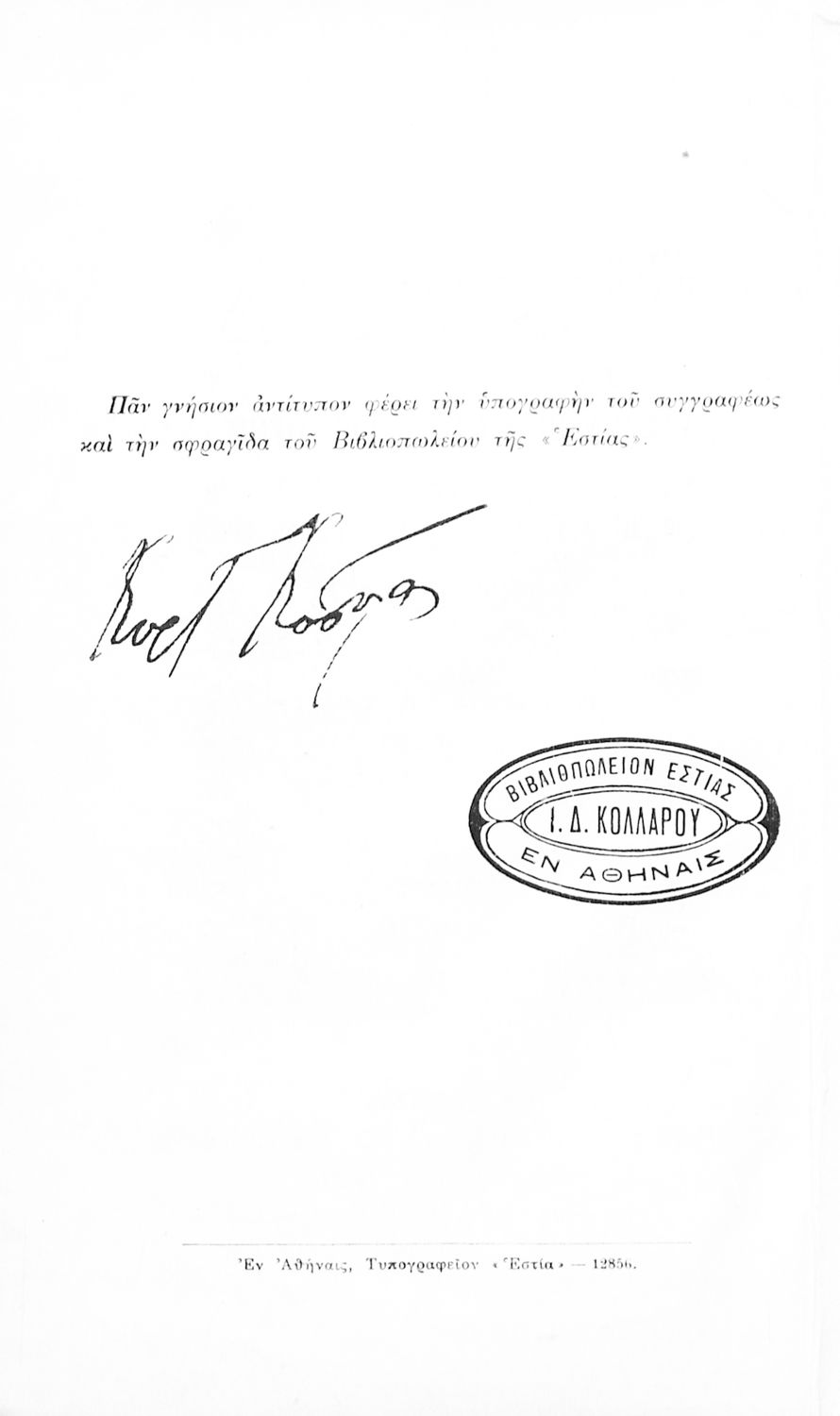 Εκδότης: Ιωάννης Δ. Κολλάρος Έτος έκδοσης: 1921 Τόπος έκδοσης: Αθήνα Έκδοση: 4η |