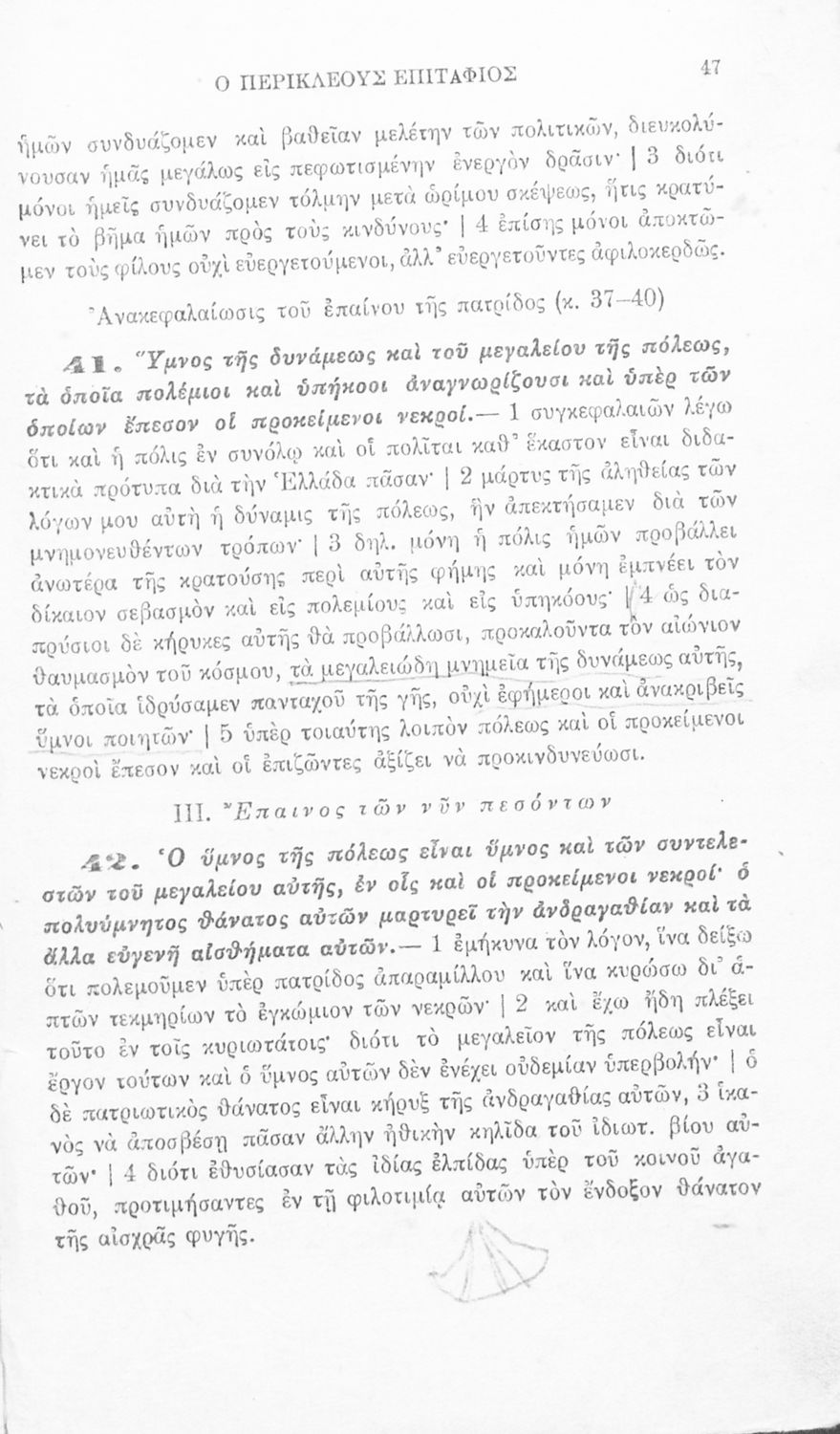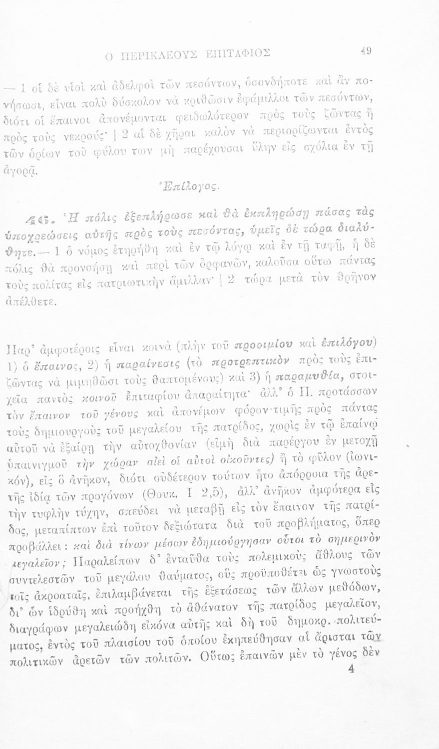 Μαθητικό βοήθημα Αρχαίων Ελληνικών που περιέχει μετάφραση του Επιτάφιου του Περικλή, ερμηνευτικά και πραγματολογικά σχόλια και λεξιλογικές παρατηρήσεις.