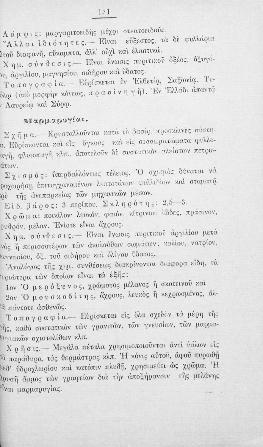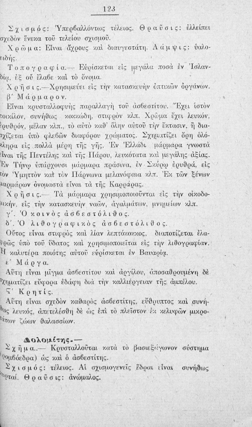 LDR 01310 2200205 4500 035 ## _a02-01965 040 ## _aΕλληνικό Λογοτεχνικό και Ιστορικό Αρχείο 041 ## _ael 100 ## _aΚ. Καλεμικέρης _aΕυ. Τζολάκης 110 ## _a1921 ΚΑΛ 245 0# _aΓεωλογία και Ορυκτολογία, προς χρήσιν της Β΄ τάξεως των Γυμνασίων 260 ## _aΑθήνα _bΜιχαήλ Ι. Σαλίβερος _c1921 300 ## _a152 _bΕικόνες (ασπρόμαυρες), Σκίτσα (ασπρόμαυρα), Χάρτες (ασπρόμαυροι) 520 ## _aΣχολικό εγχειρίδιο Γεωλογίας/Ορυκτολογίας Β΄ Γυμνασίου που εστιάζει στη δυναμική και ιστορική γεωλογία (παλαιοντολογία) και στις διακρίσεις μεταξύ των ορυκτών. 521 ## _aΒ' Γυμνασίου 522 ## _aΕλλάδα 546 ## _aΑπλή καθαρεύουσα 563 ## _aΣκληρό Εξώφυλλο 583 ## _a3139/6-9-1921 _c1921 650 #4 _aΑκτές _aΑτμόσφαιρα _aΔιάβρωση _aΗφαίστεια _aΜέταλλα _aΟρυκτά _aΠάγος _aΠετρέλαιο _aΠετρώματα _aΣεισμοί _aΎδατα
